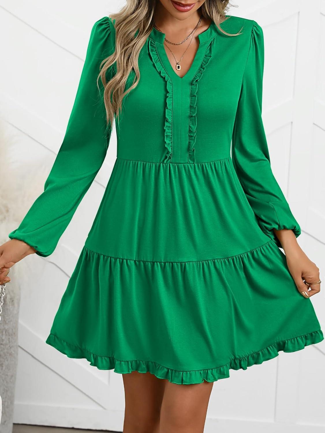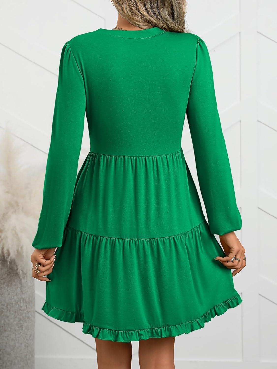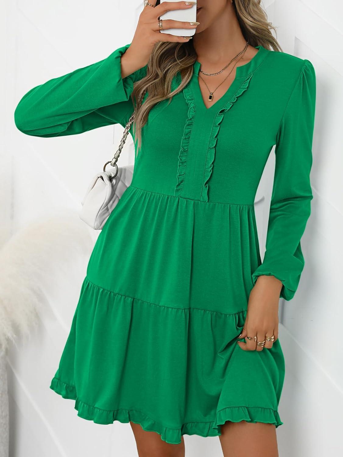 ANRABESS Womens Long Sleeve Dress 2025 Fall Casual V Neck Tiered Flowy Swing Short Mini Dresses Beach Travel Vacation Outfits(Green)