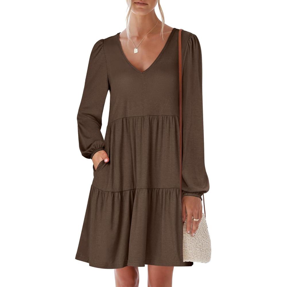 imageANRABESS Womens Long Sleeve Dress 2026 Fall Casual V Neck Tiered Flowy Short Dresses Spring Beach Travel Vacation ClothesCoffee