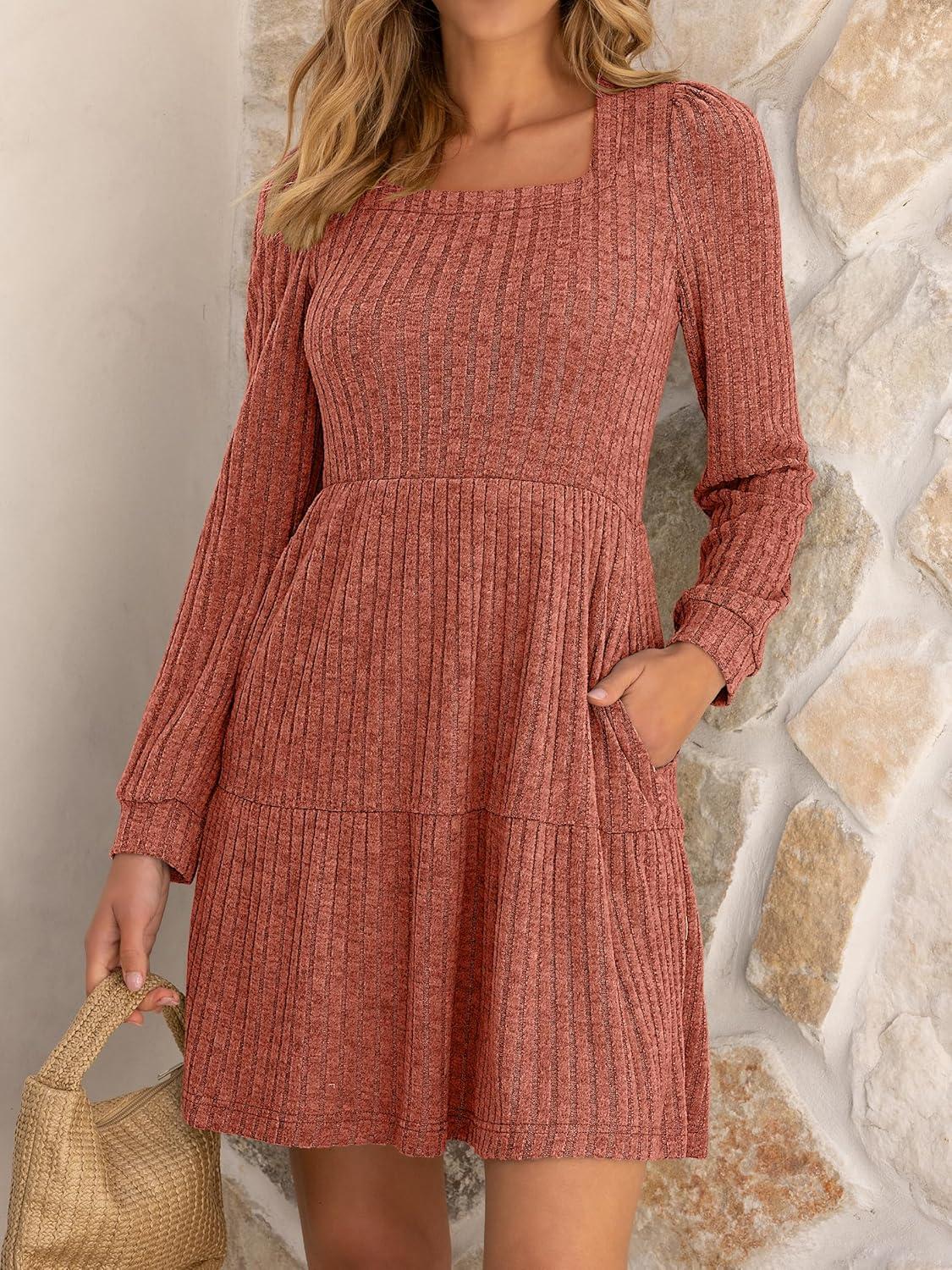ANRABESS Women's Long Sleeve Fall Dress 2025 Square Neck Casual Ribbed Knit Comfy Soft Short Sweater Dresses with Pockets(Burnt Orange)