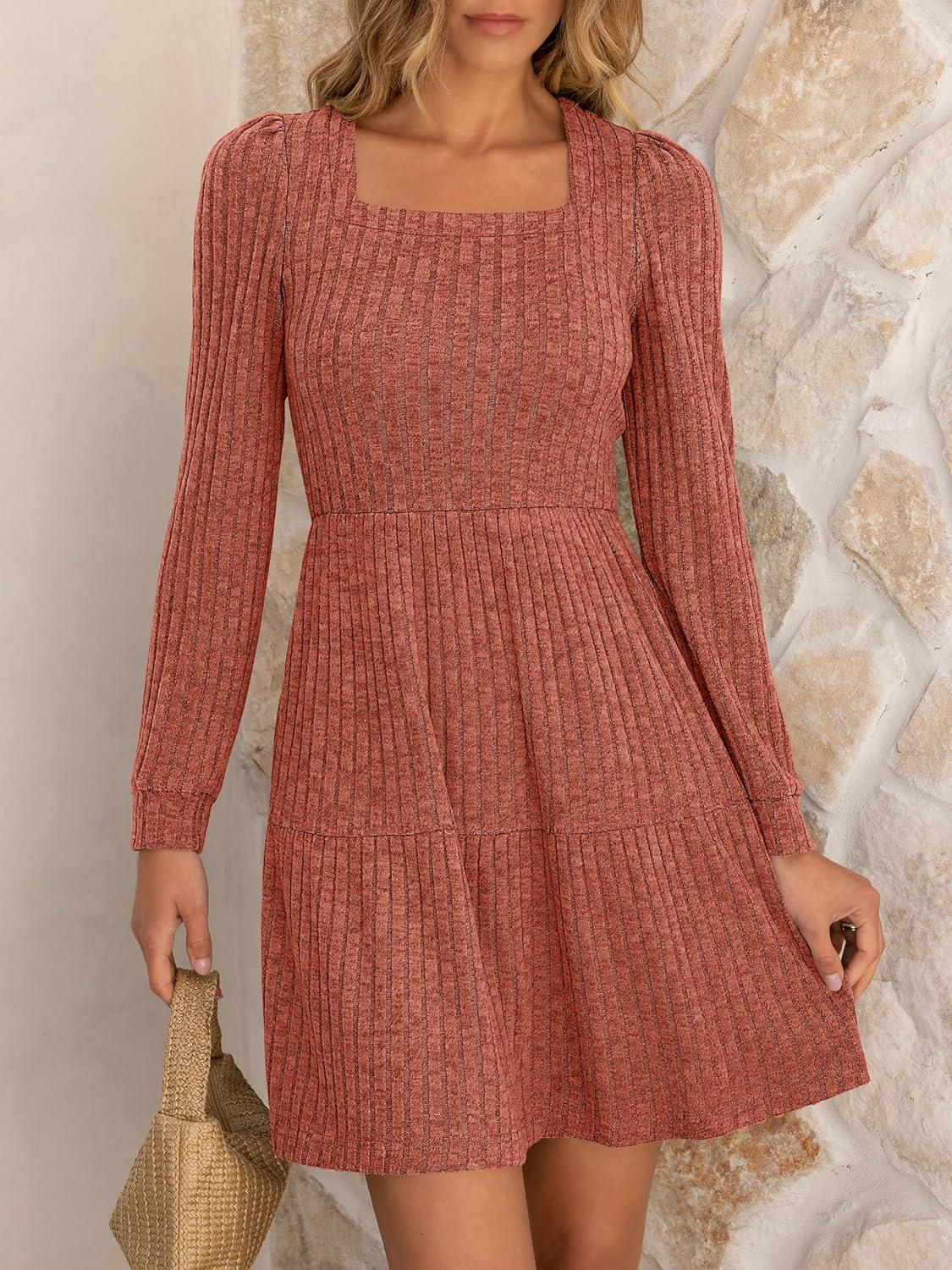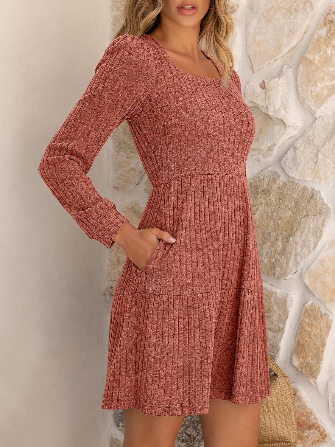 imageANRABESS Womens Long Sleeve Fall Dress 2025 Square Neck Casual Ribbed Knit Comfy Soft Short Sweater Dresses with PocketsBurnt Orange