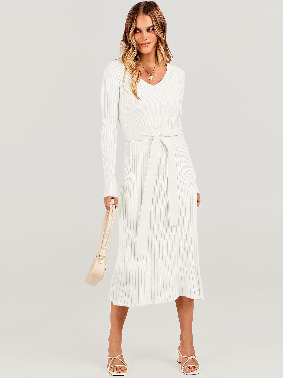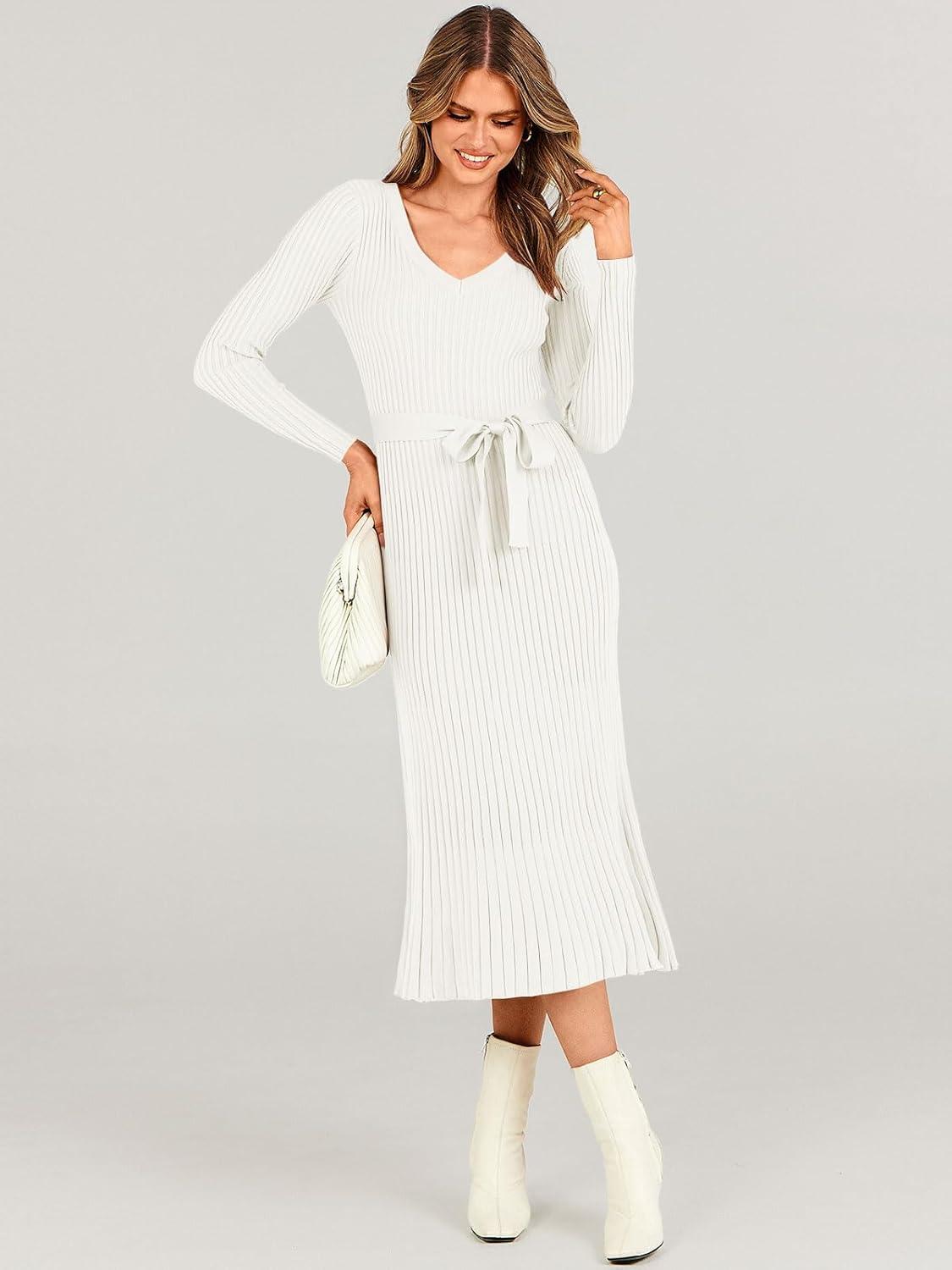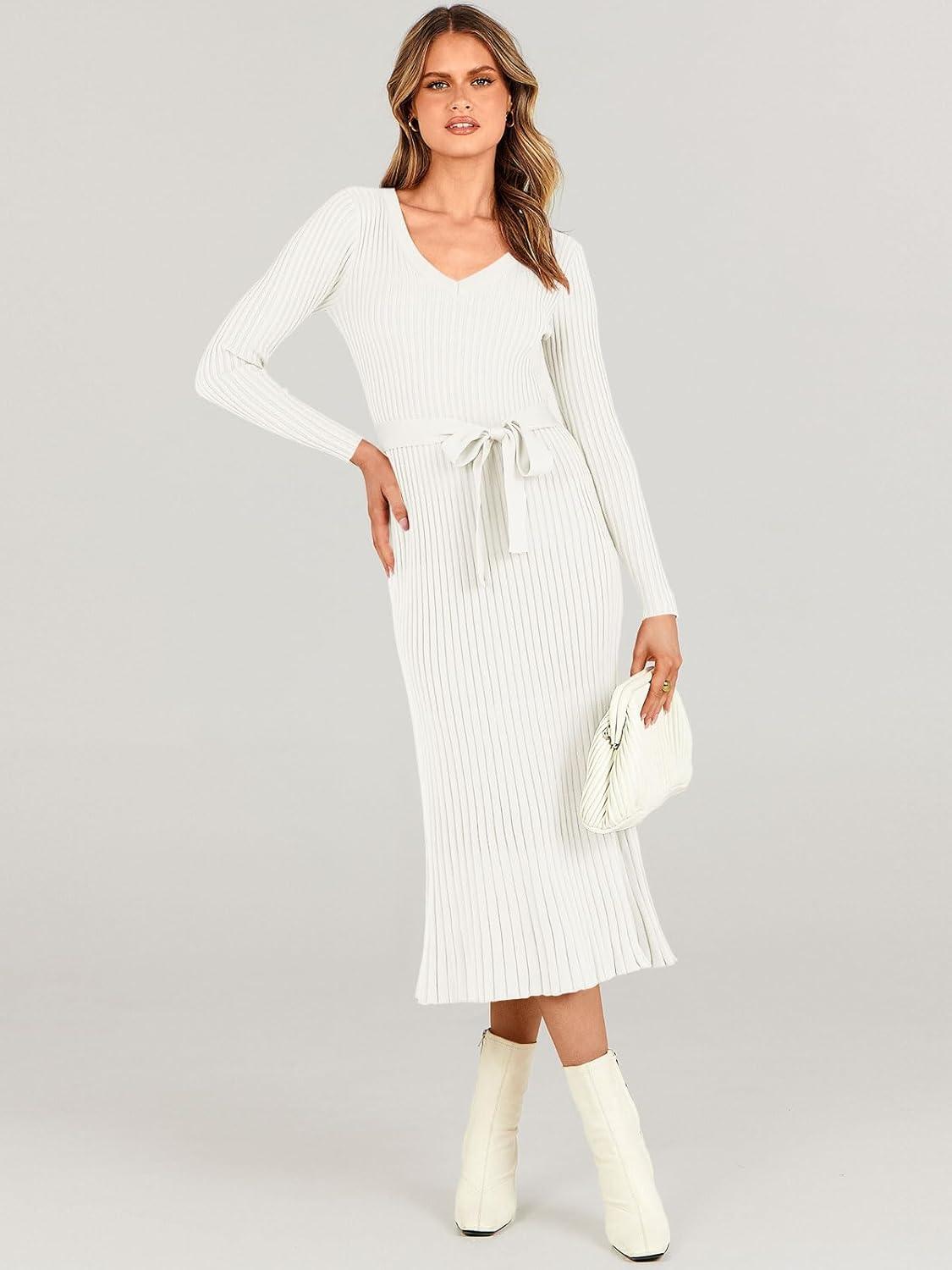Womens Sweater Dress Long Sleeve Knitted V Neck Tie Waist Sexy Fitted Cute Comfy Holiday Wedding Guest 2024 Fall Fashion Clothes Winter Outfits Bodycon Midi Ribbed Sweater Dress with Belt
