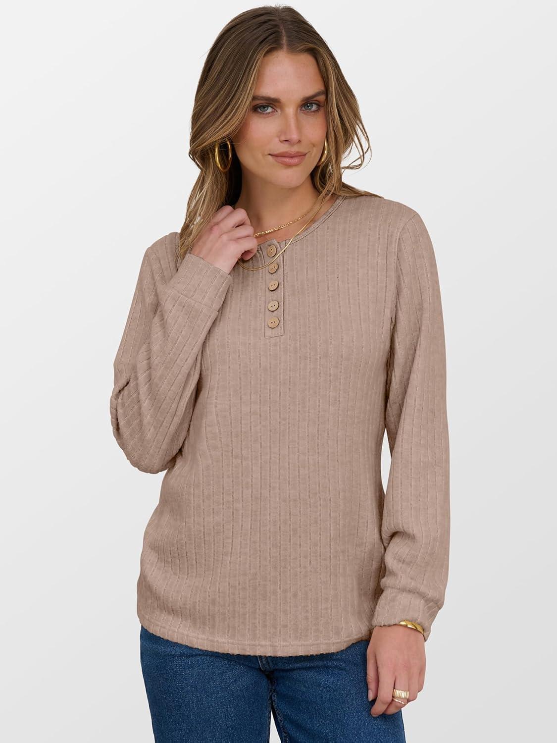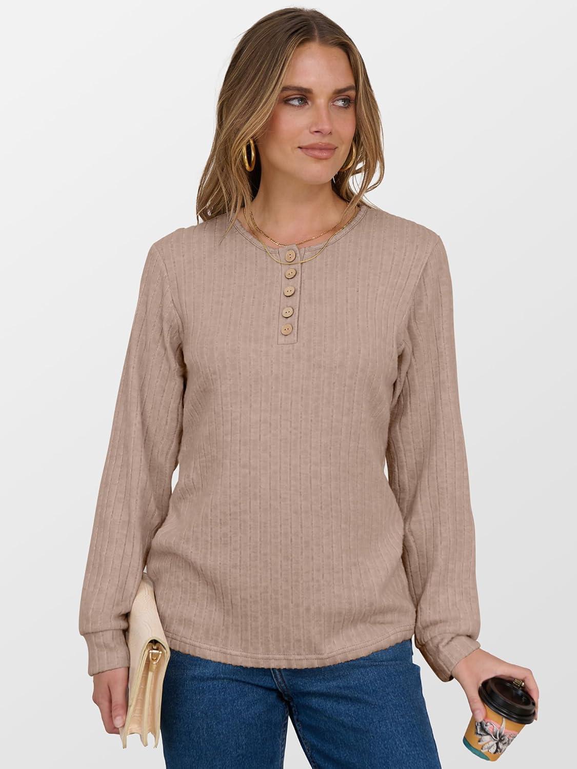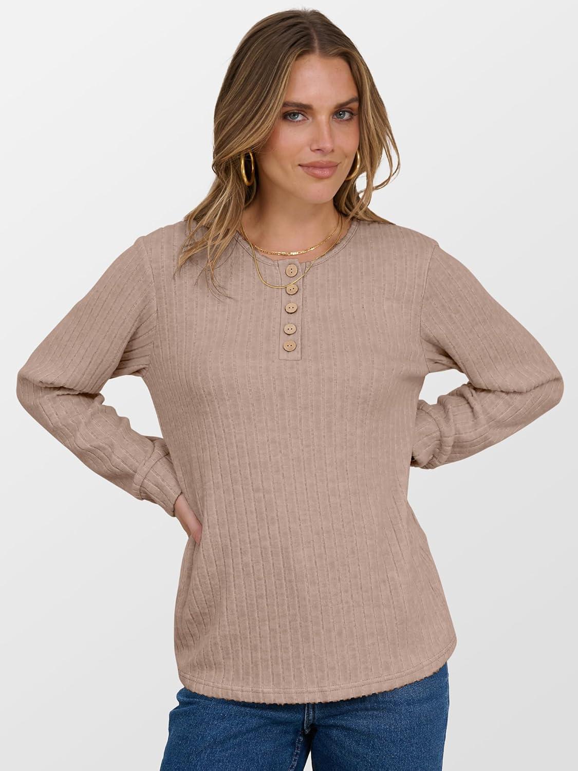 imageANRABESS Womens Long Sleeve Henley Shirts Button Down Tunic Tops Fall Lightweight Sweaters Business Casual Blouses 2025Tan