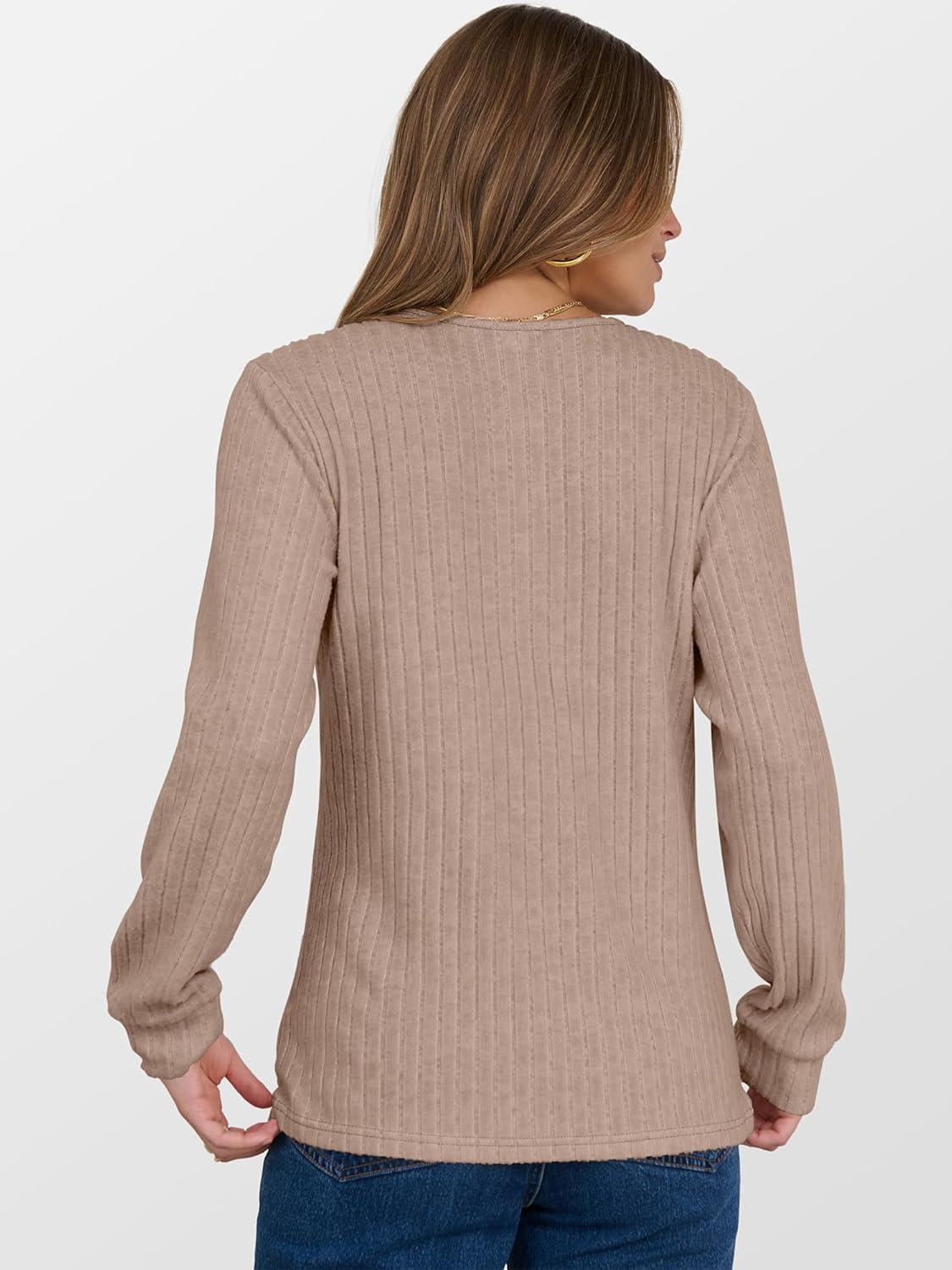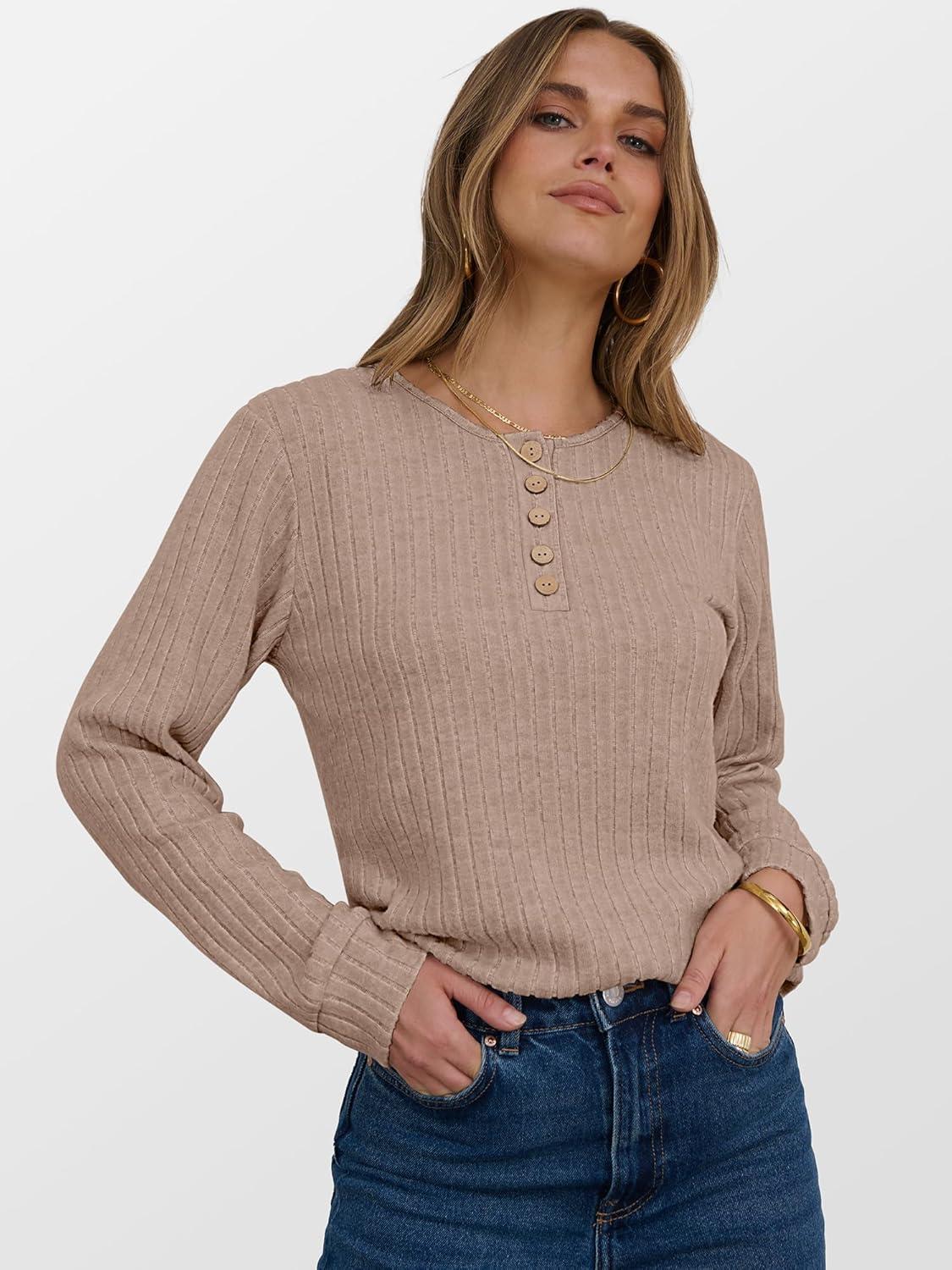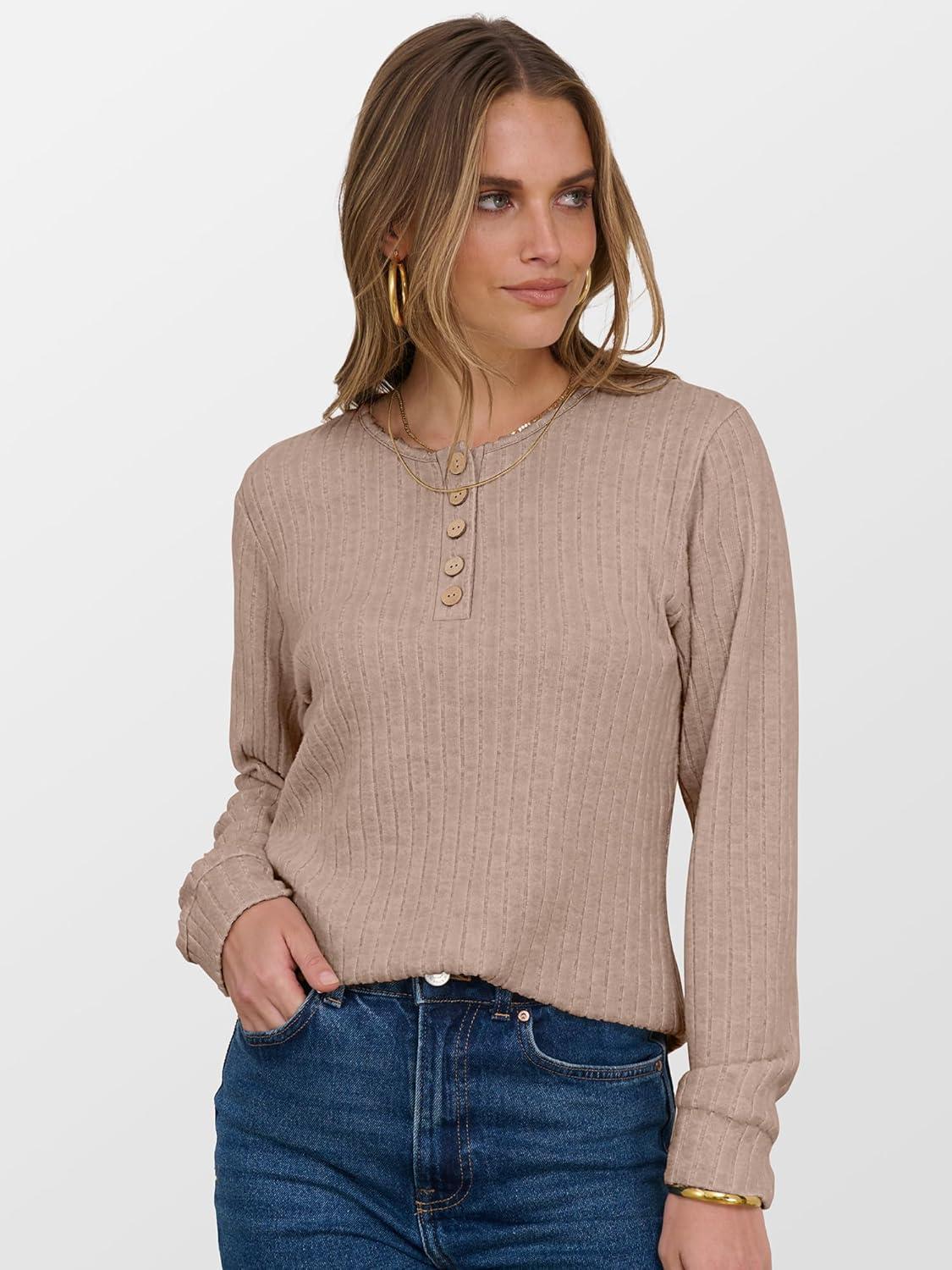 imageANRABESS Womens Long Sleeve Henley Shirts Button Down Tunic Tops Fall Lightweight Sweaters Business Casual Blouses 2025Tan