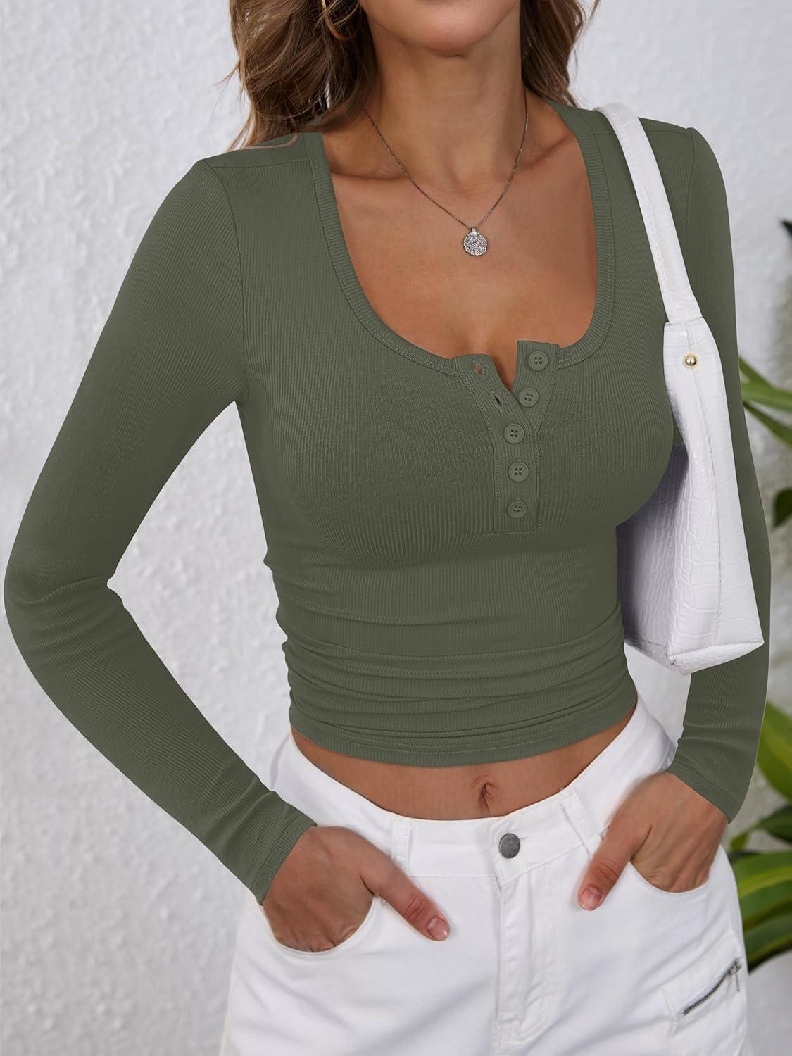 ANRABESS Women’s Long Sleeve Henley Tops Ribbed Knit Slim Fitted Trendy T Shirt Basic Tees Layer 2025 Fall Fashion Outfits(Army Green)