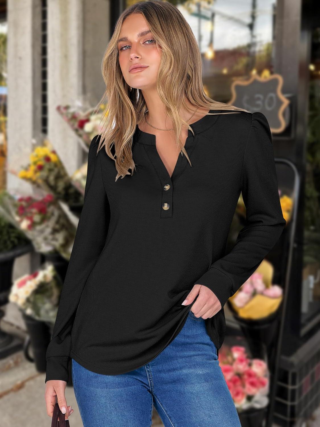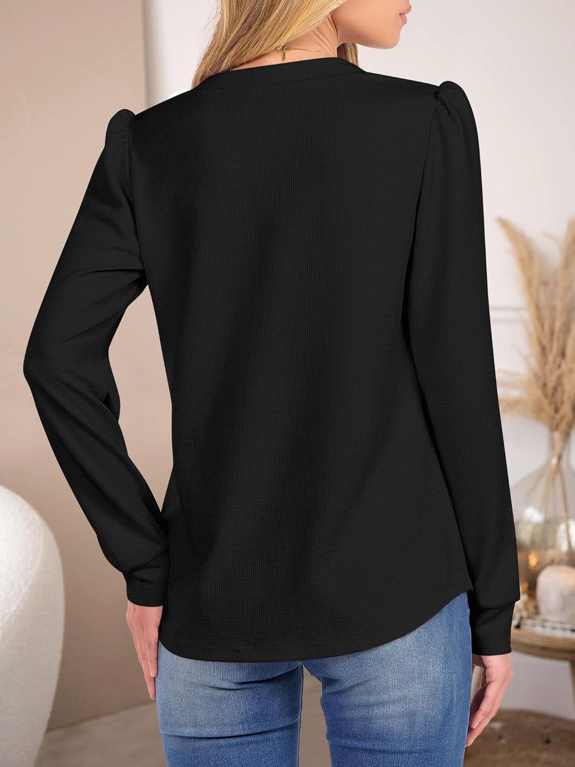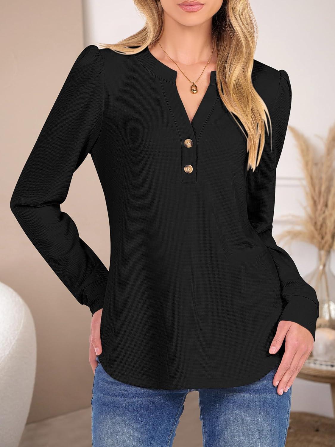 ANRABESS Women's Long Sleeve Henley Tops Waffle Knit Tunics Shirts Dressy Casual Blouses Cute T-Shirts 2025 Fall Outfit(Black)