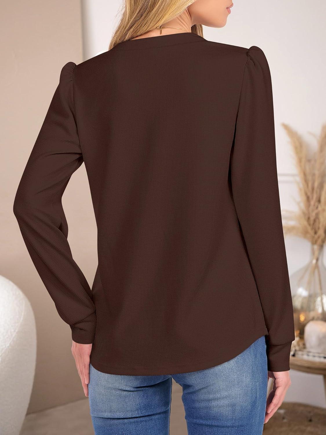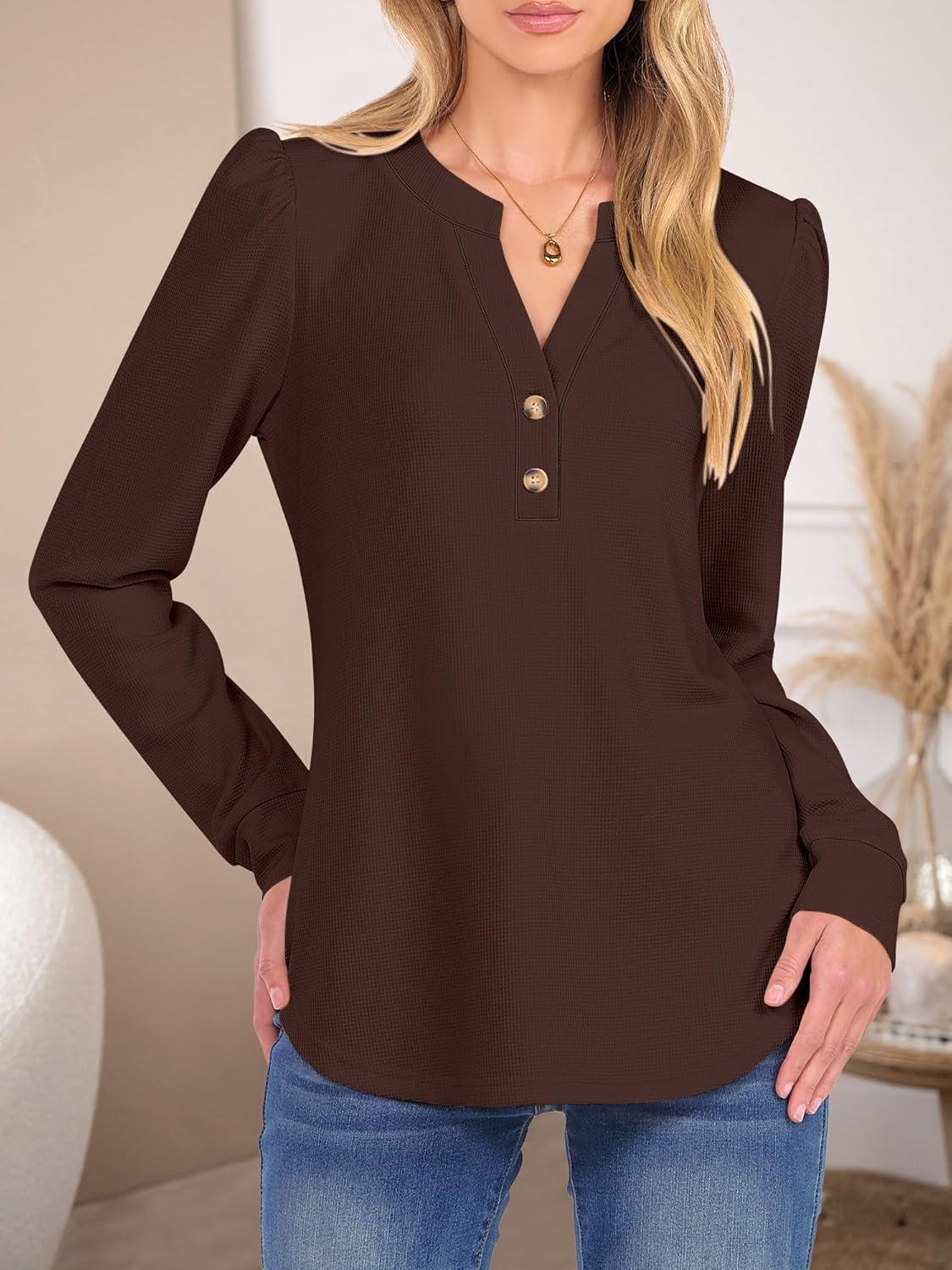ANRABESS Women's Long Sleeve Henley Tops Waffle Knit Tunics Shirts Dressy Casual Blouses Cute T-Shirts 2025 Fall Outfit(Red Brown)