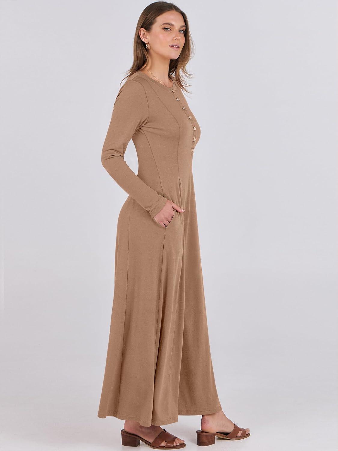 ANRABESS Women’s Long Sleeve Maxi Dress 2025 Fall Casual Button Fit & Flare A-Line Swing Flowy Long Dresses Trendy Outfits(Khaki)