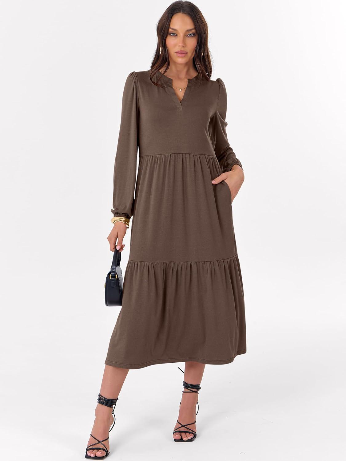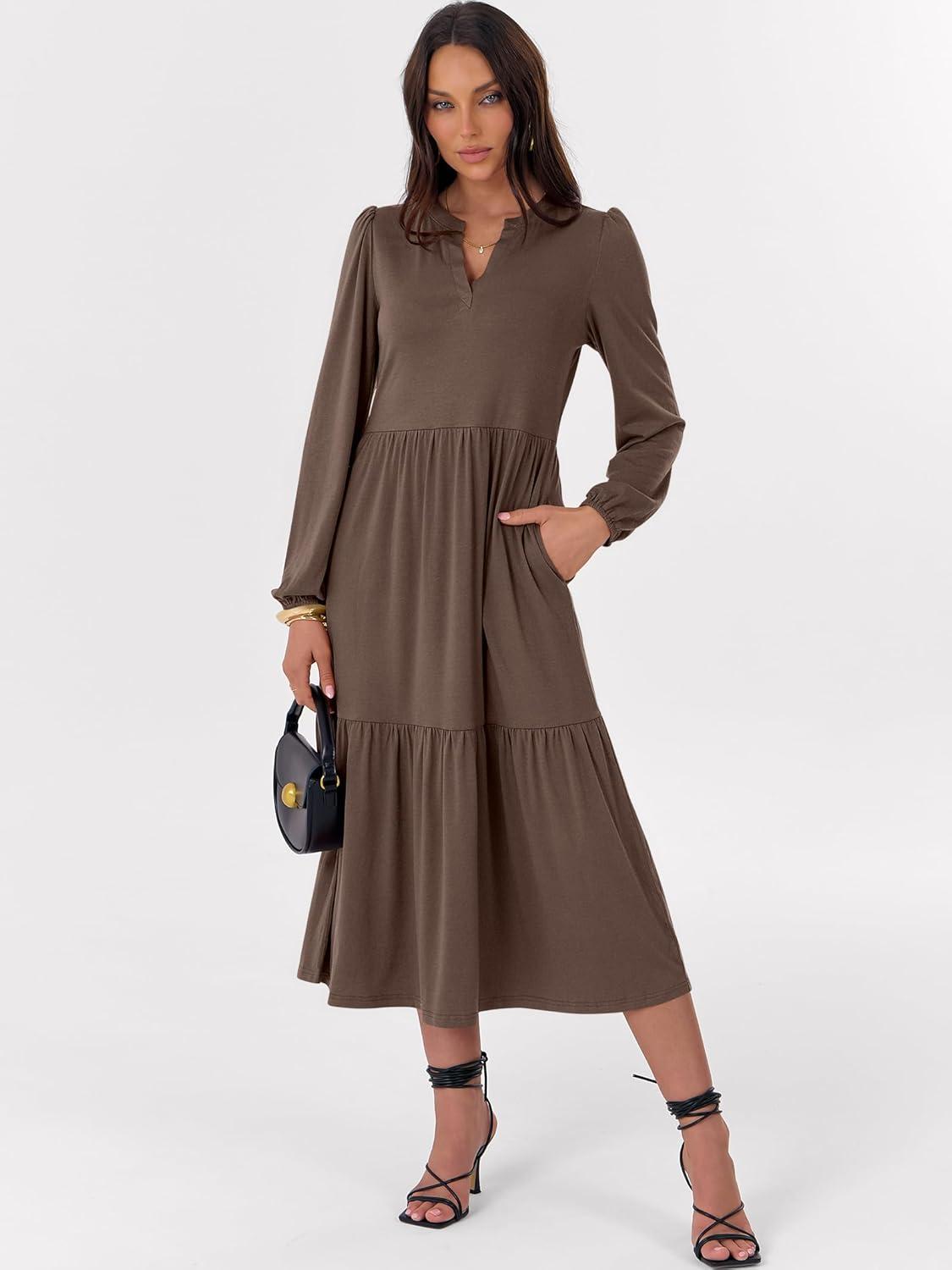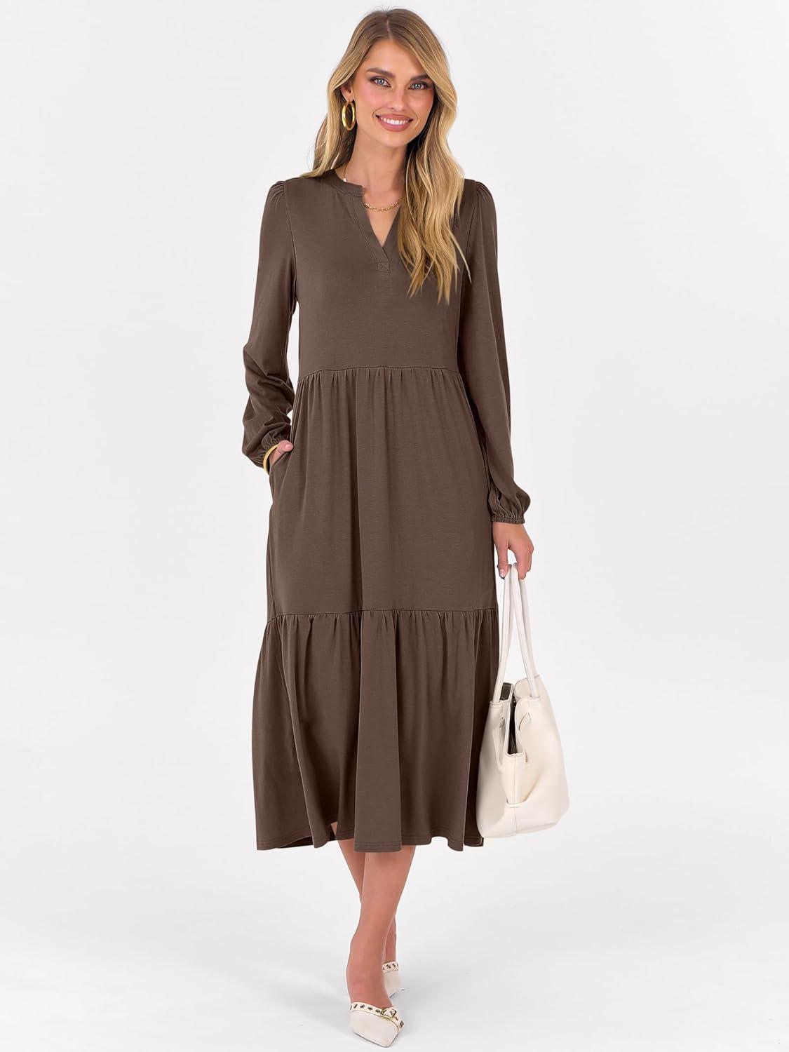 ANRABESS Women’s Long Sleeve Maxi Dresses 2025 Fall Casual V Neck Flowy Tiered Boho Modest Trendy Vacation Dress with Pockets(Brown)
