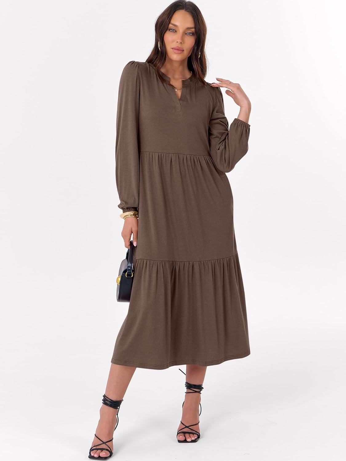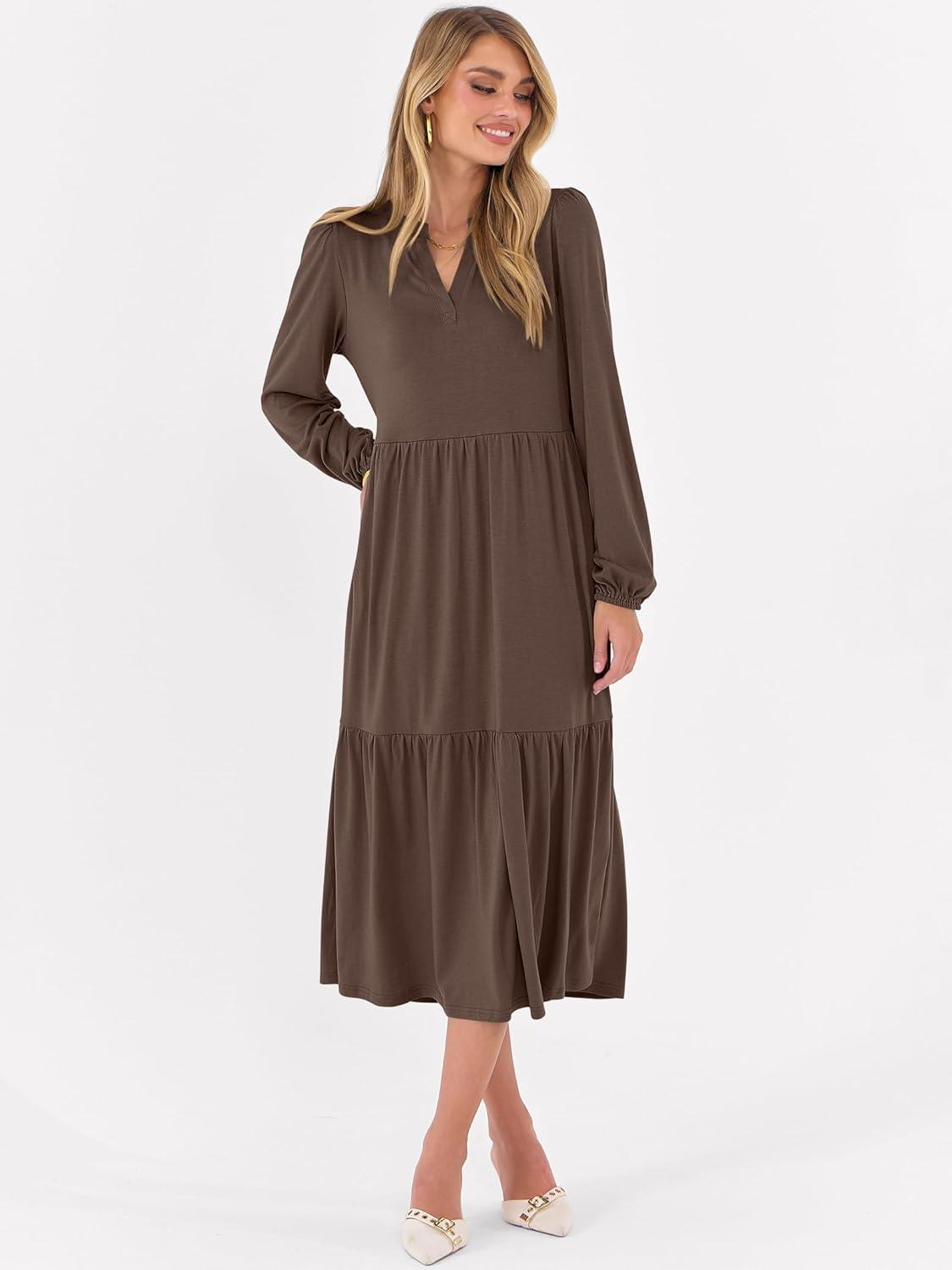 ANRABESS Women's Long Sleeve Maxi Dresses 2025 Fall Casual V Neck Flowy Tiered Boho Modest Trendy Vacation Dress with Pockets(Brown)