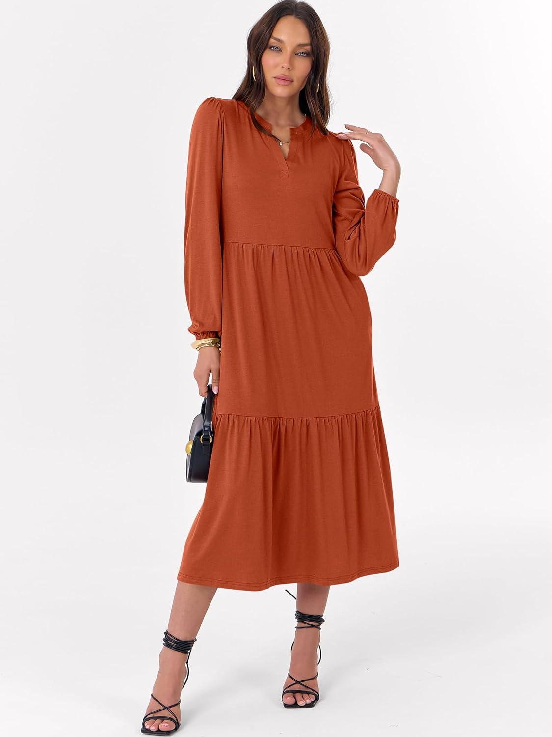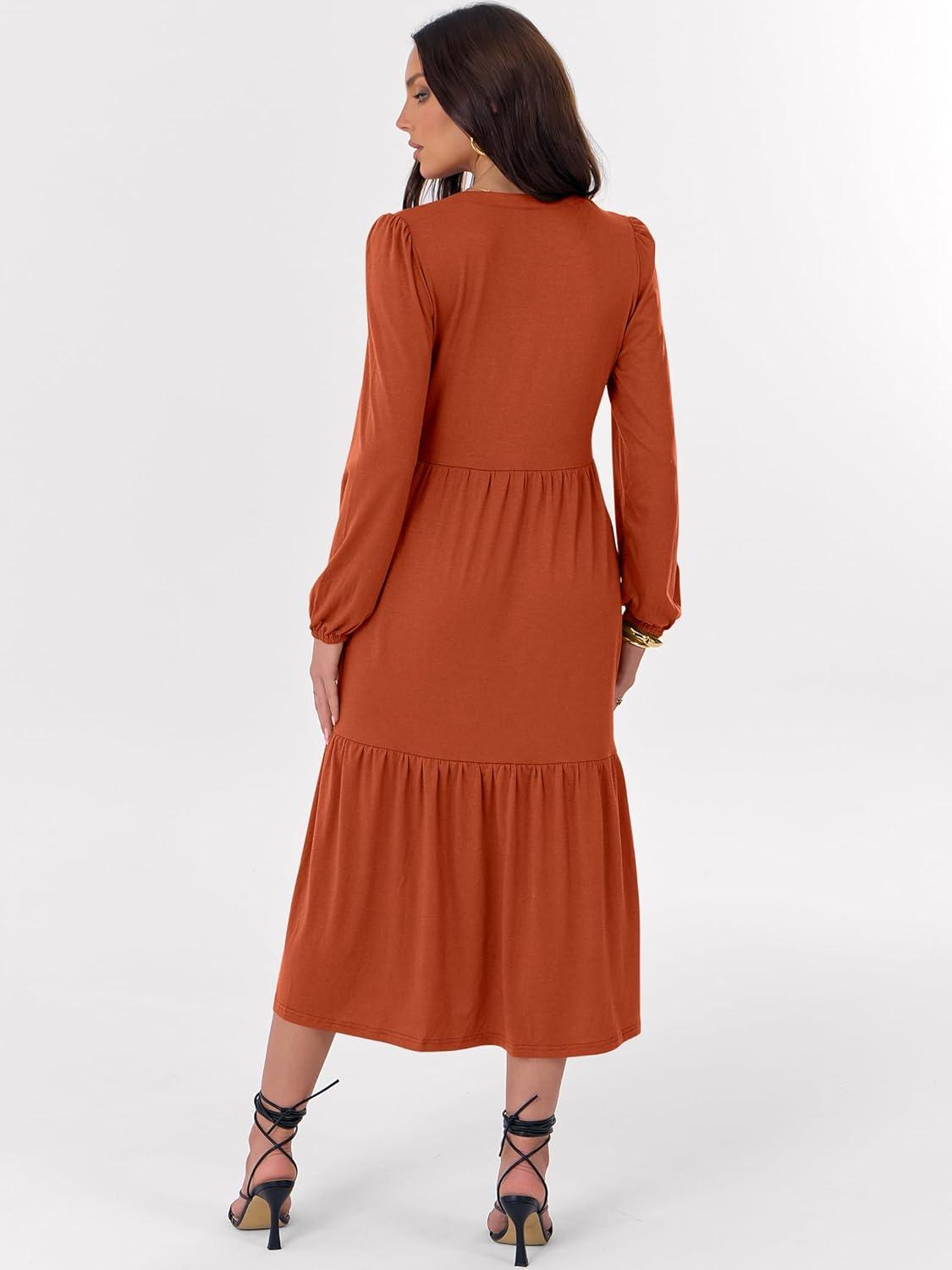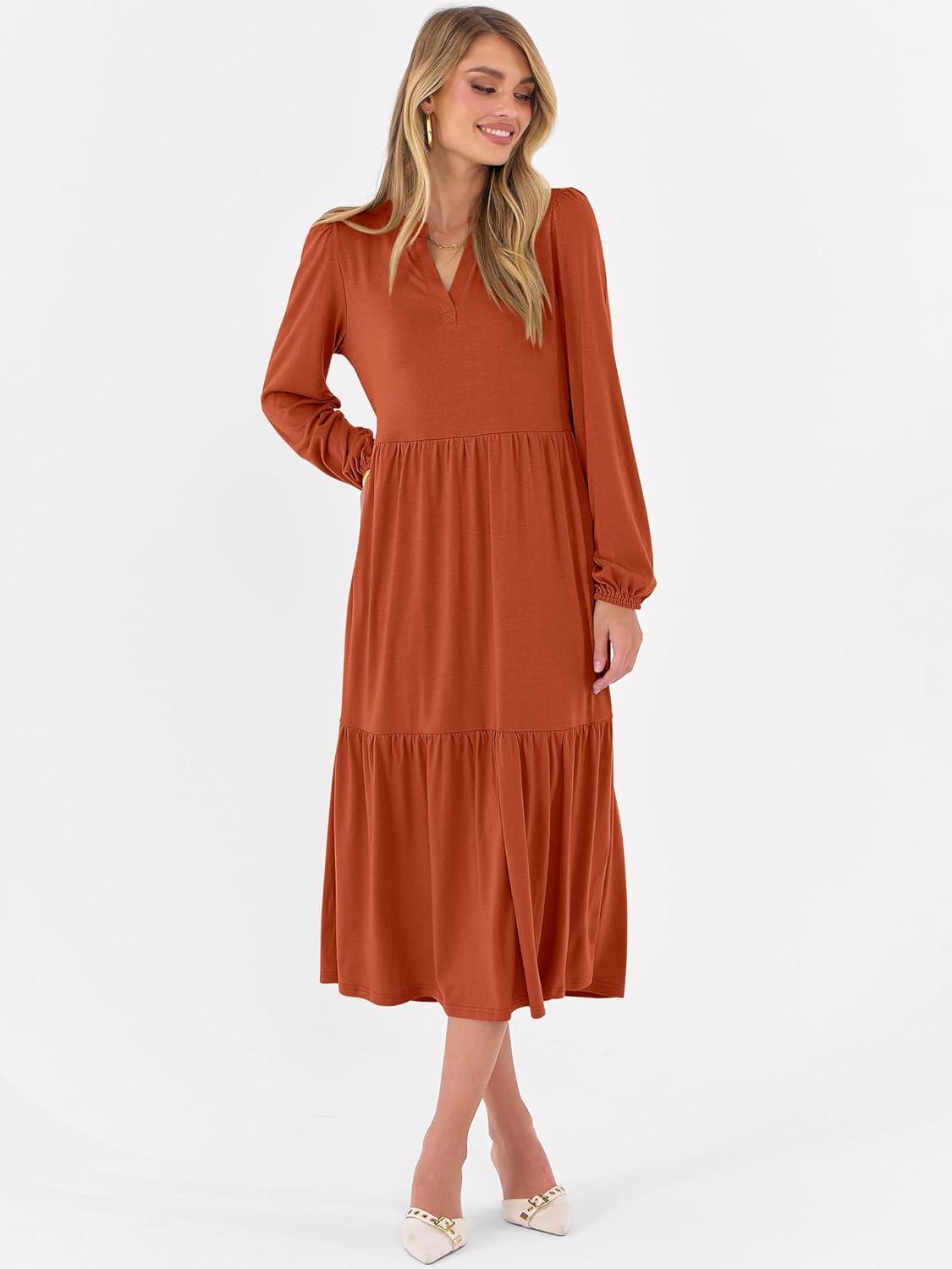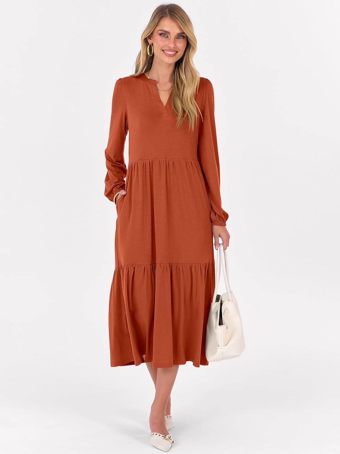 imageANRABESS Womens Long Sleeve Maxi Dresses 2025 Fall Casual V Neck Flowy Tiered Boho Modest Trendy Vacation Dress with PocketsRust Red