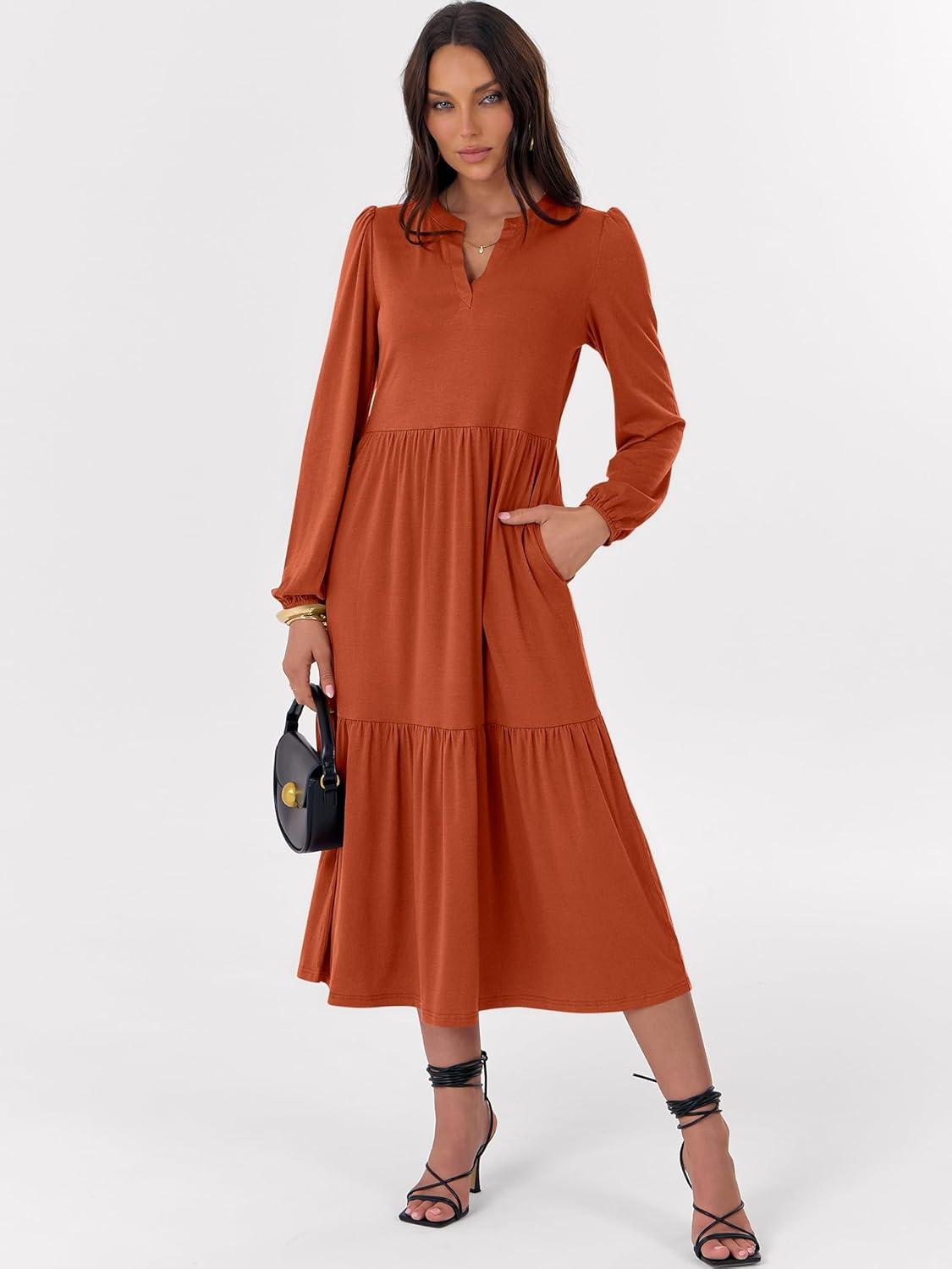 ANRABESS Women’s Long Sleeve Maxi Dresses 2025 Fall Casual V Neck Flowy Tiered Boho Modest Trendy Vacation Dress with Pockets(Rust Red)