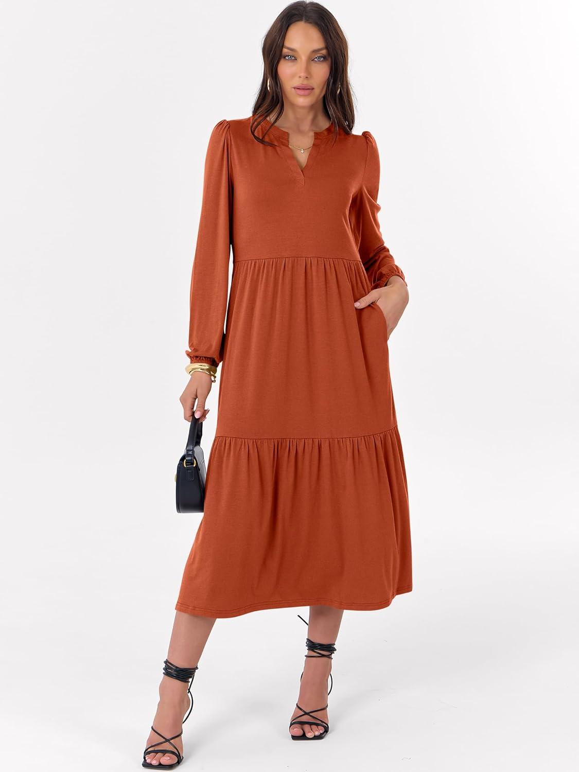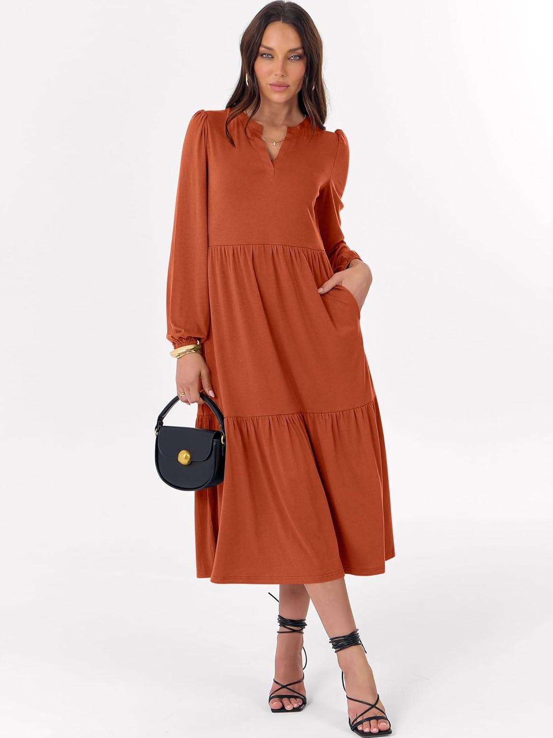 ANRABESS Women's Long Sleeve Maxi Dresses 2025 Fall Casual V Neck Flowy Tiered Boho Modest Trendy Vacation Dress with Pockets(Rust Red)