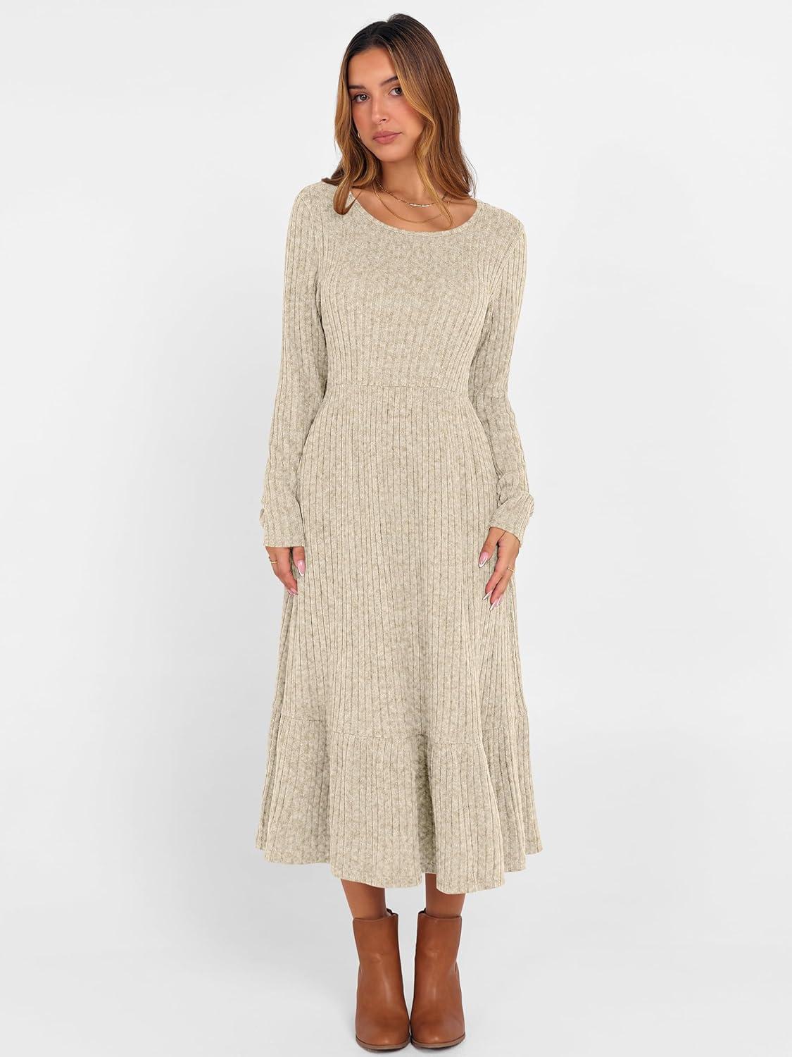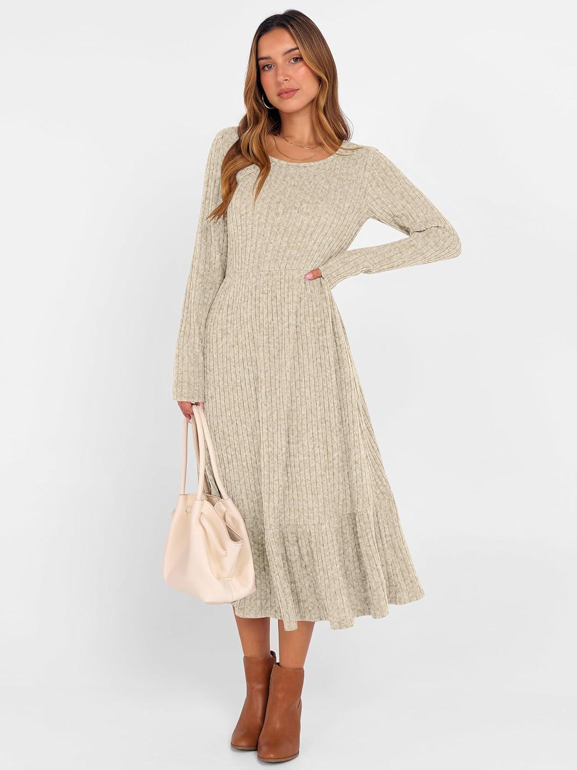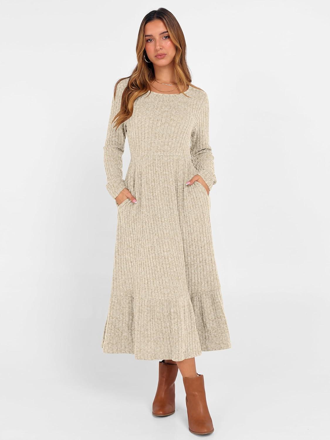 ANRABESS Womens Long Sleeve Midi Dress 2025 Fall Rib Knit Crew Neck A Line Soft Flowy Swing Dresses with Pocket Casual Trendy(Light Khaki)