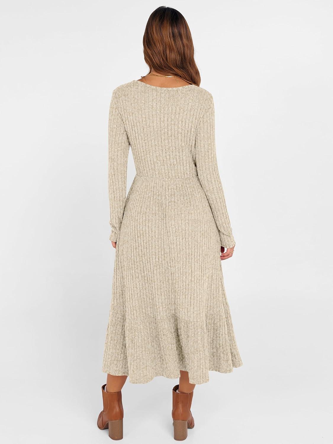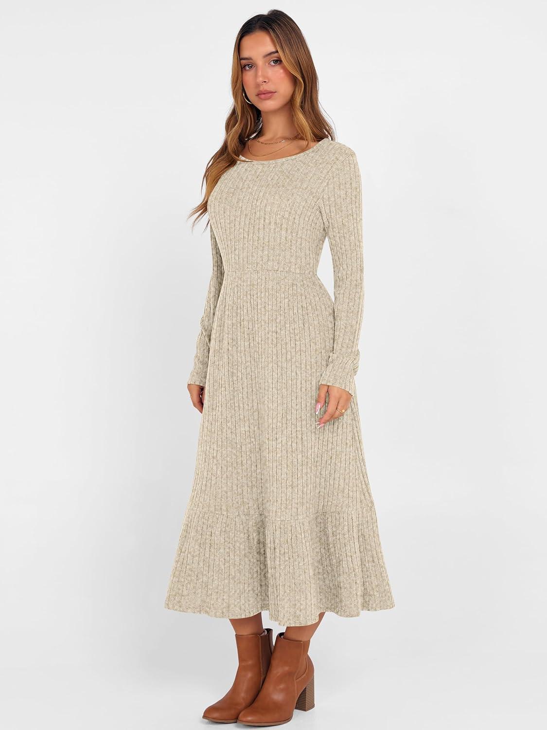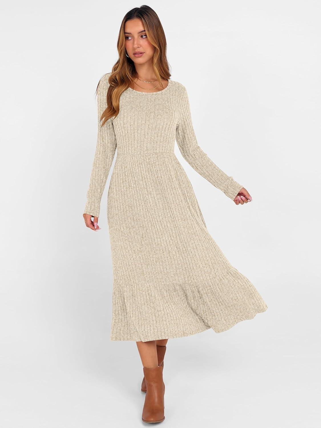 ANRABESS Womens Long Sleeve Midi Dress 2025 Fall Rib Knit Crew Neck A Line Soft Flowy Swing Dresses with Pocket Casual Trendy(Light Khaki)