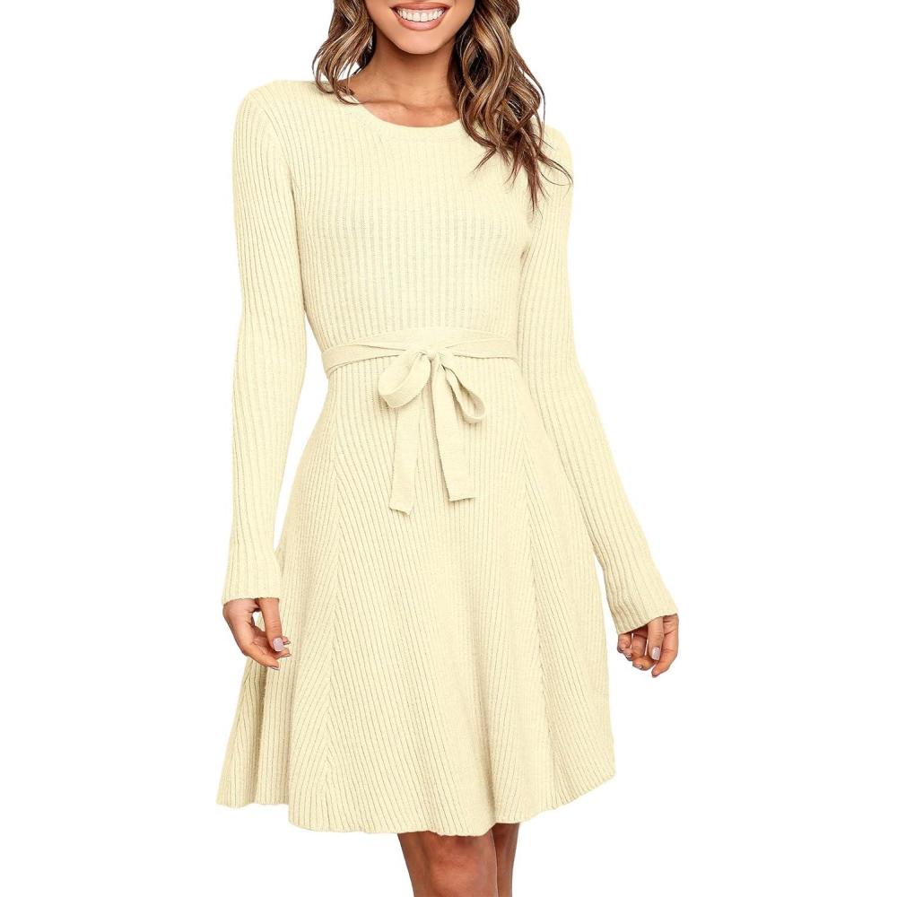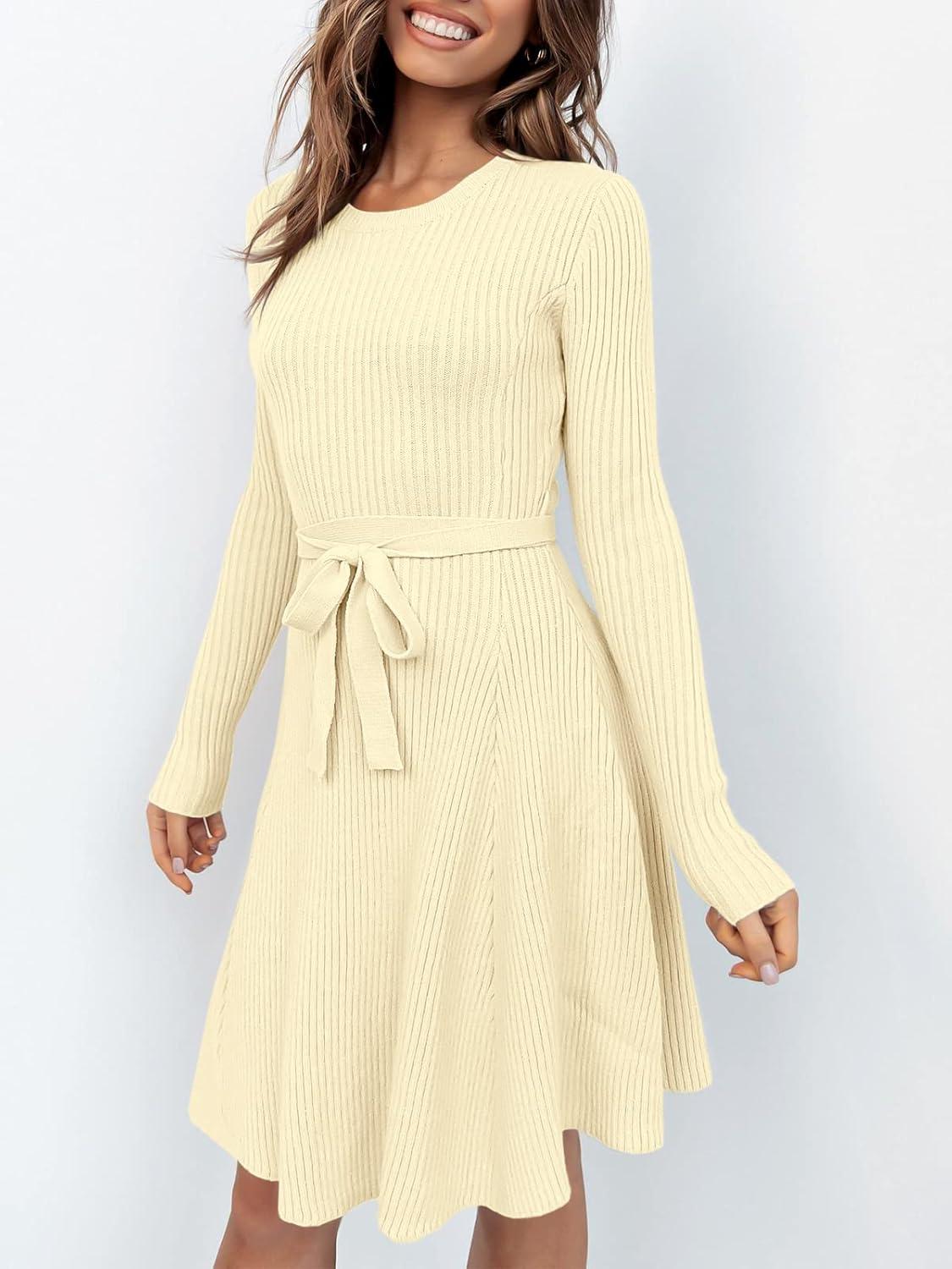 ANRABESS Women's Long Sleeve Midi Dress Crewneck Tie Waist A-Line Swing Casual Bodycon Ribbed Knit 2025 Fall Sweater Dress