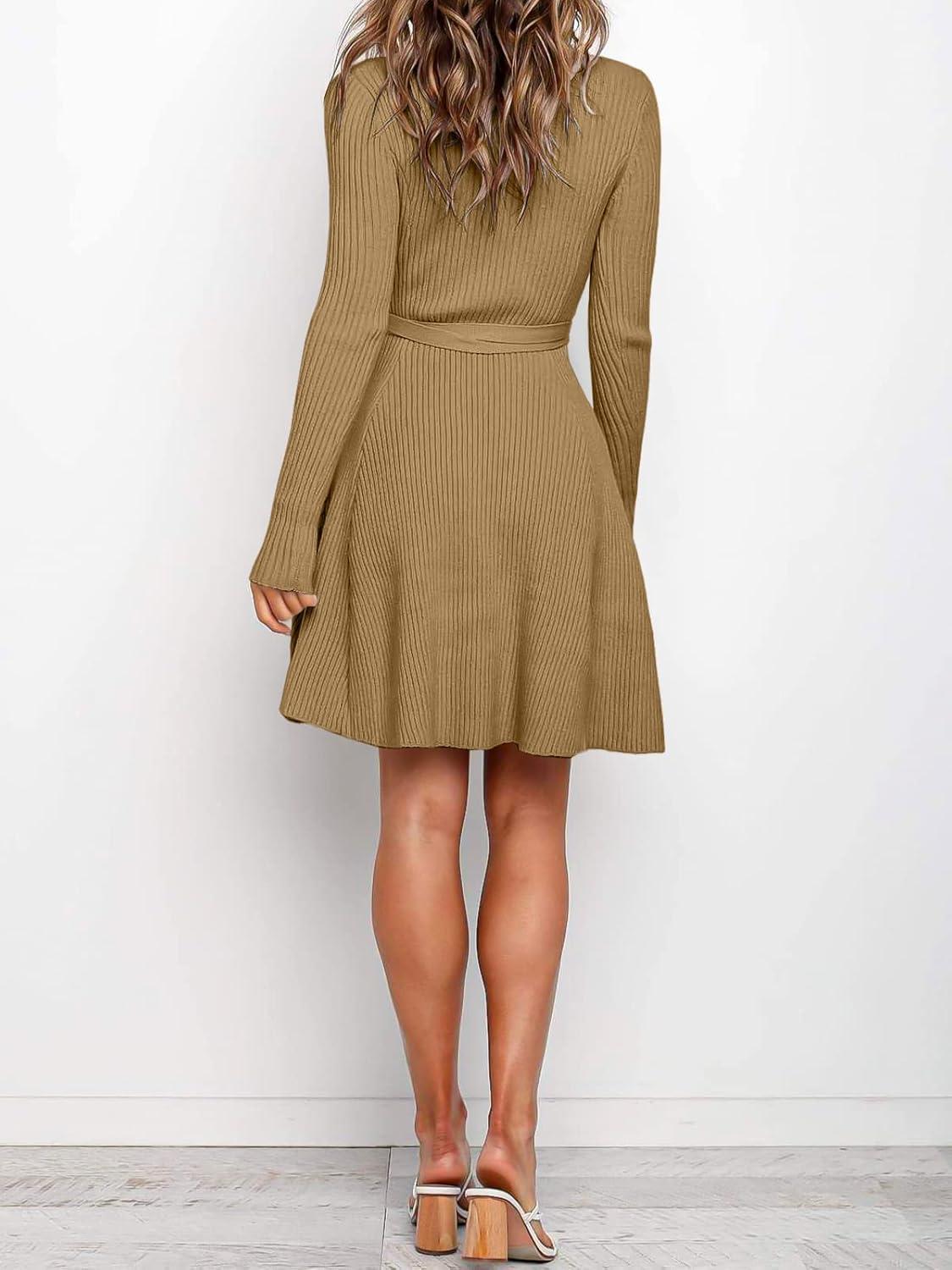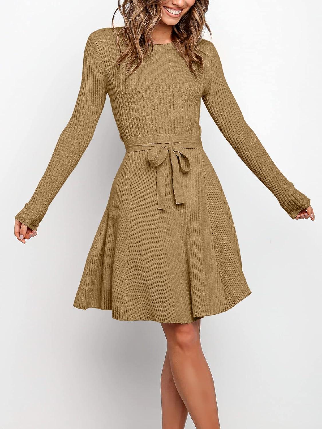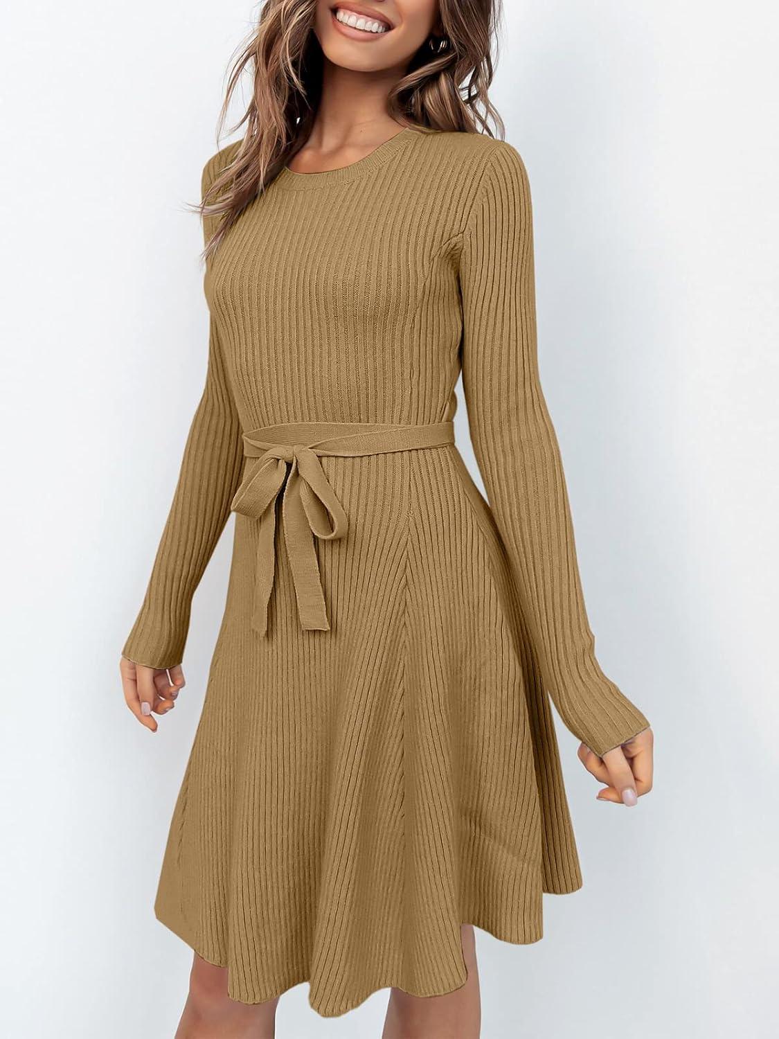 ANRABESS Women’s Long Sleeve Midi Dress Crewneck Tie Waist A-Line Swing Casual Bodycon Ribbed Knit 2025 Fall Sweater Dress(Khaki)