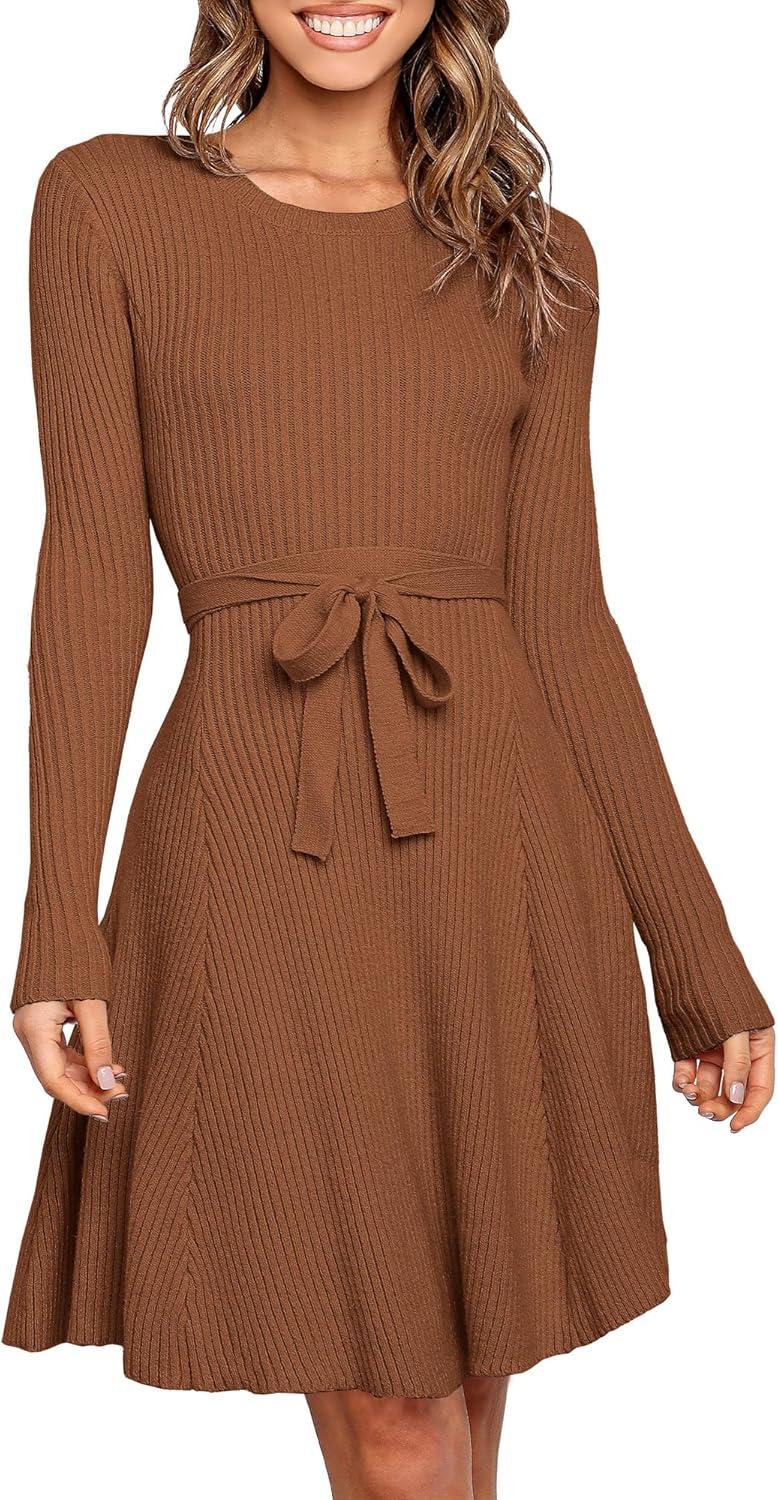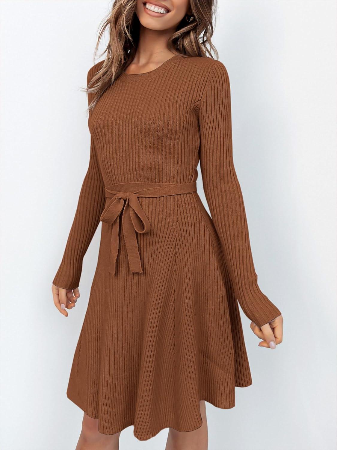 ANRABESS Women’s Long Sleeve Midi Dress Crewneck Tie Waist A-Line Swing Casual Bodycon Ribbed Knit 2025 Fall Sweater Dress(Caramel)