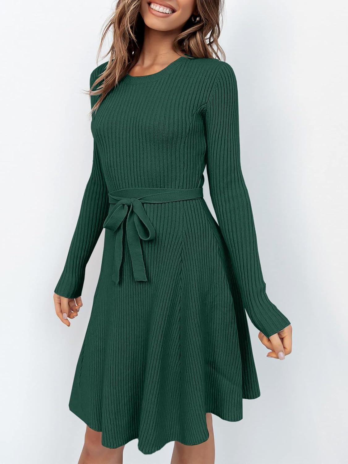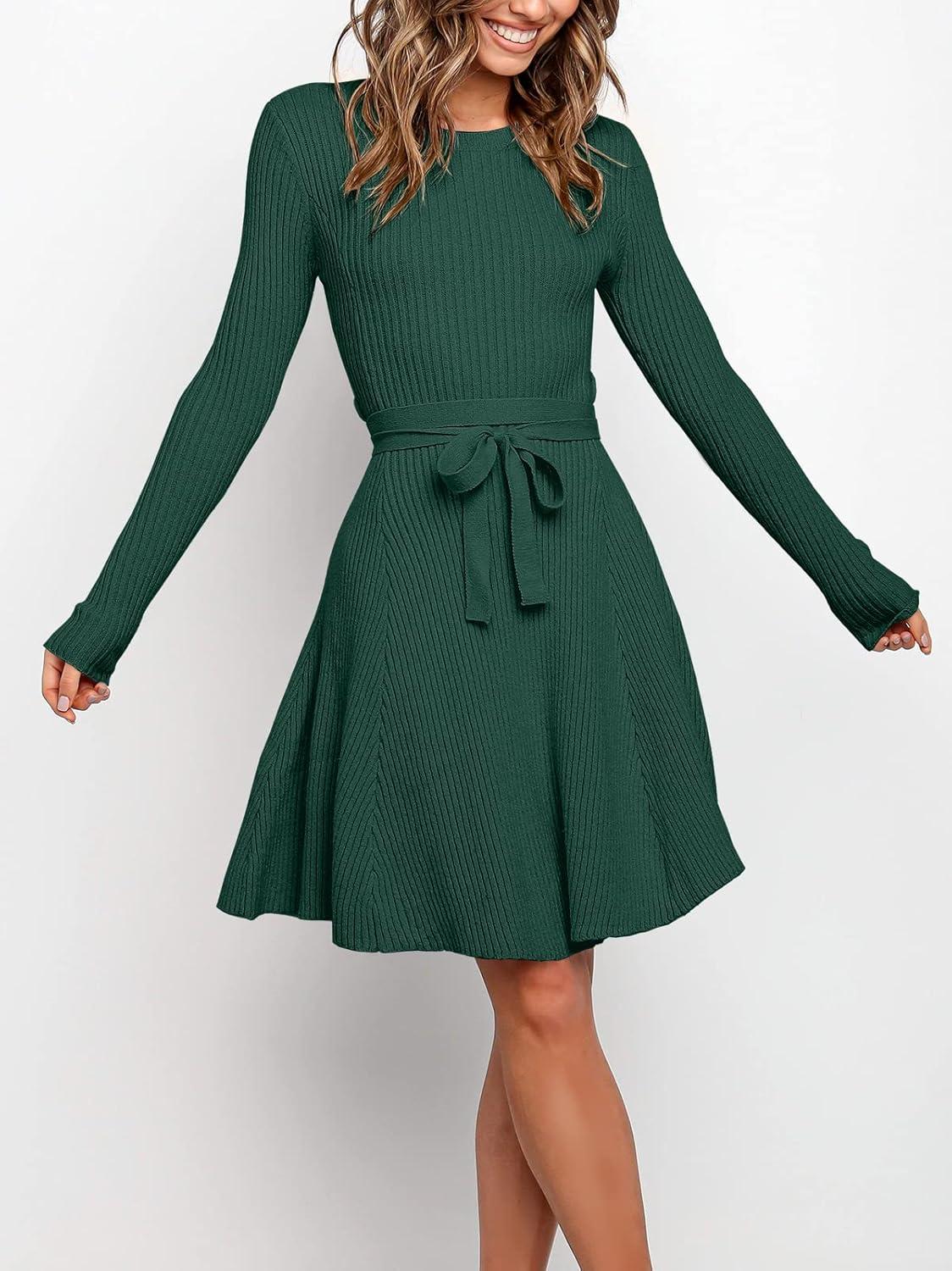 ANRABESS Women's Long Sleeve Midi Dress Crewneck Tie Waist A-Line Swing Casual Bodycon Ribbed Knit 2025 Fall Sweater Dress(Green)