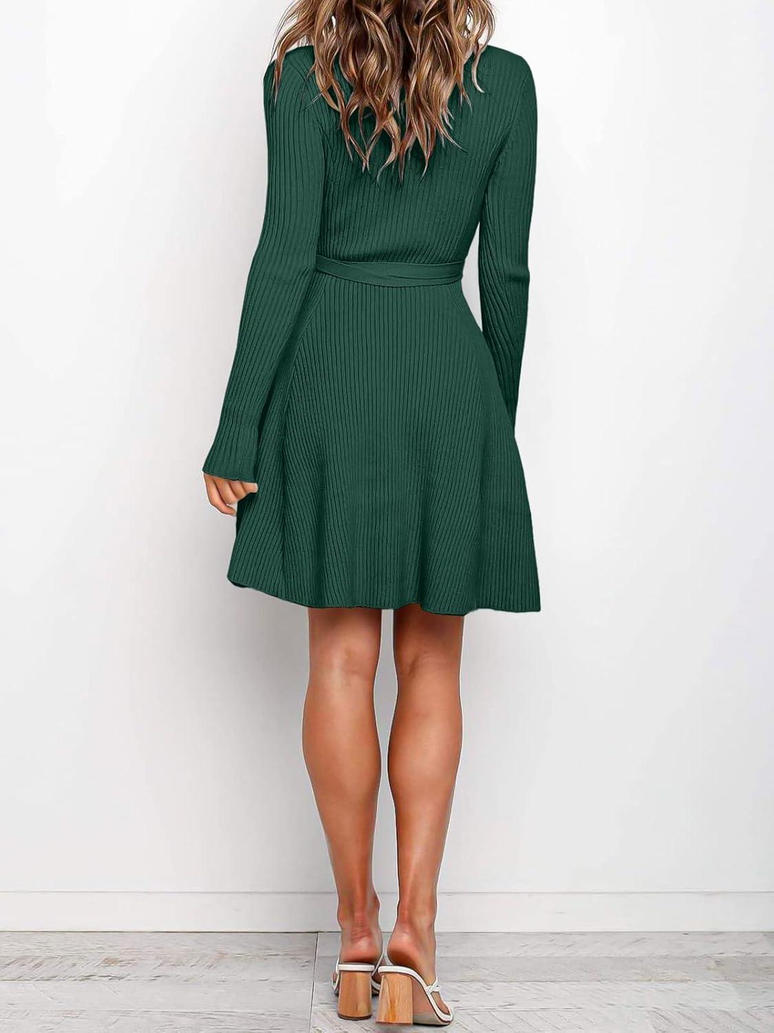 imageANRABESS Womens Long Sleeve Midi Dress Crewneck Tie Waist ALine Swing Casual Bodycon Ribbed Knit 2025 Fall Sweater DressGreen