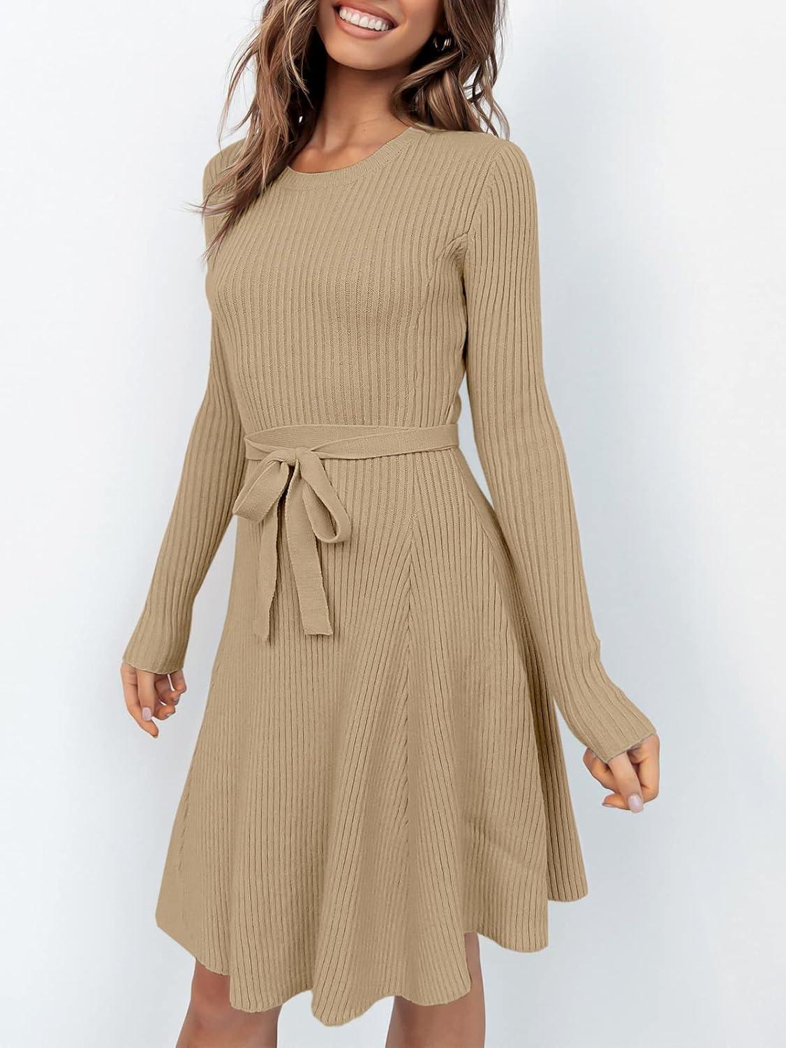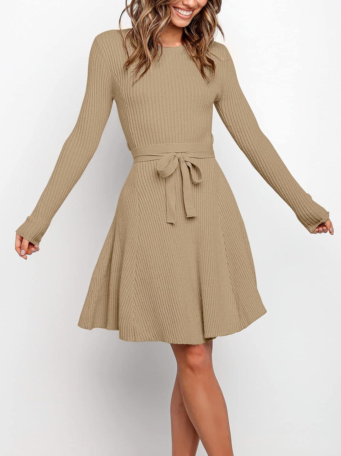 ANRABESS Women's Long Sleeve Midi Dress Crewneck Tie Waist A-Line Swing Casual Bodycon Ribbed Knit 2025 Fall Sweater Dress(Khaki)