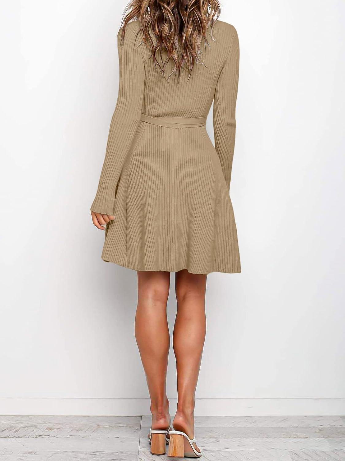 ANRABESS Women’s Long Sleeve Midi Dress Crewneck Tie Waist A-Line Swing Casual Bodycon Ribbed Knit 2025 Fall Sweater Dress(Khaki)