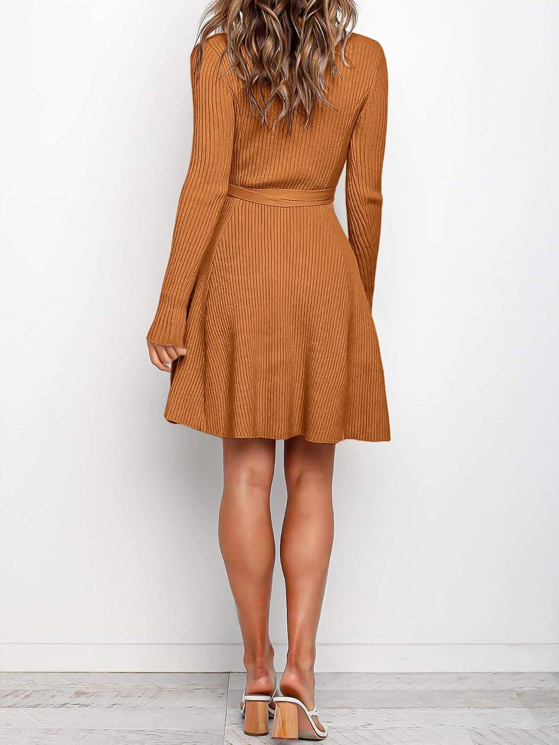 ANRABESS Women’s Long Sleeve Midi Dress Crewneck Tie Waist A-Line Swing Casual Bodycon Ribbed Knit 2025 Fall Sweater Dress(Pumpkin)