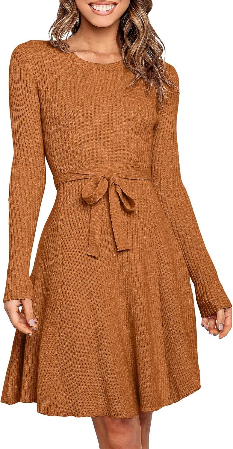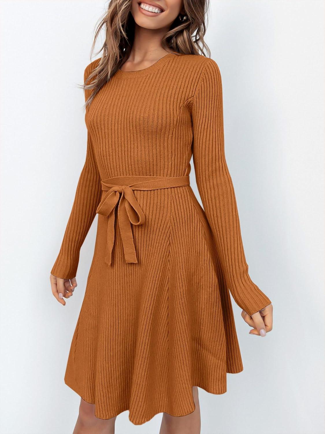 imageANRABESS Womens Long Sleeve Midi Dress Crewneck Tie Waist ALine Swing Casual Bodycon Ribbed Knit 2025 Fall Sweater DressPumpkin