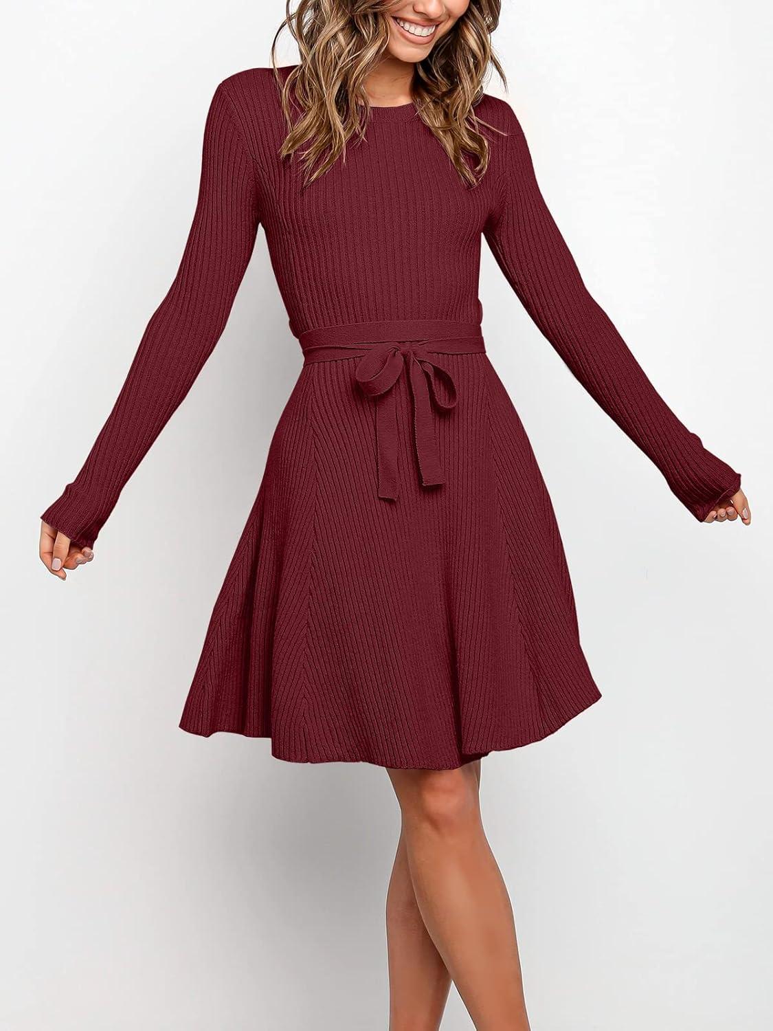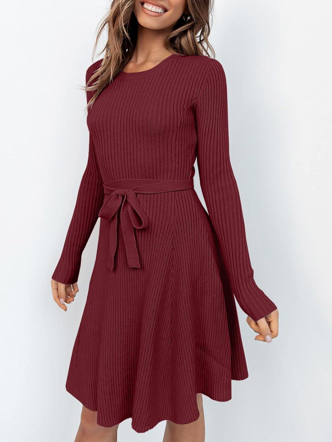 ANRABESS Women’s Long Sleeve Midi Dress Crewneck Tie Waist A-Line Swing Casual Bodycon Ribbed Knit 2025 Fall Sweater Dress(Wine Red)