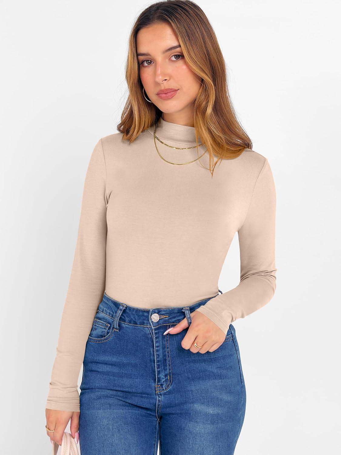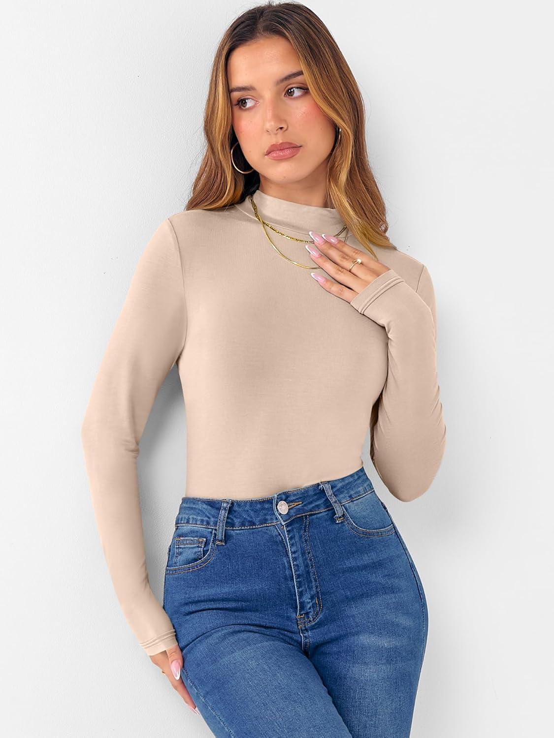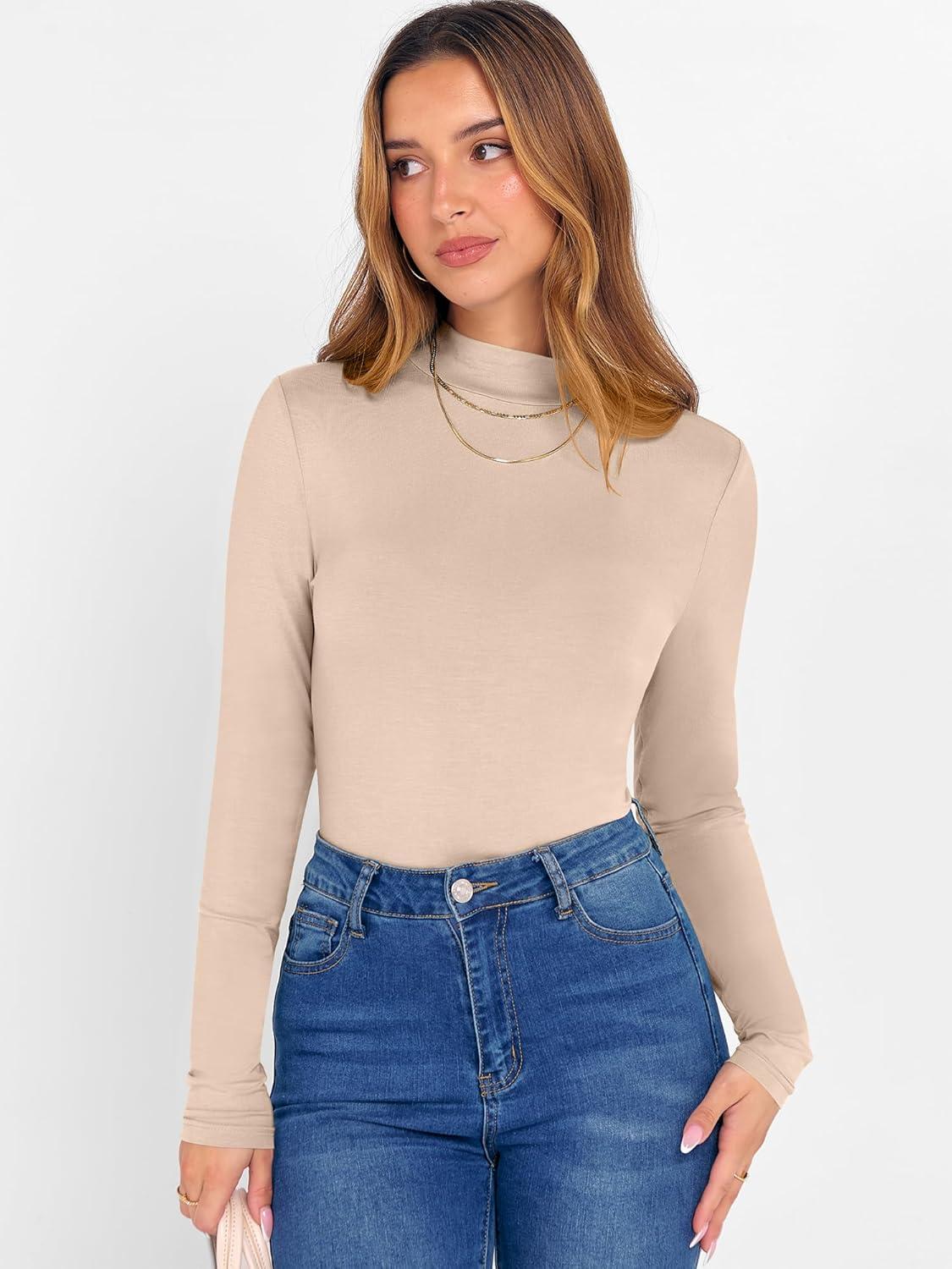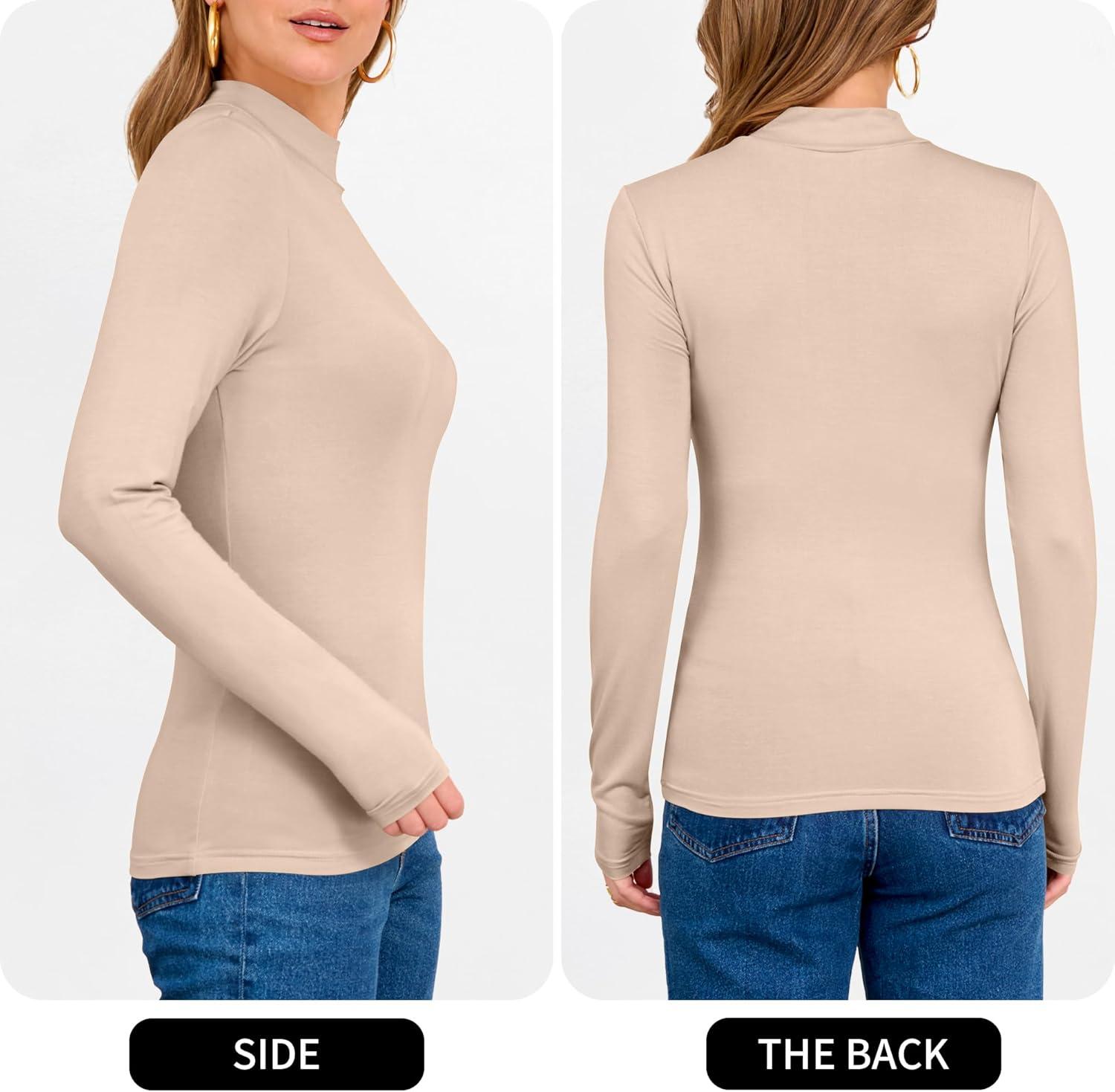 ANRABESS Womens Long Sleeve Mock Neck Tops Slim Fitted Basic Layer Office Work Shirts 2025 Fall Outfits Y2K Clothes(Light Khaki)