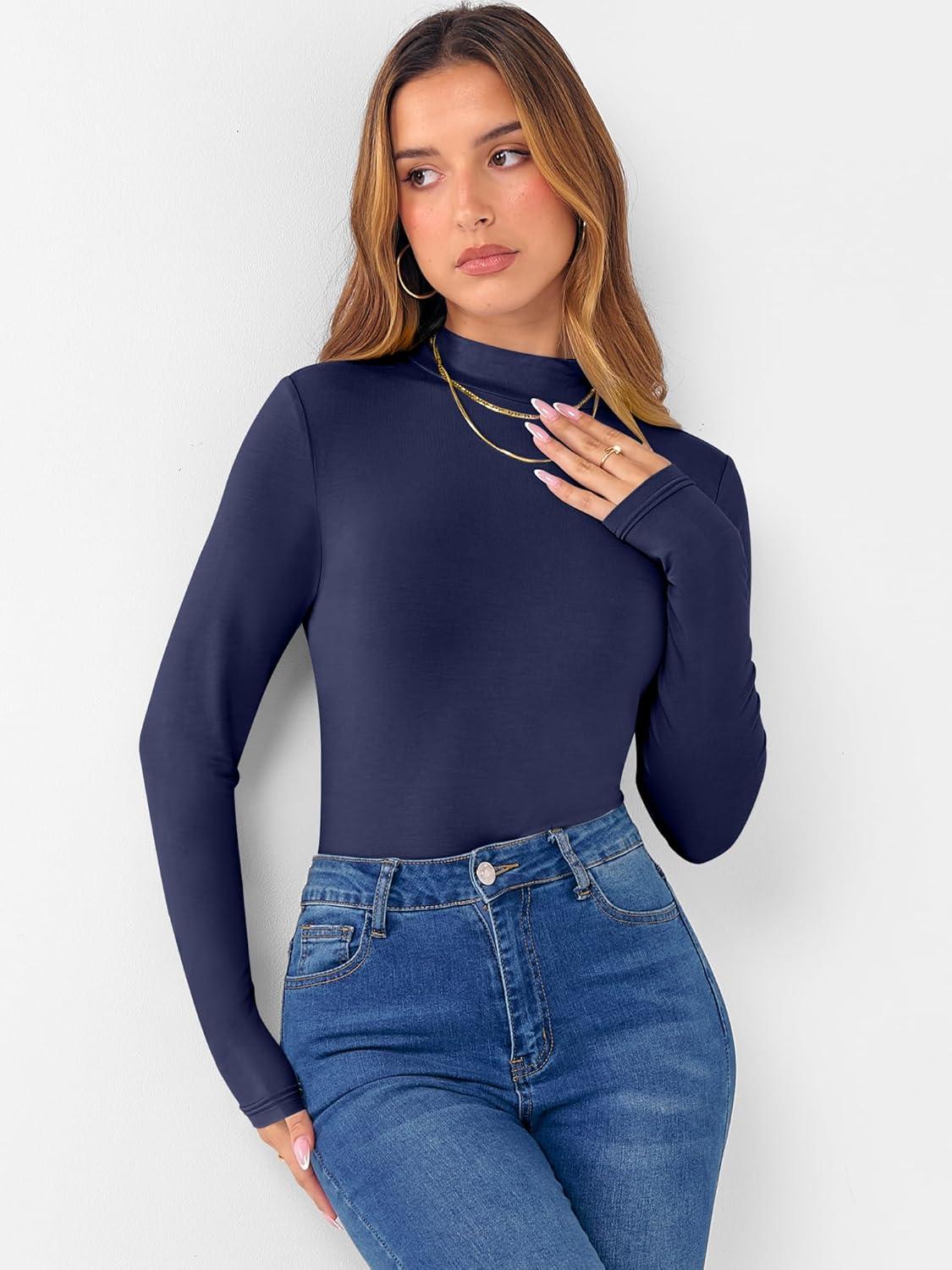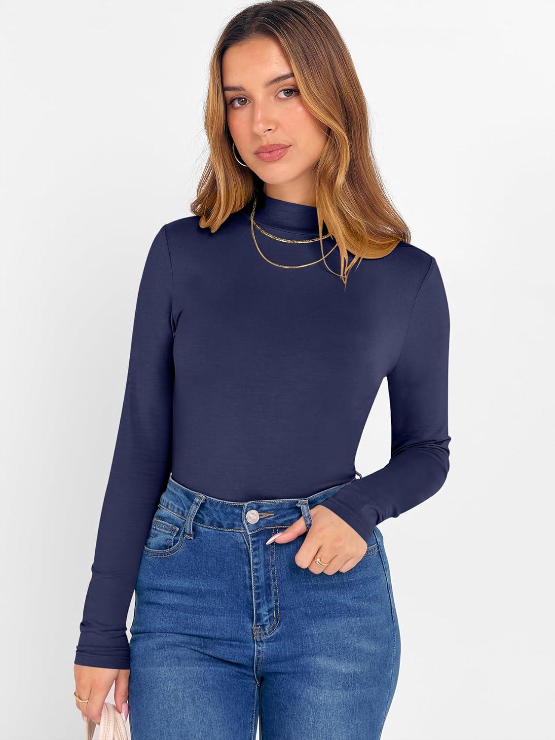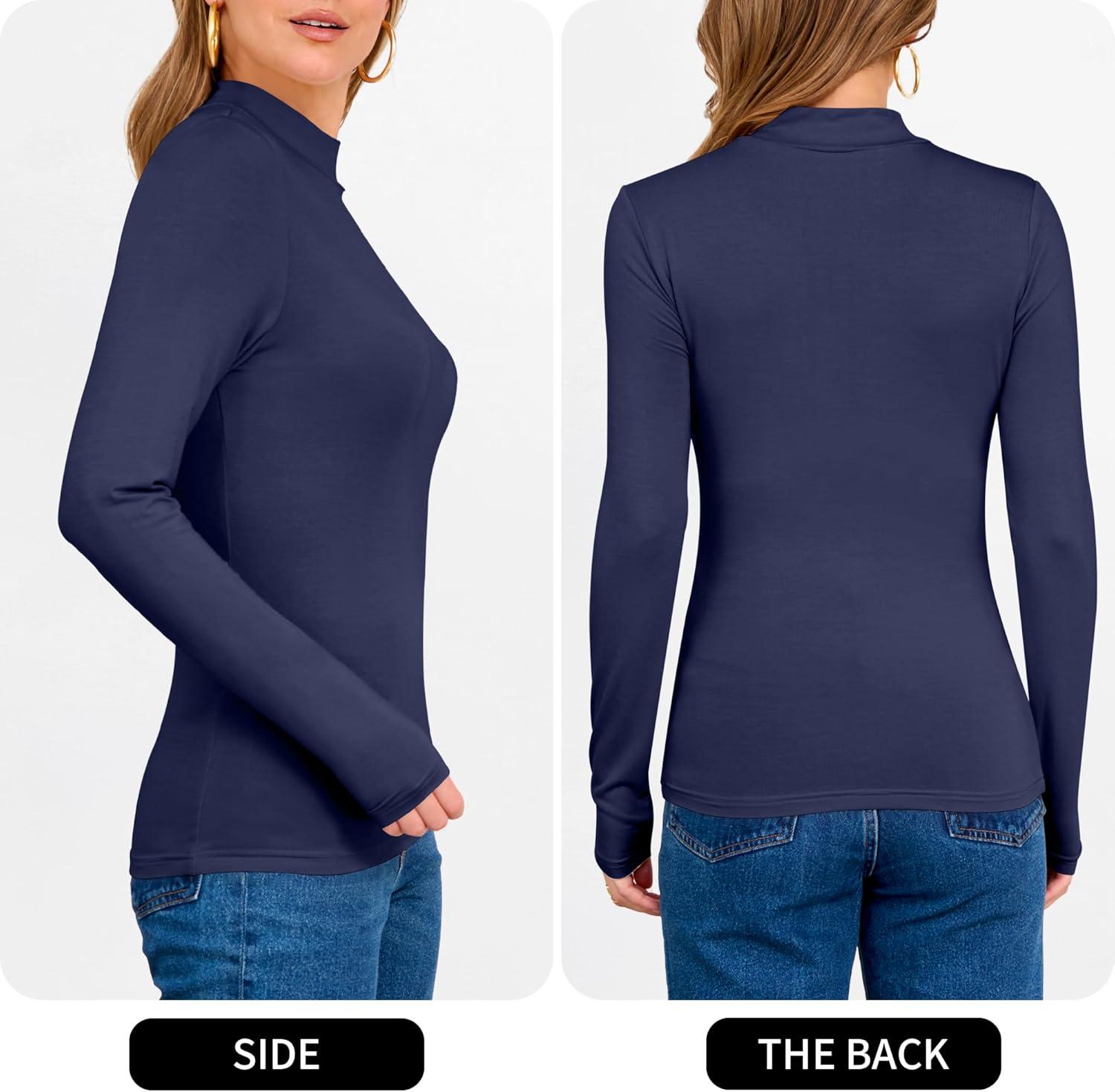 ANRABESS Womens Long Sleeve Mock Neck Tops Slim Fitted Basic Layer Office Work Shirts 2025 Fall Outfits Y2K Clothes(Navy Blue)