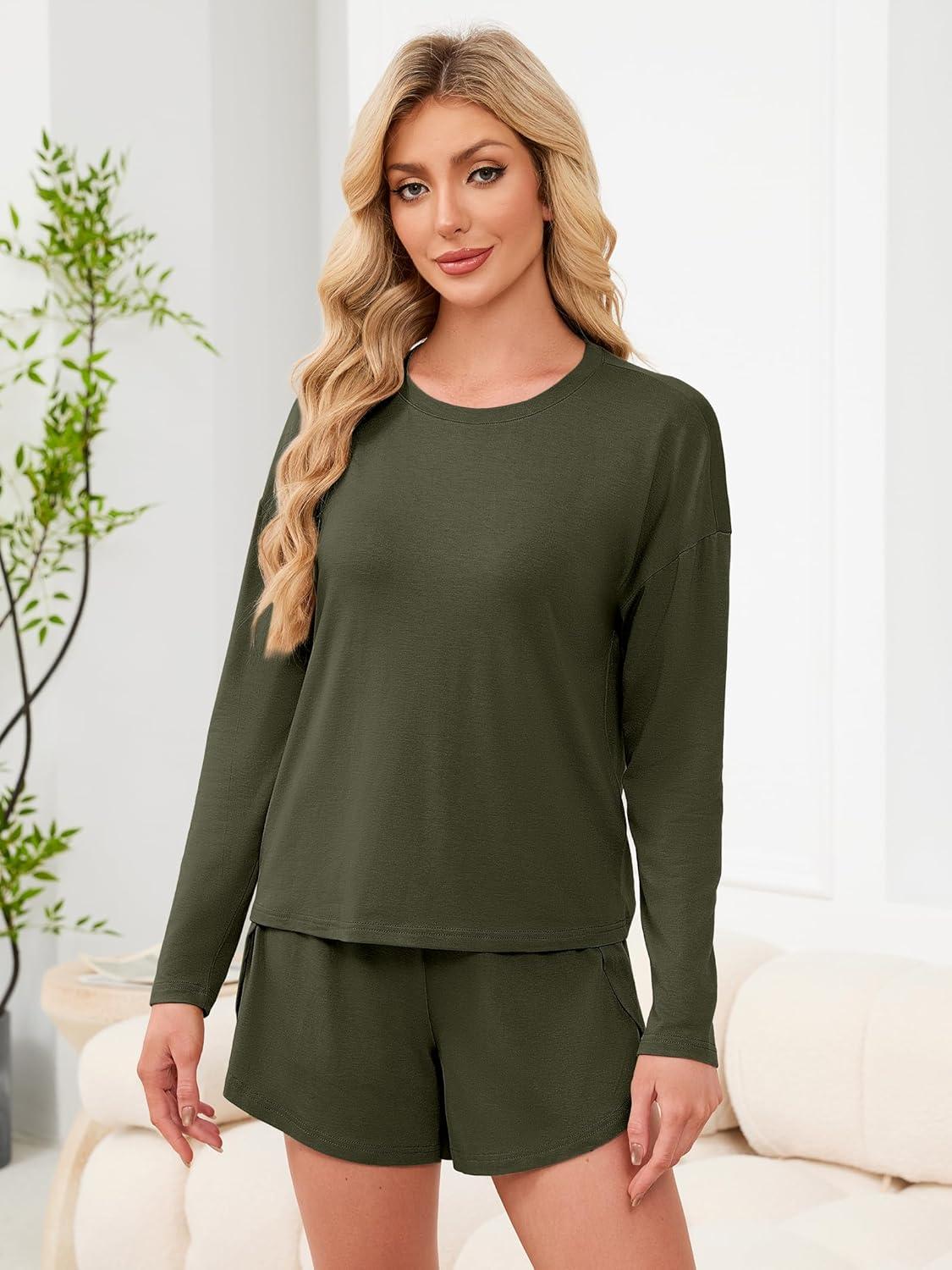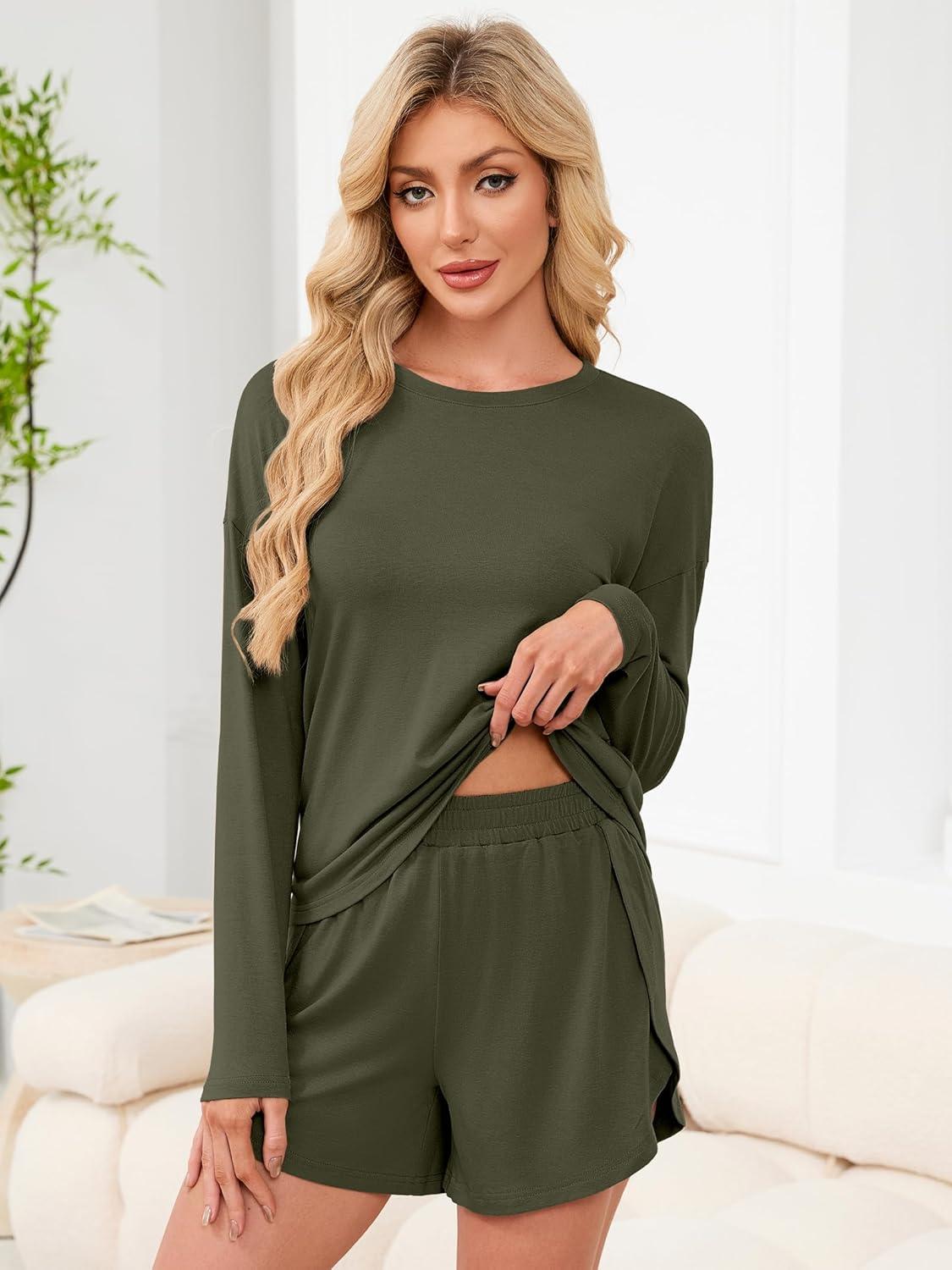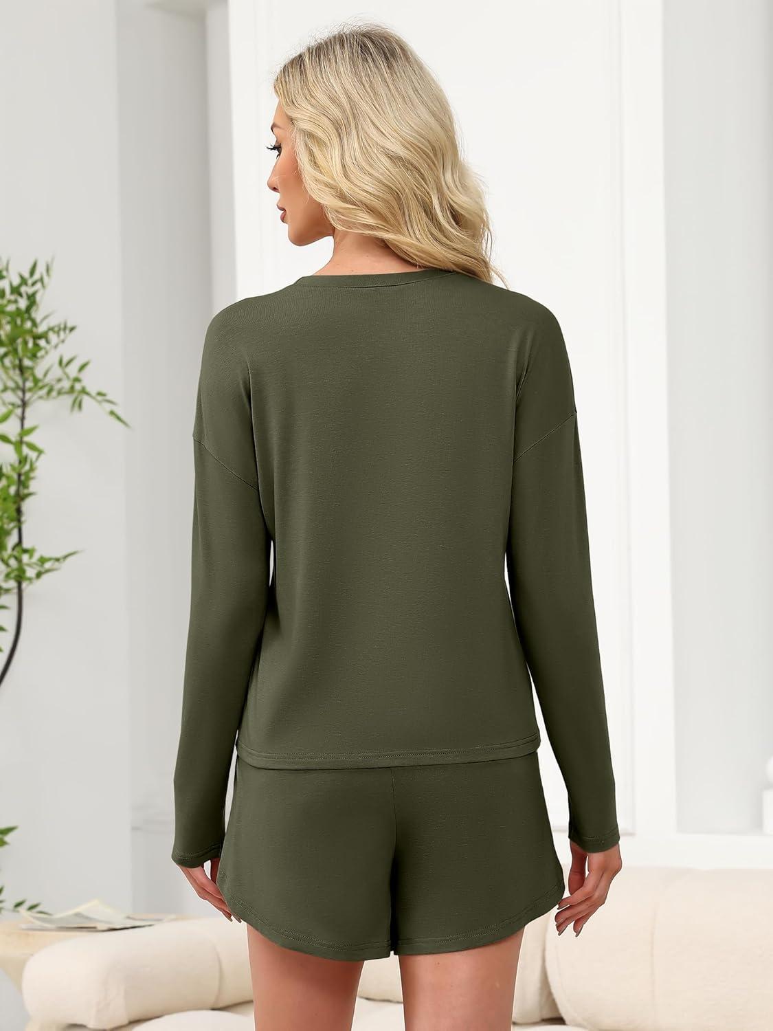 imageANRABESS Womens Long Sleeve Pajama Sets 2025 Fall 2 Piece Outfits Lounge Matching Short Set Striped Pjs Loungewear SleepwearArmy Green