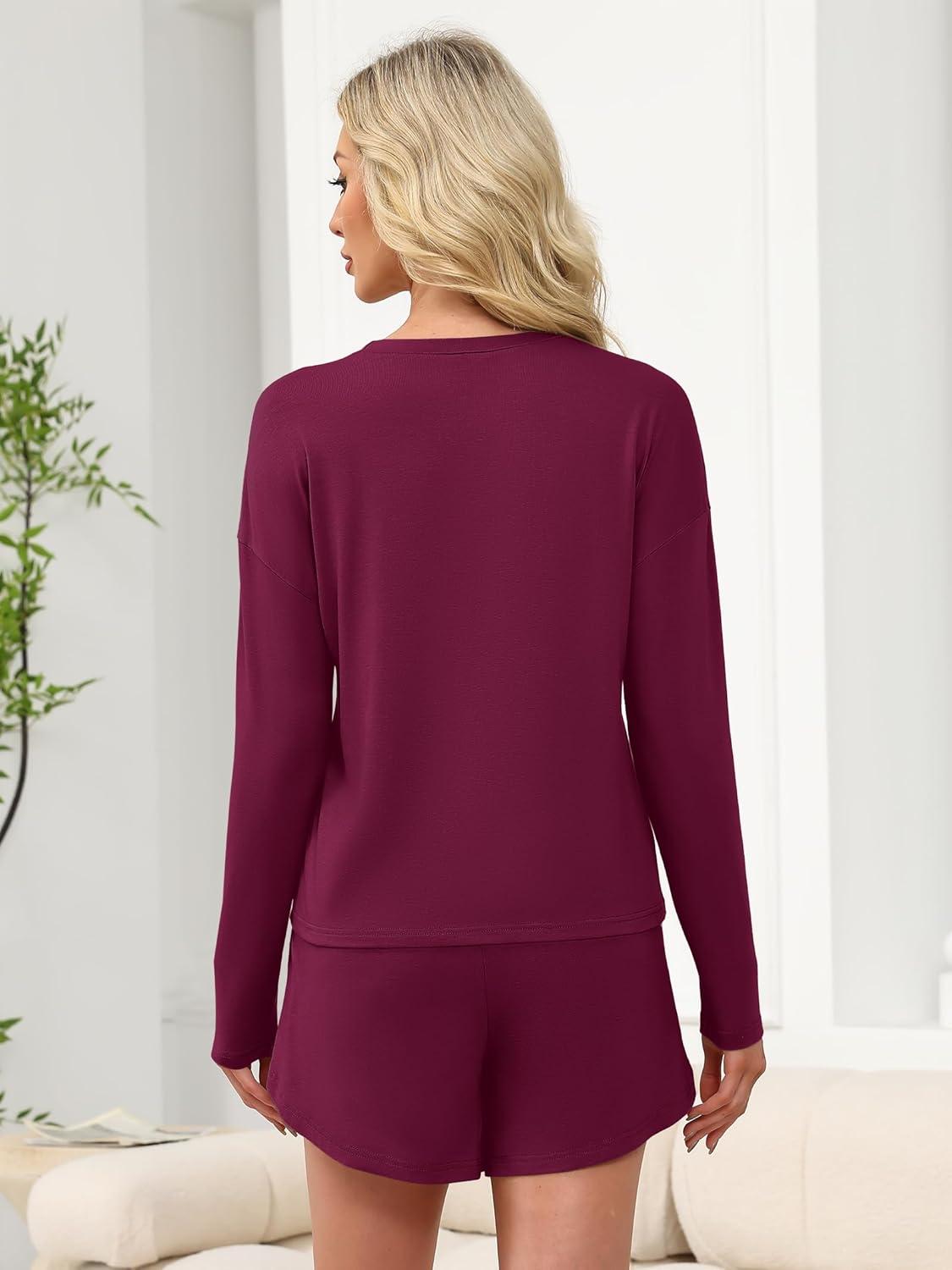 ANRABESS Womens Long Sleeve Pajama Sets 2025 Fall 2 Piece Outfits Lounge Matching Short Set Striped Pjs Loungewear Sleepwear(Burgundy)