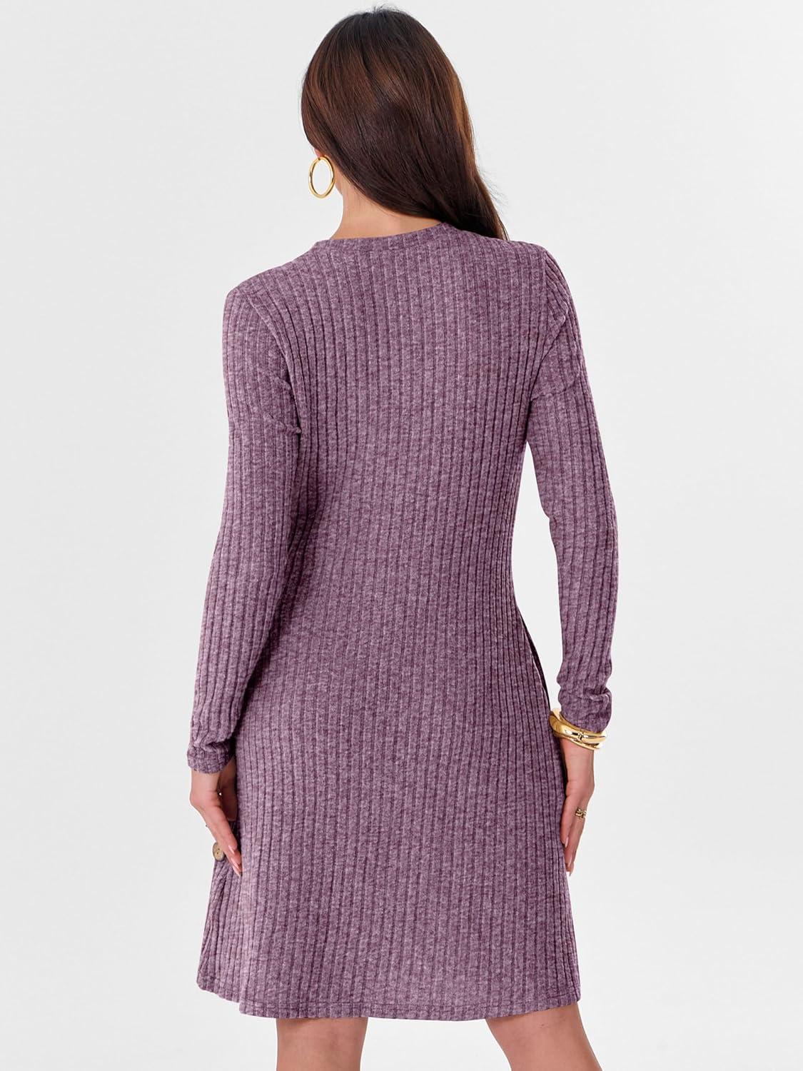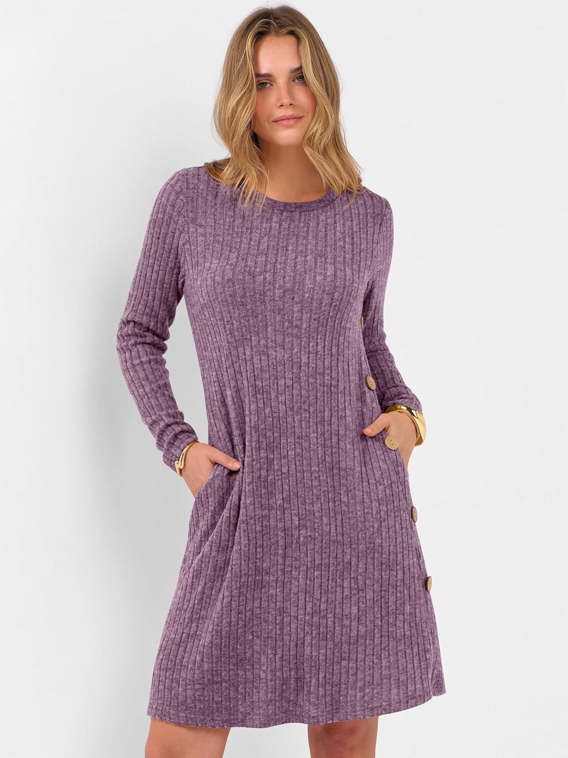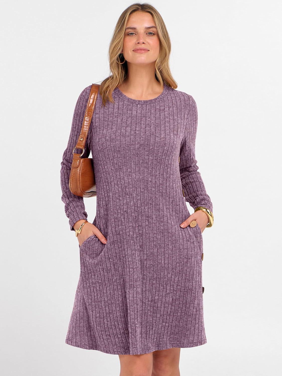 ANRABESS Womens Long Sleeve Ribbed Knit Sweater Dresses 2025 Fall Winter Casual Lounge Short Tunic Dress with Pockets Buttons(Purple Mauve)