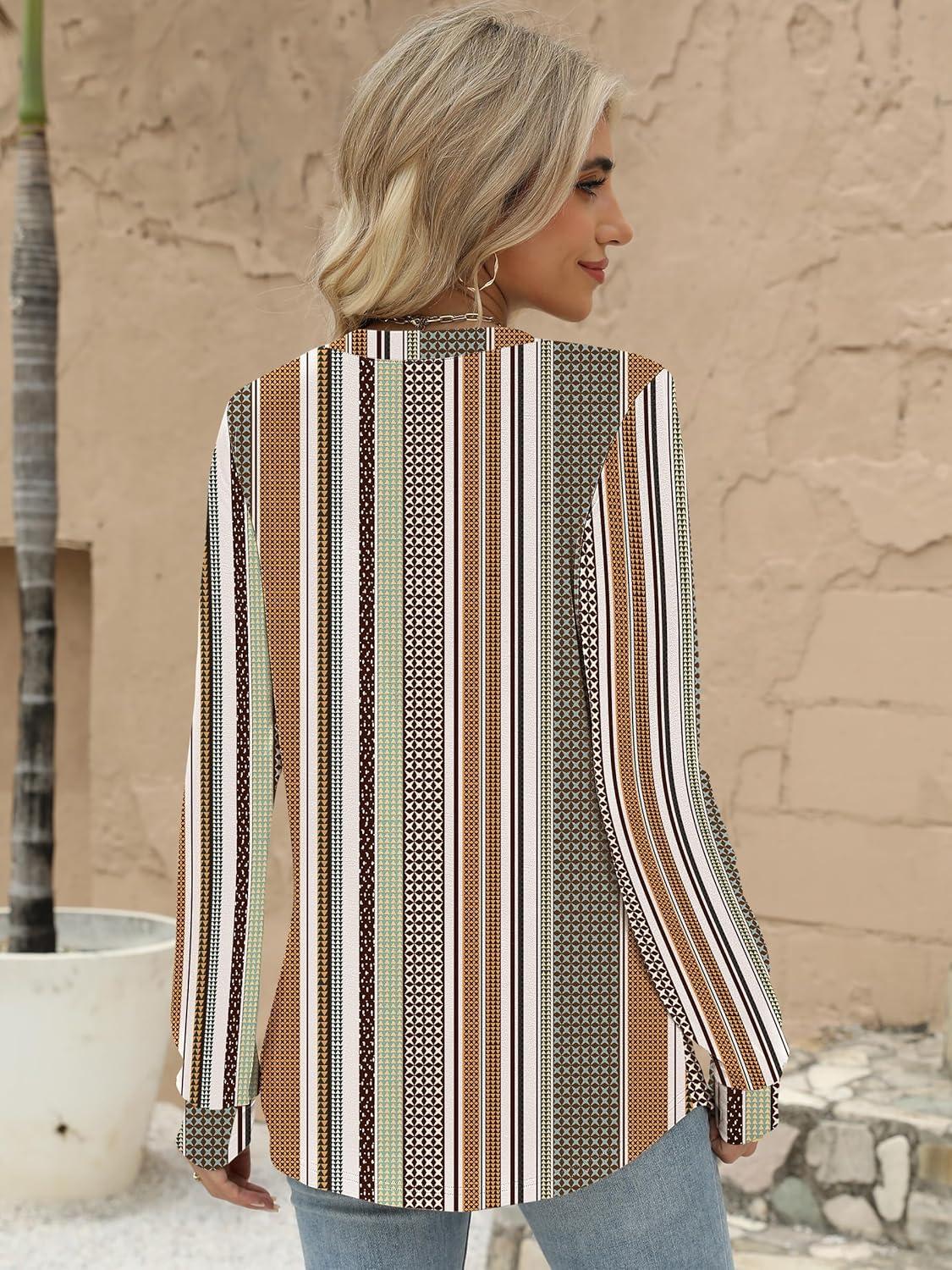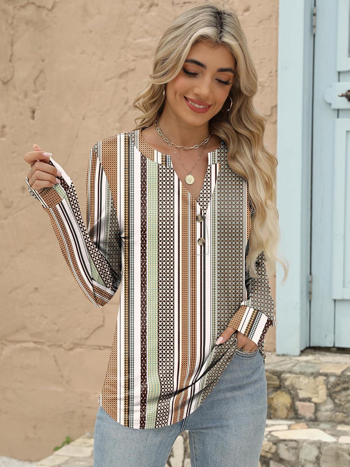 ANRABESS Women's Long Sleeve Shirts 2025 Fall Henley Business Casual Tops Cute T-Shirts Work Blouses Outfits Vacation Clothes(Brown White Strip)