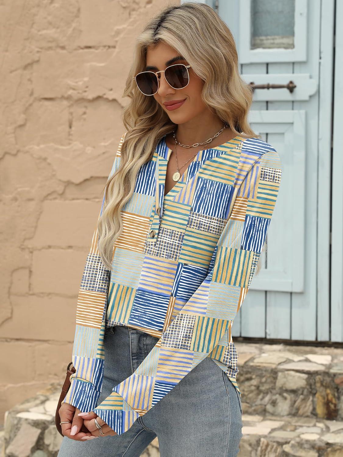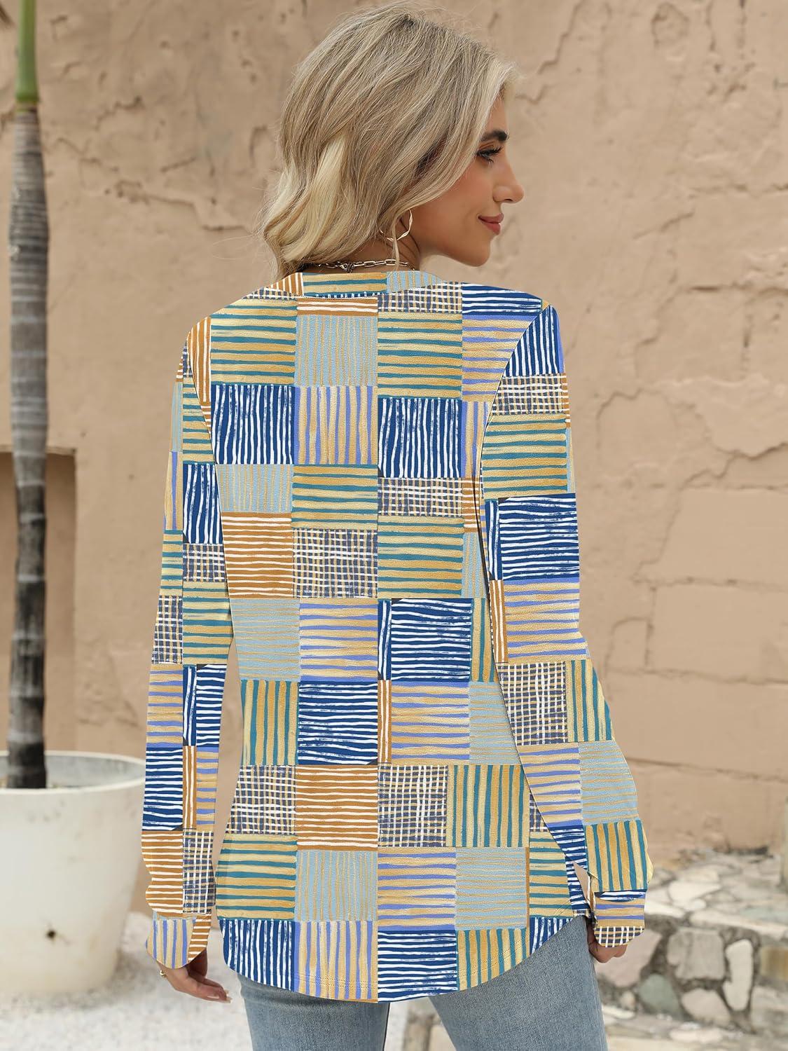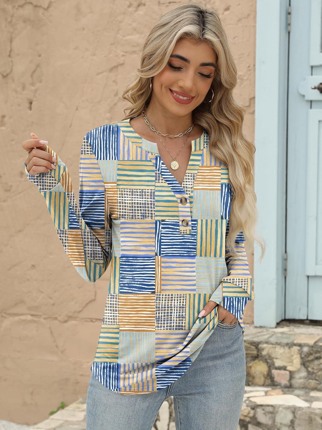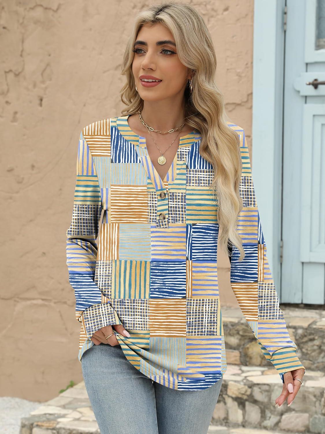 ANRABESS Women's Long Sleeve Shirts 2025 Fall Henley Business Casual Tops Cute T-Shirts Work Blouses Outfits Vacation Clothes(Deep Plaid - Blue)