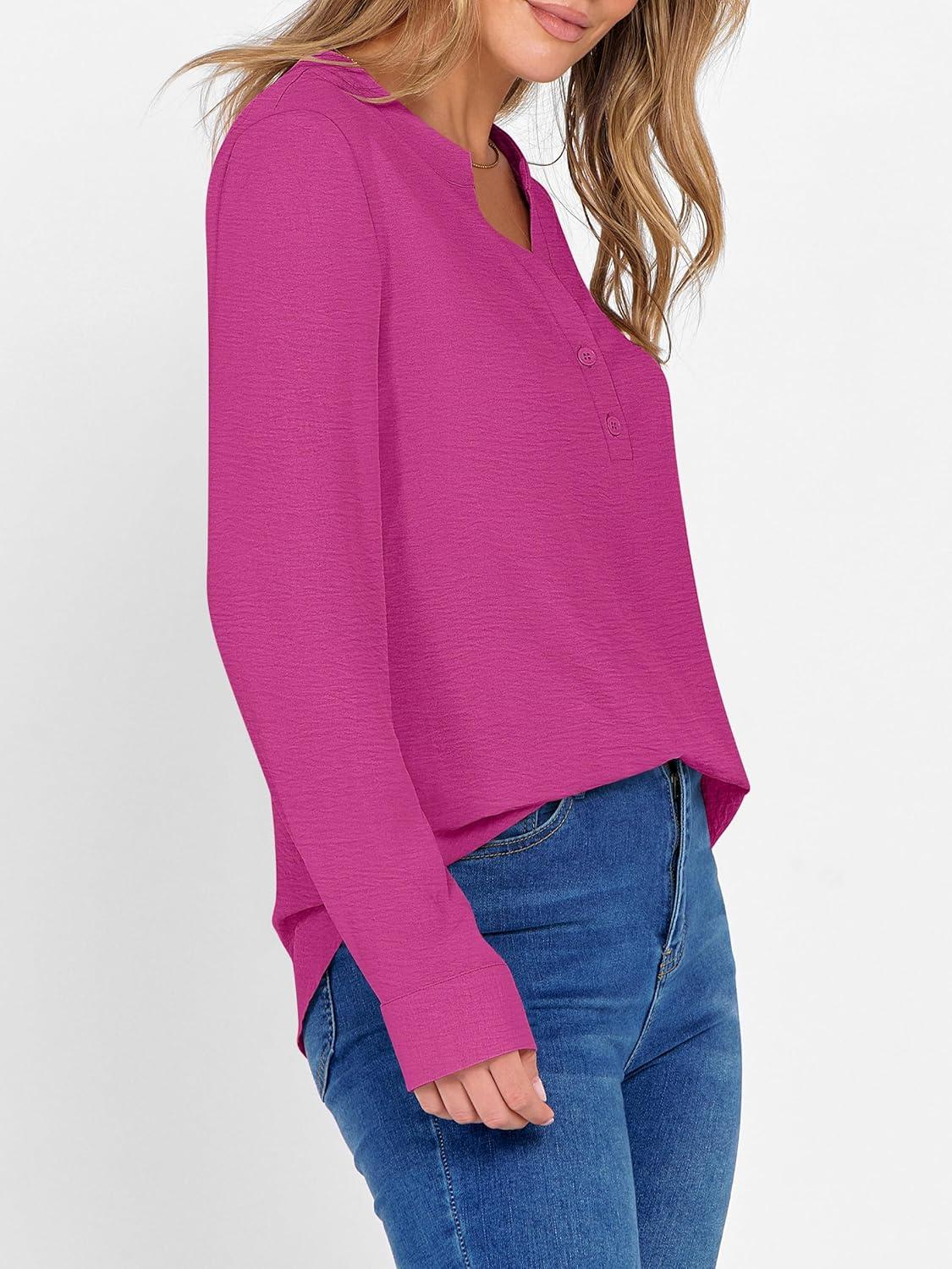 ANRABESS Women’s Long Sleeve Shirts 2025 Fall Henley Business Dressy Casual Tops V Neck Button Down T-Shirts Work Blouses(Hot Pink)
