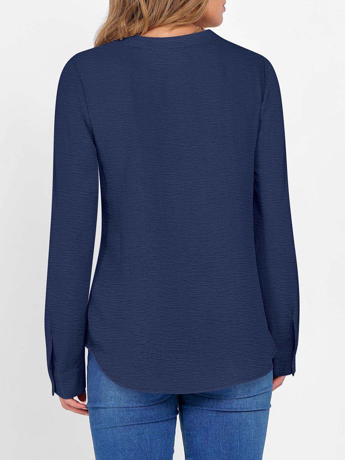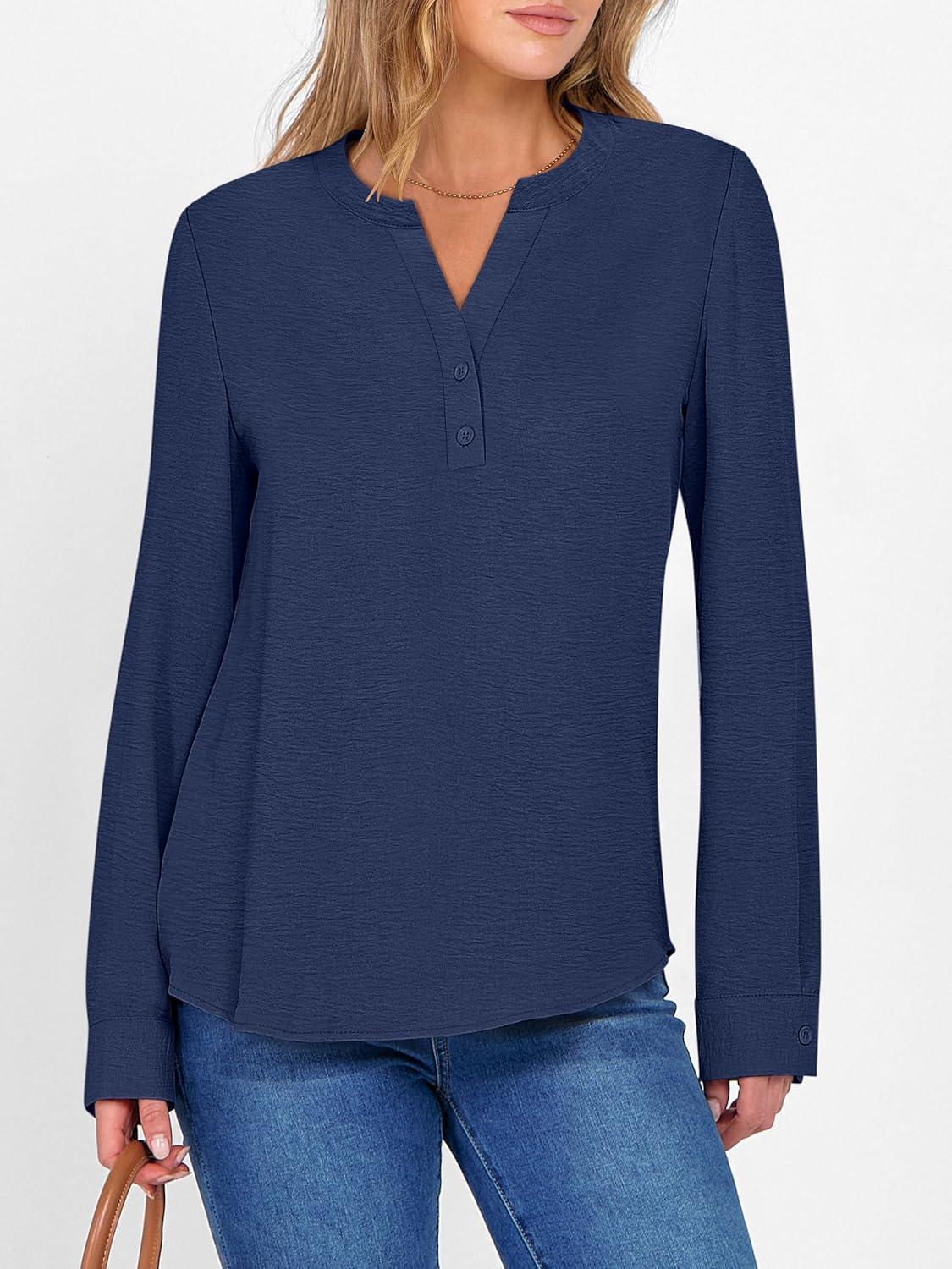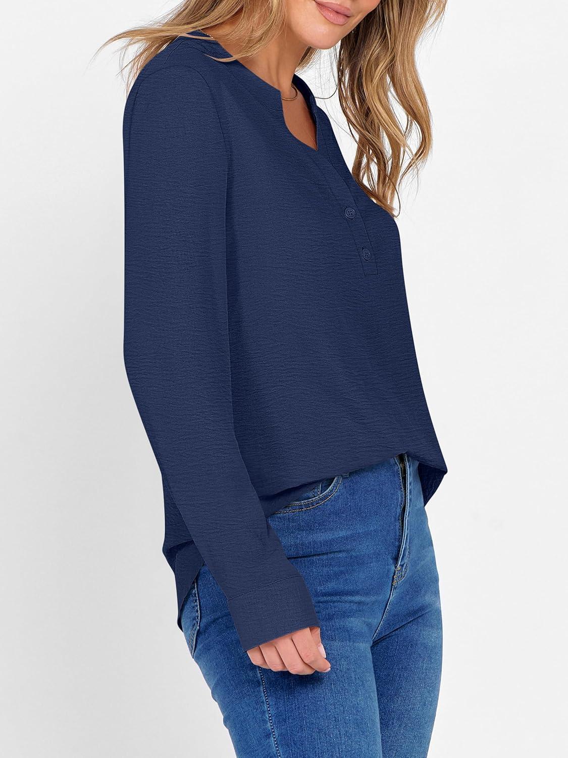 ANRABESS Women's Long Sleeve Shirts 2025 Fall Henley Business Dressy Casual Tops V Neck Button Down T-Shirts Work Blouses(Navy Blue)