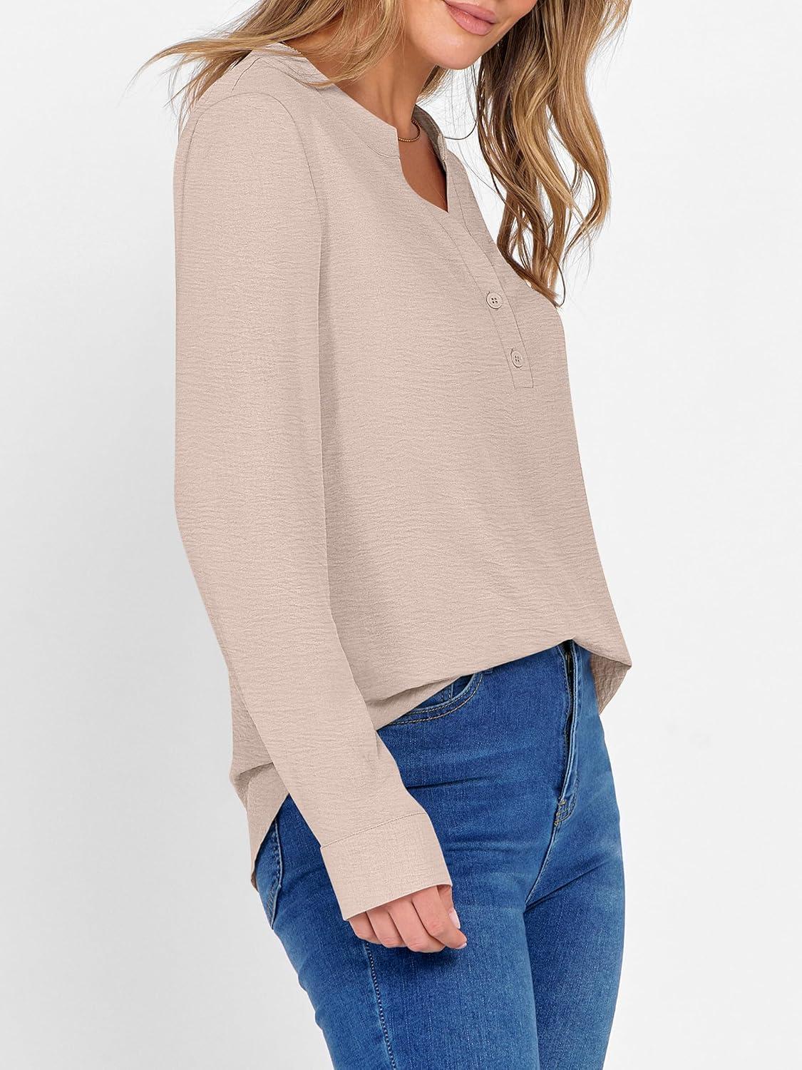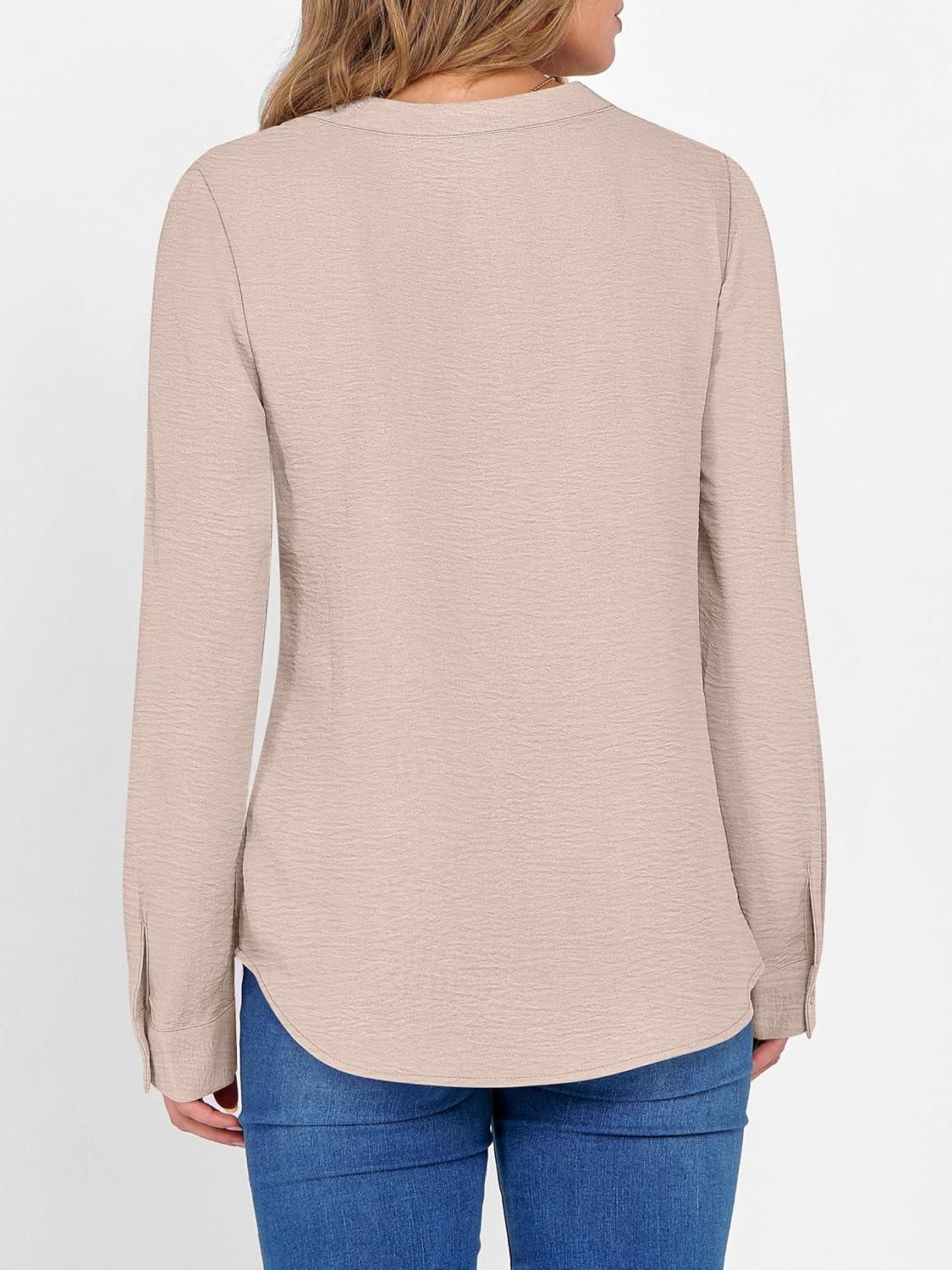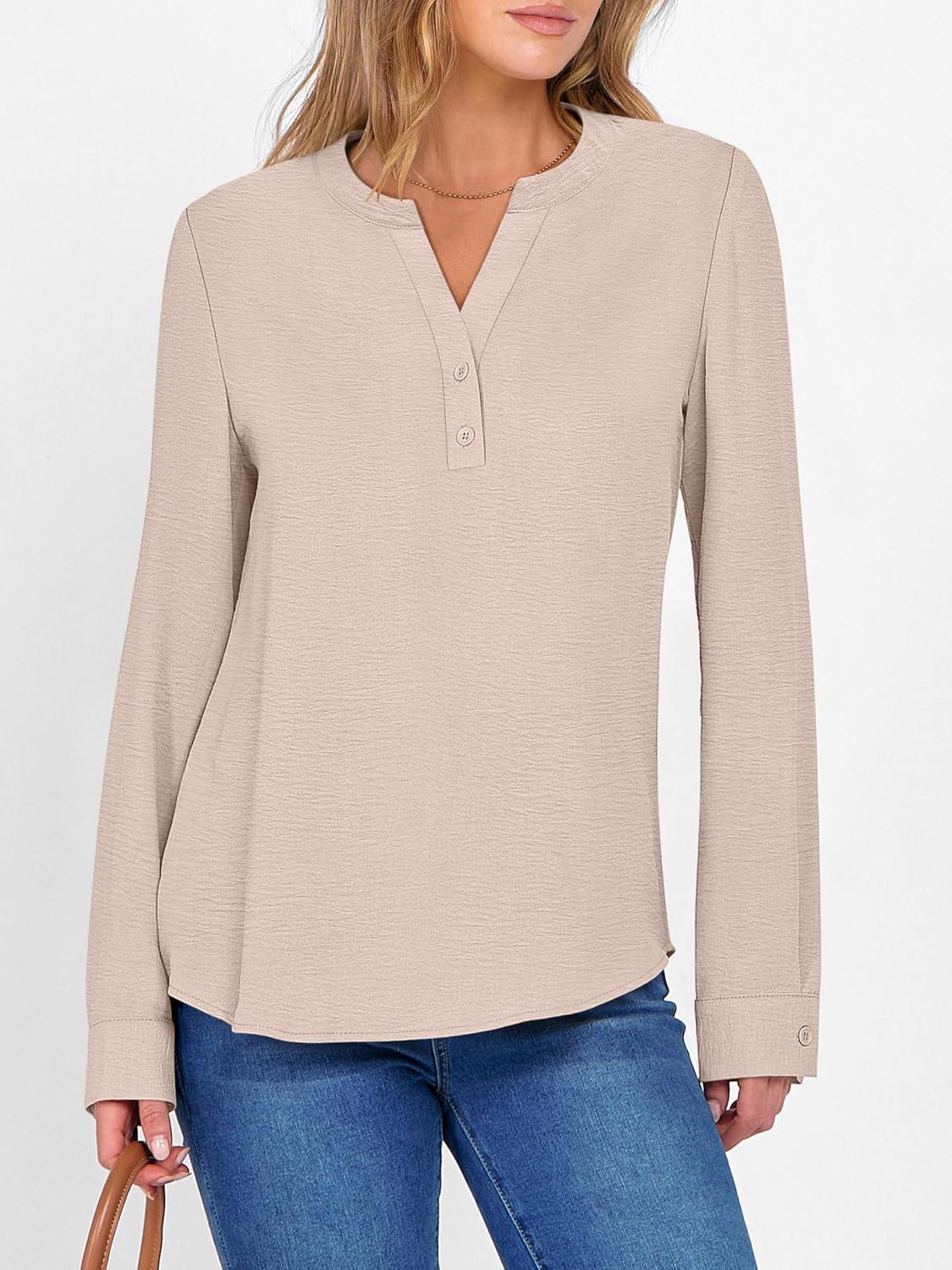 ANRABESS Women's Long Sleeve Shirts 2025 Fall Henley Business Dressy Casual Tops V Neck Button Down T-Shirts Work Blouses(Parchment)
