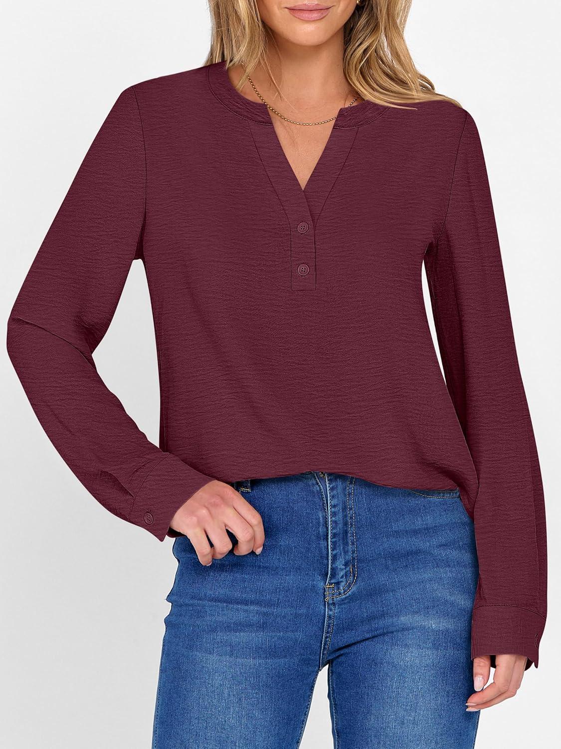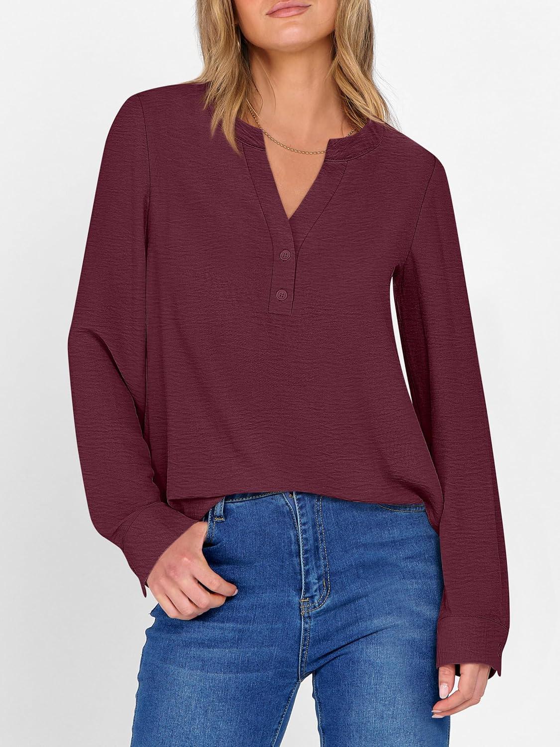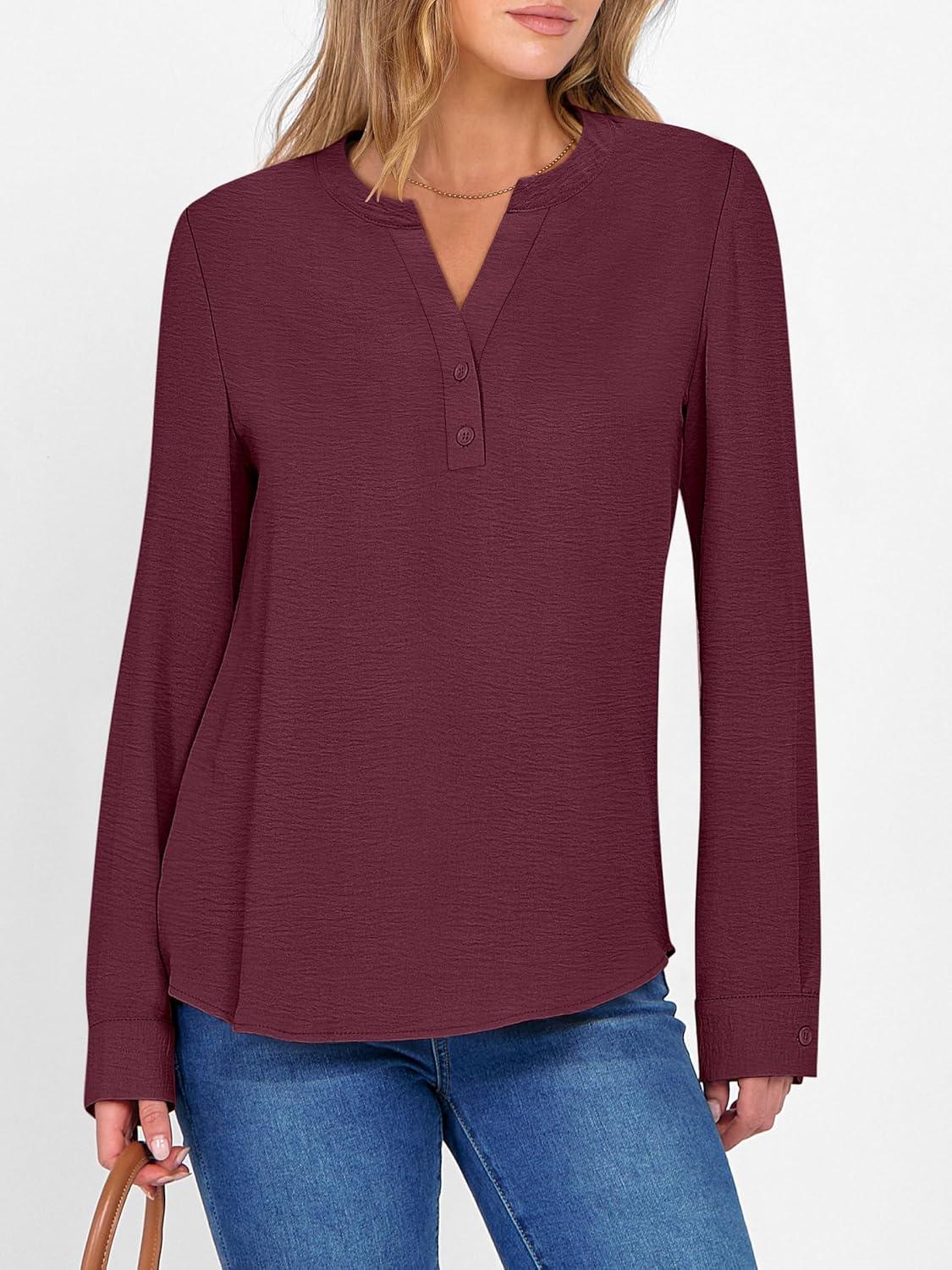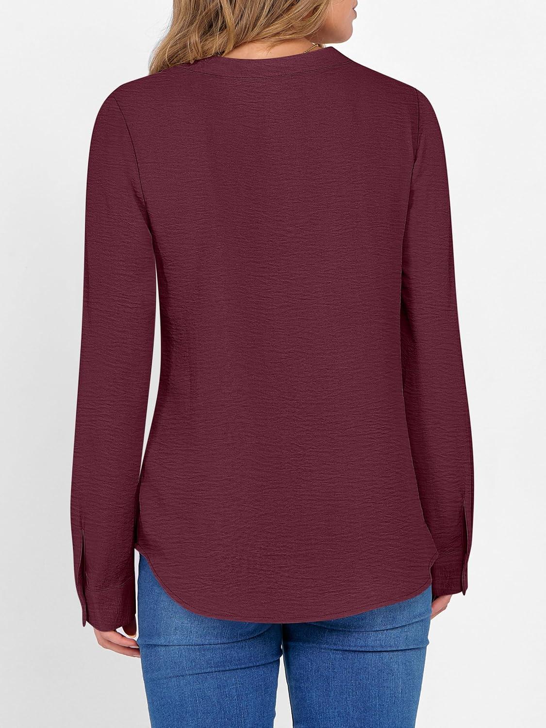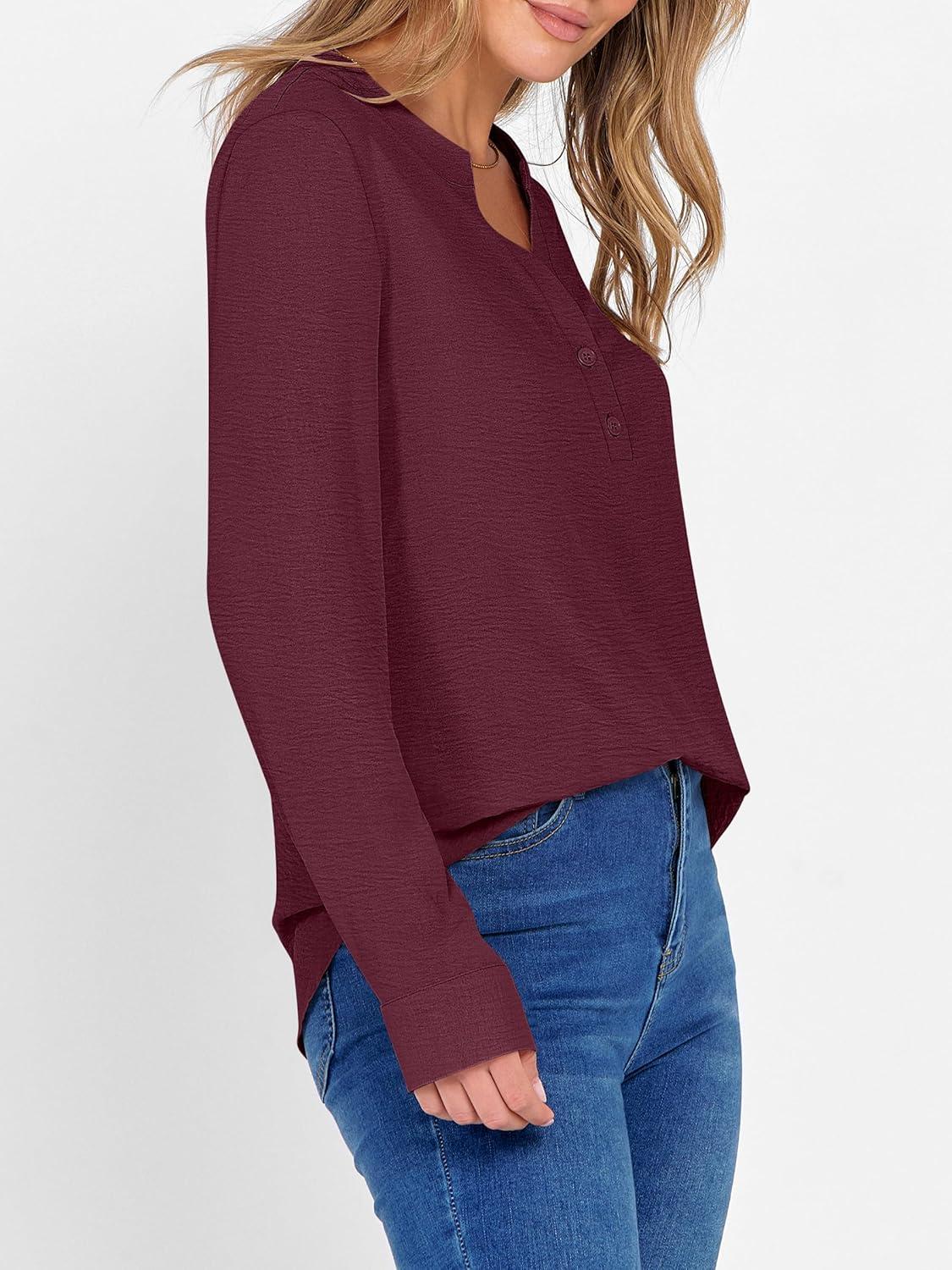 ANRABESS Women’s Long Sleeve Shirts 2025 Fall Henley Business Dressy Casual Tops V Neck Button Down T-Shirts Work Blouses(Wine Red)