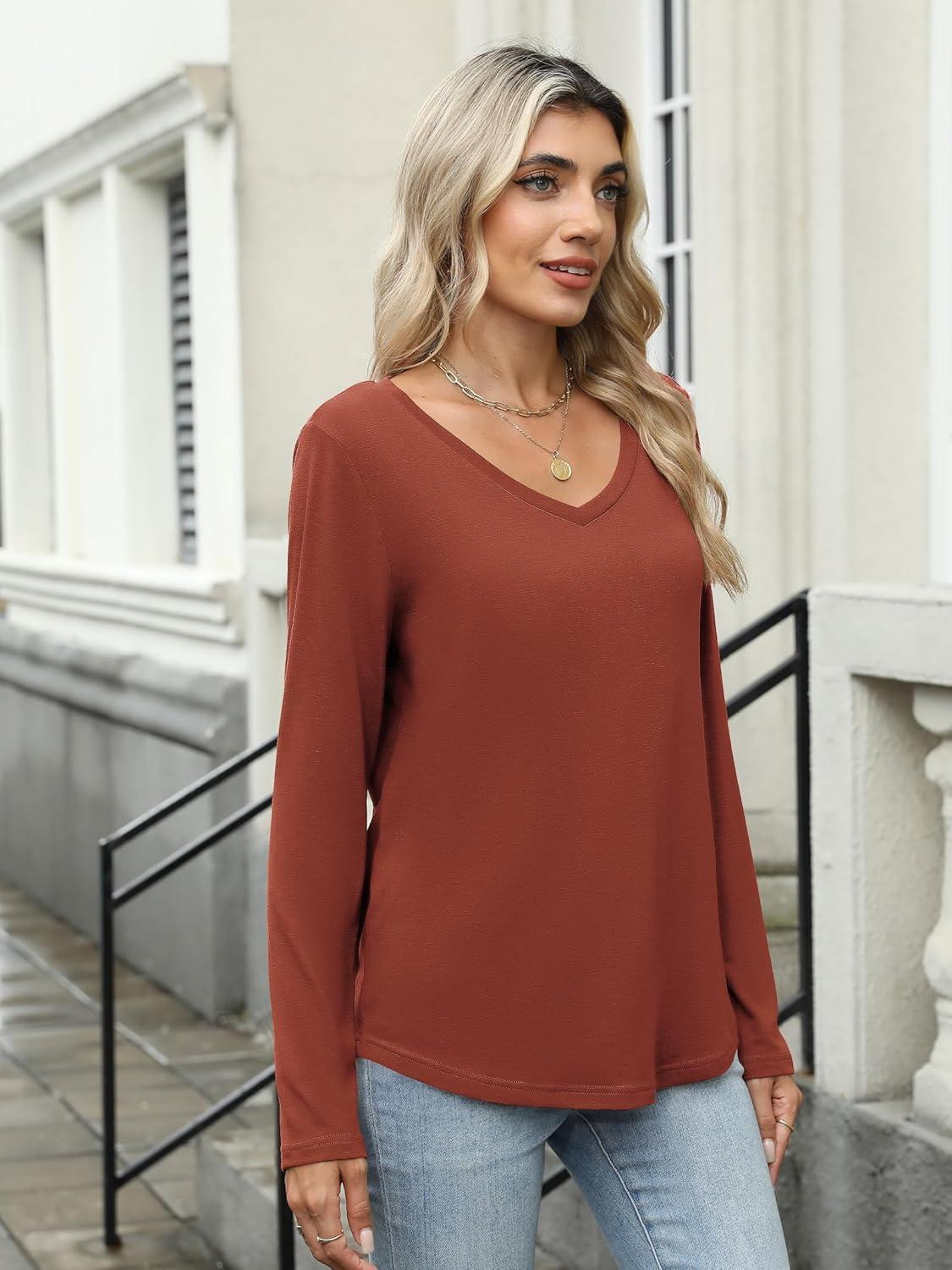Womens Long Sleeve V Neck Shirts Curved Hem Tunic Basic Tops Casual 2025 Trendy Clothes