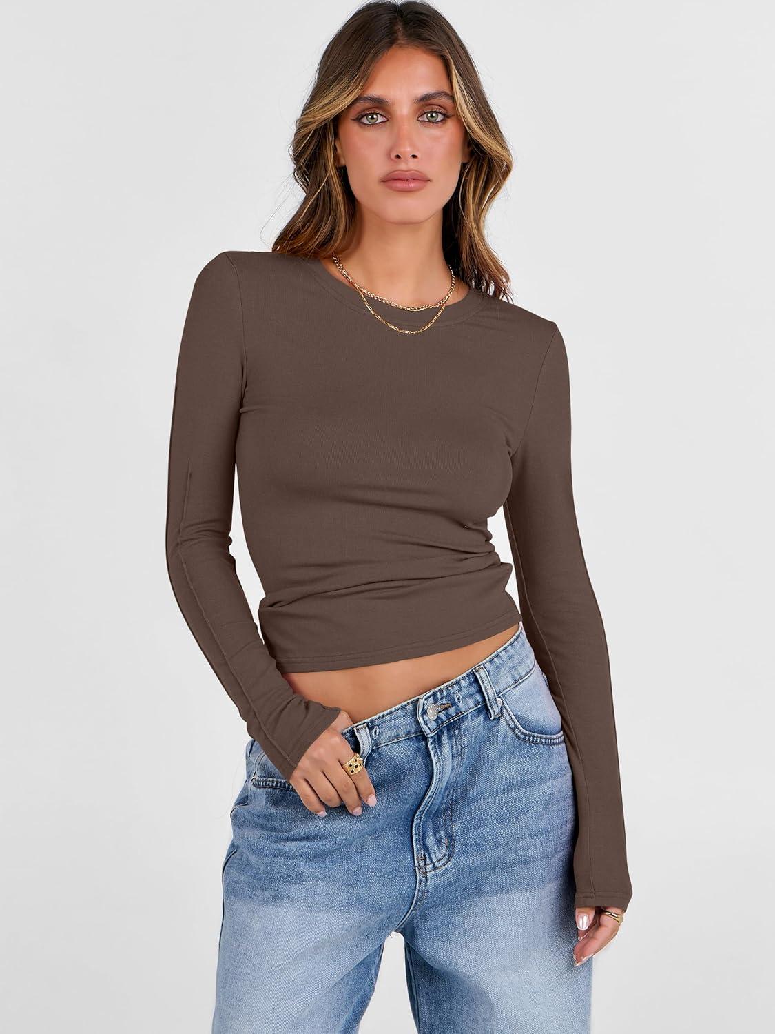 imageANRABESS Womens Long Sleeve Shirts Crew Neck Fitted Knit Casual TShirt Going Out Tops Basic Tees Fall Fashion Outfits 2025Coffee Brown