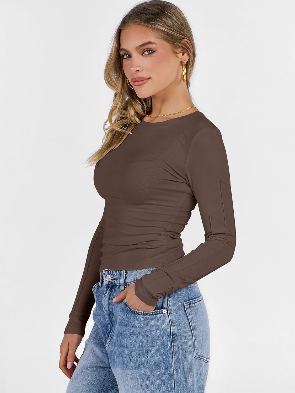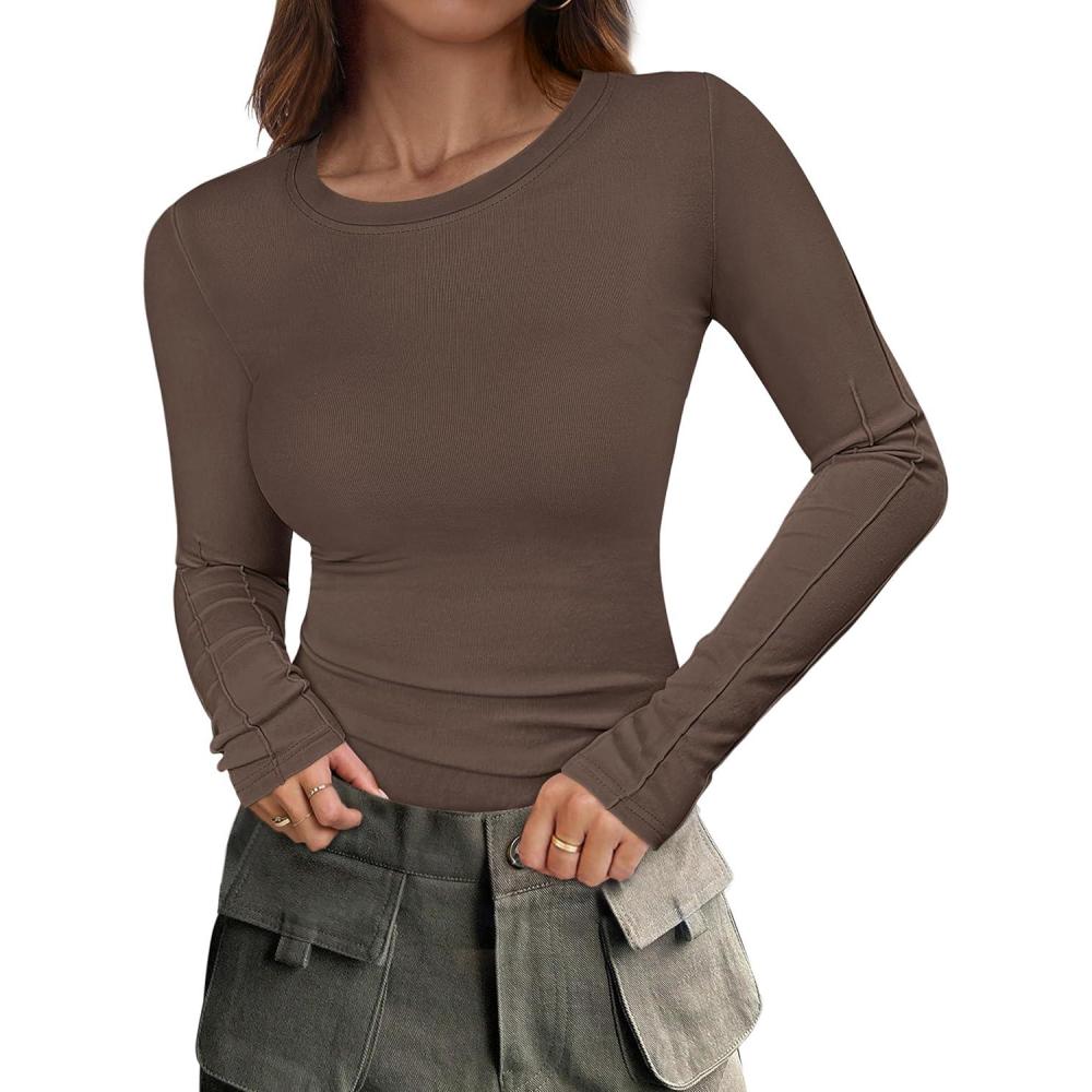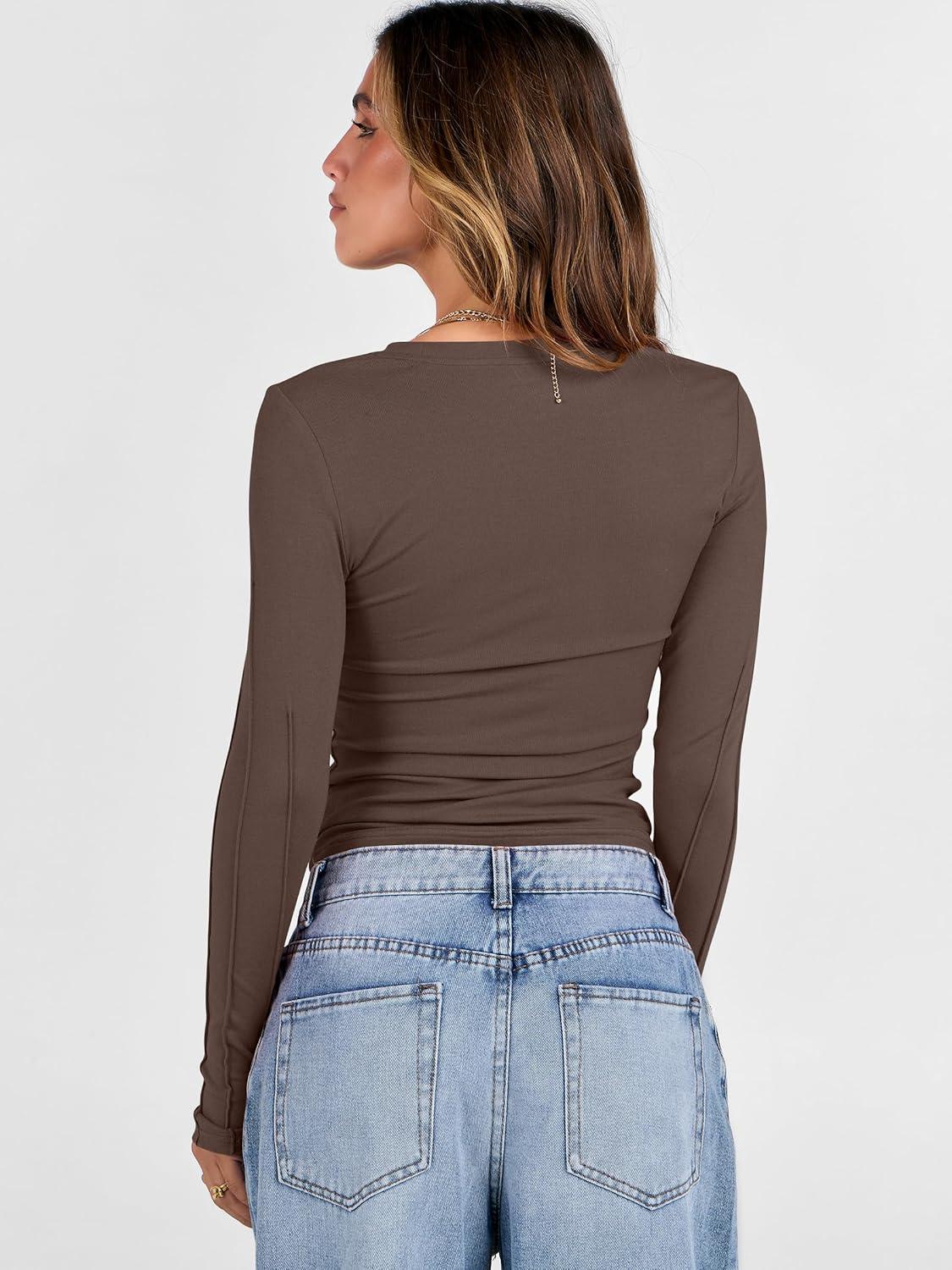 ANRABESS Womens Long Sleeve Shirts Crew Neck Fitted Knit Casual T-Shirt Going Out Tops Basic Tees Fall Fashion Outfits 2025(Coffee Brown)