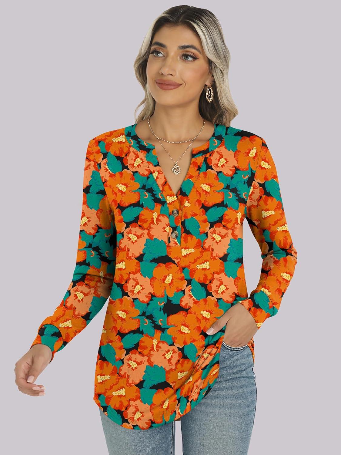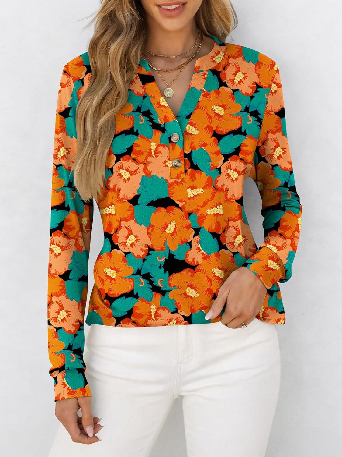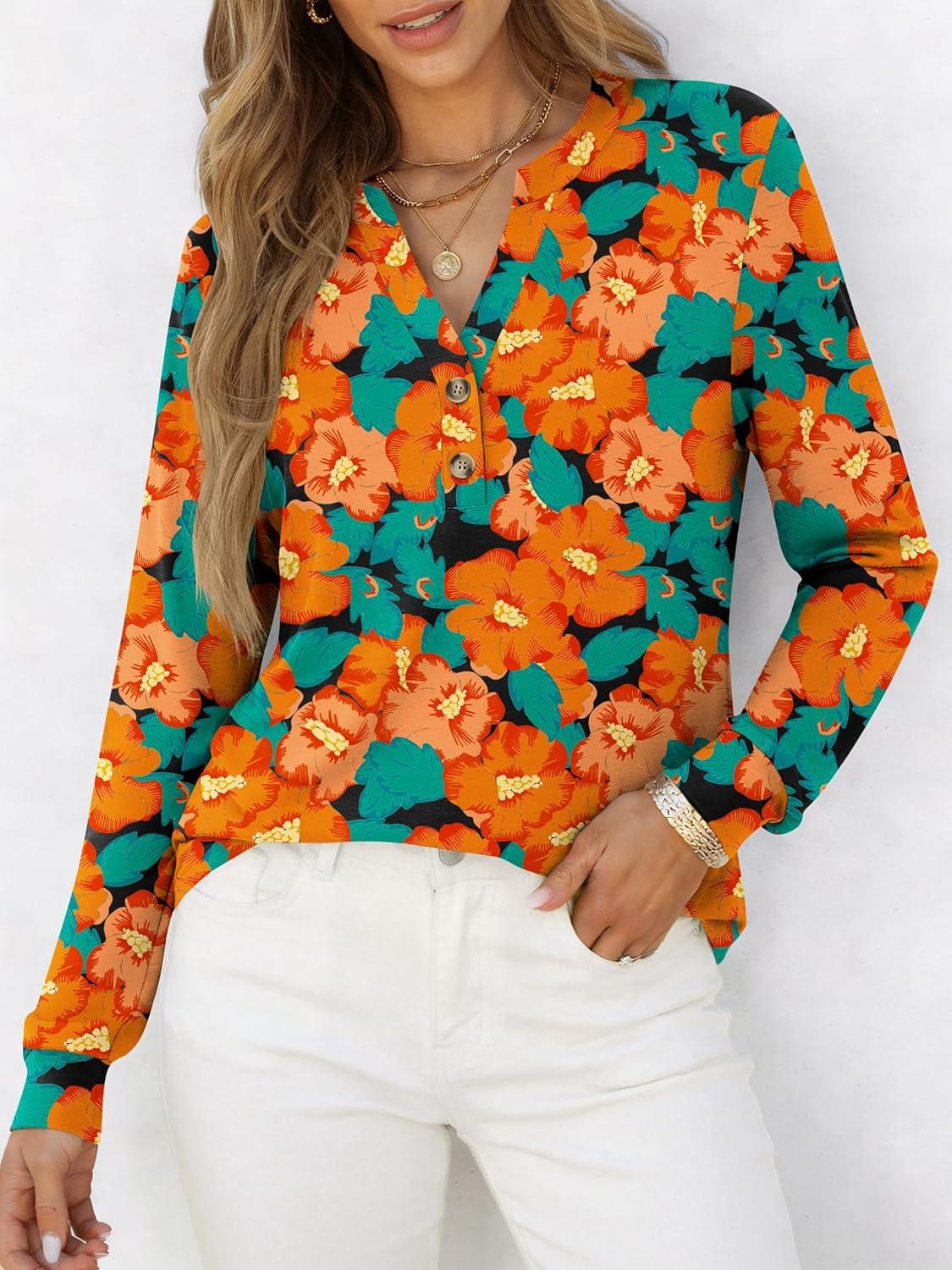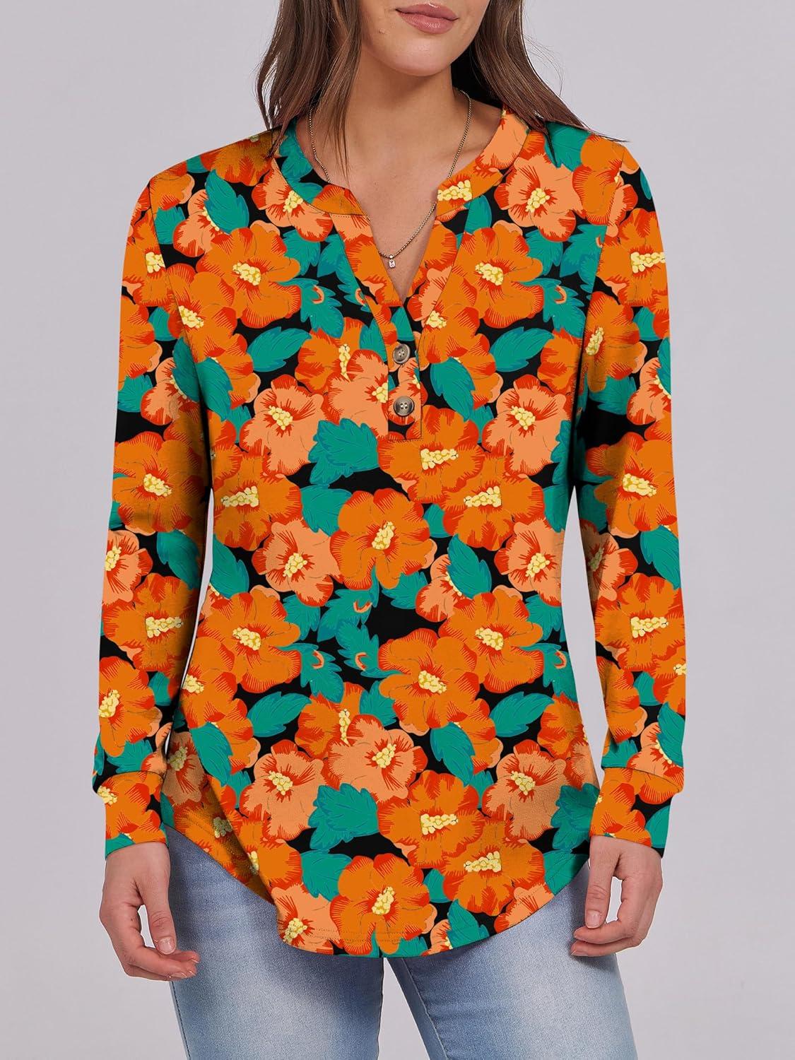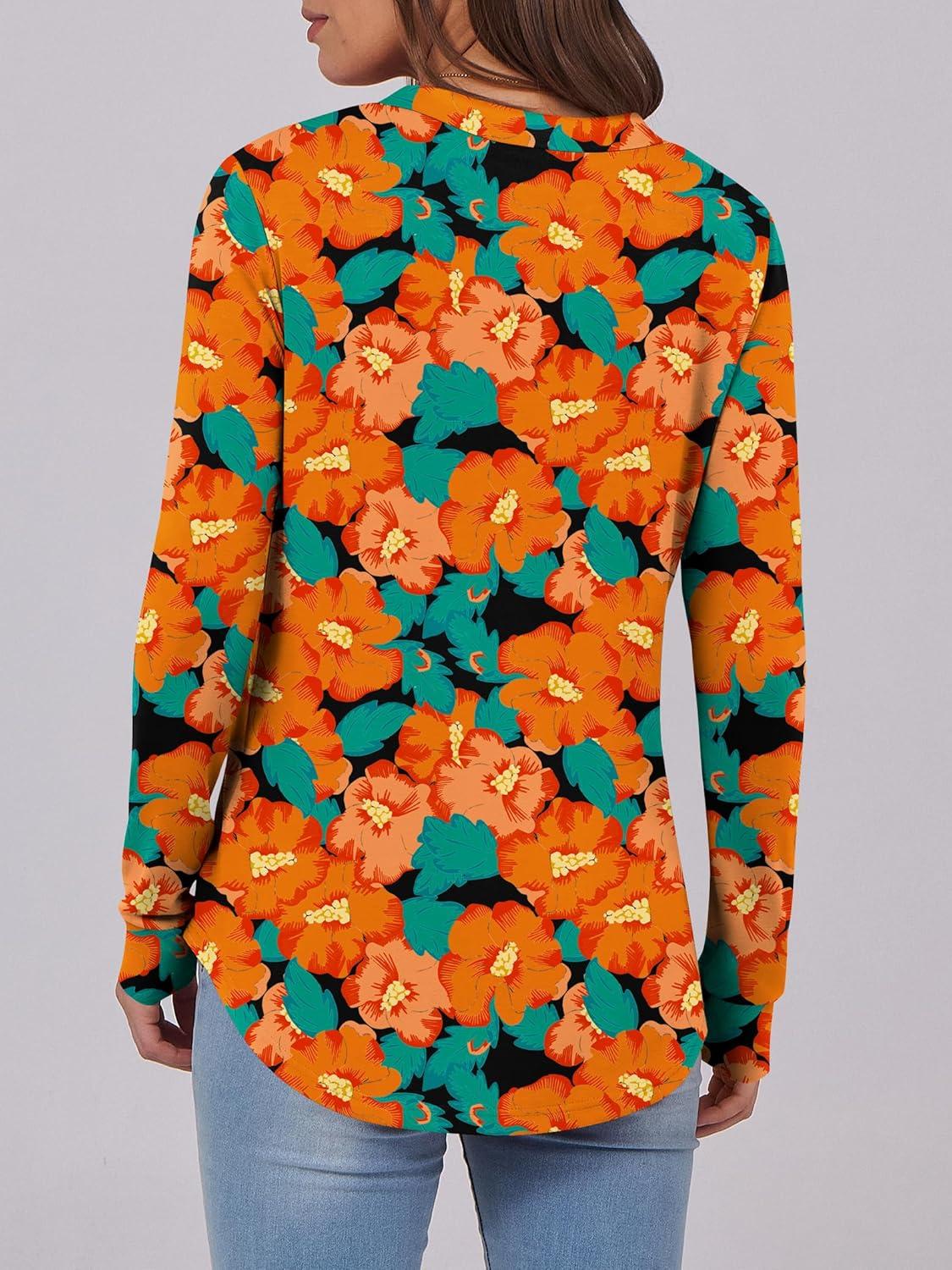 ANRABESS Women's Long Sleeve Shirts Henley Tops Dressy Casual Blouse Trendy 2025 Fall Clothes Spring Vacation Outfits(Teal Orange Floral)