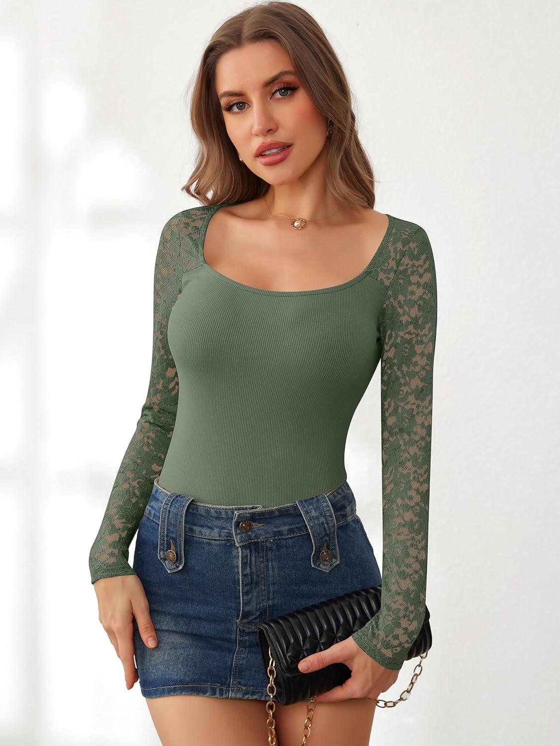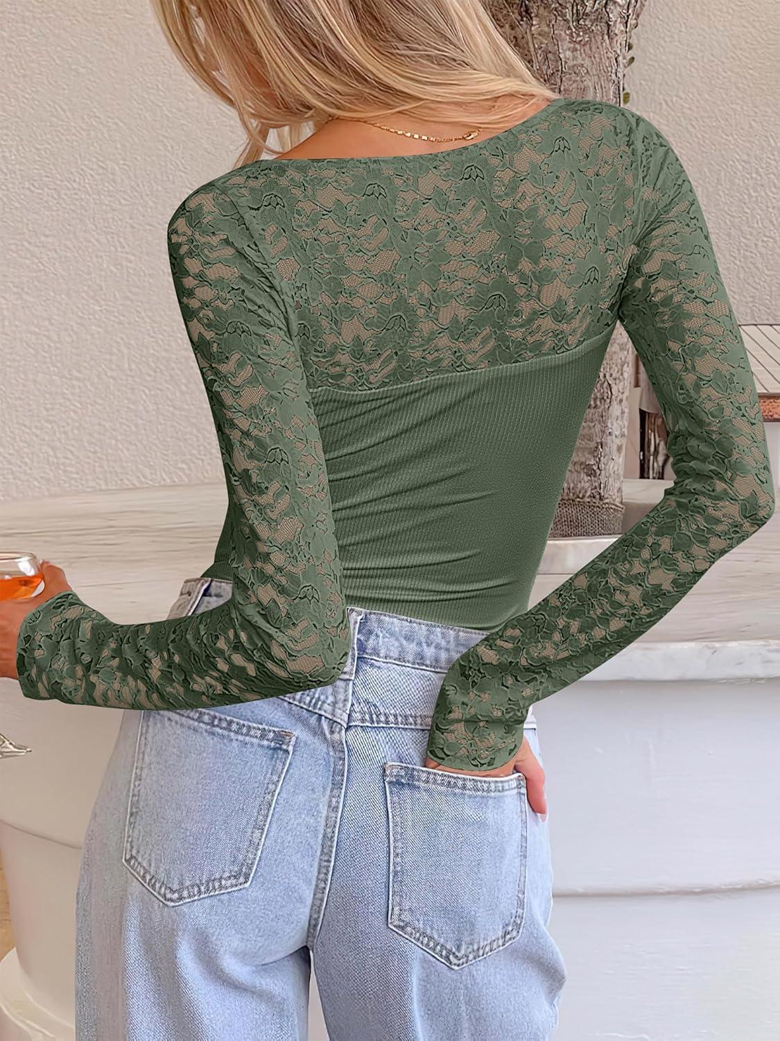 ANRABESS Womens Long Sleeve Shirts Scoop Neck Lace Going Out Tops Slim Fit Rib Knit Casual Blouses 2025 Fall Fashion Outfits(Sage Green)