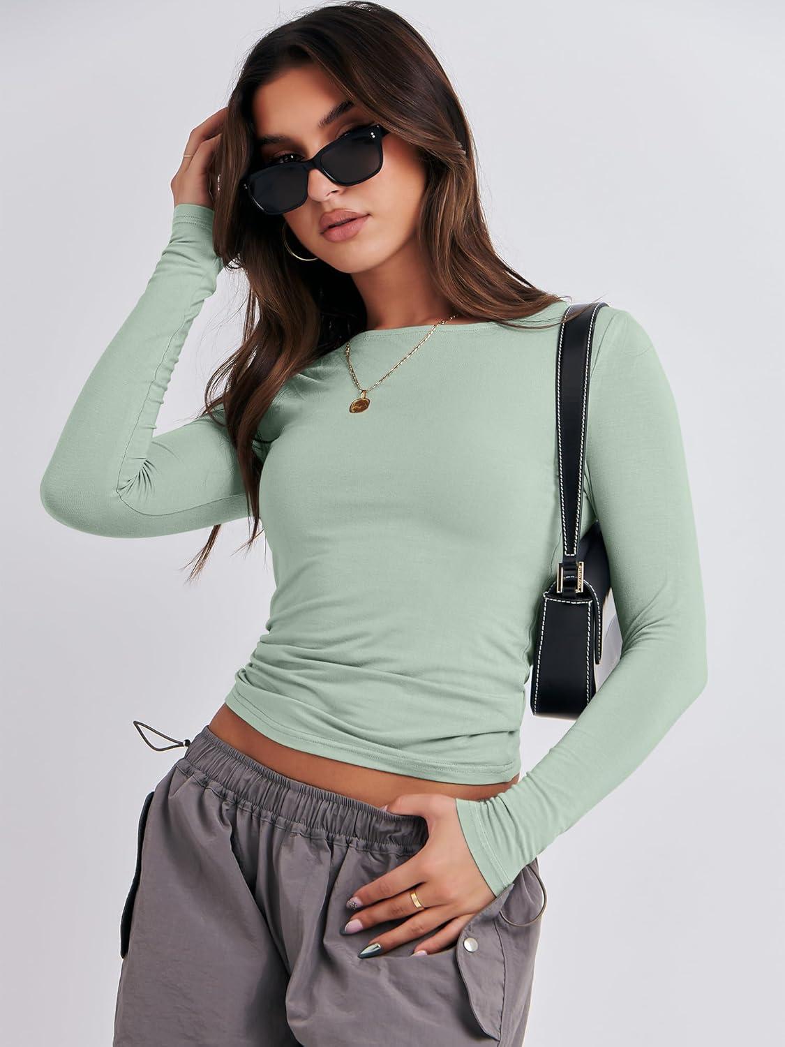 imageANRABESS Womens Long Sleeve Shirts Tight Fitted Going Out Crop Tops Crewneck Basic Tee Y2k Fall Outfits Teens Girls ClothesLight Green