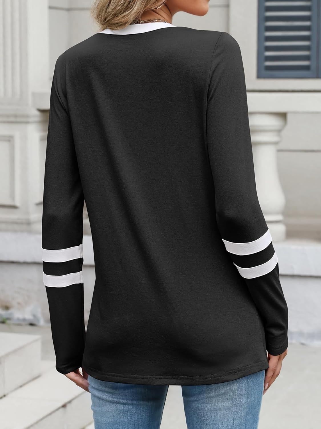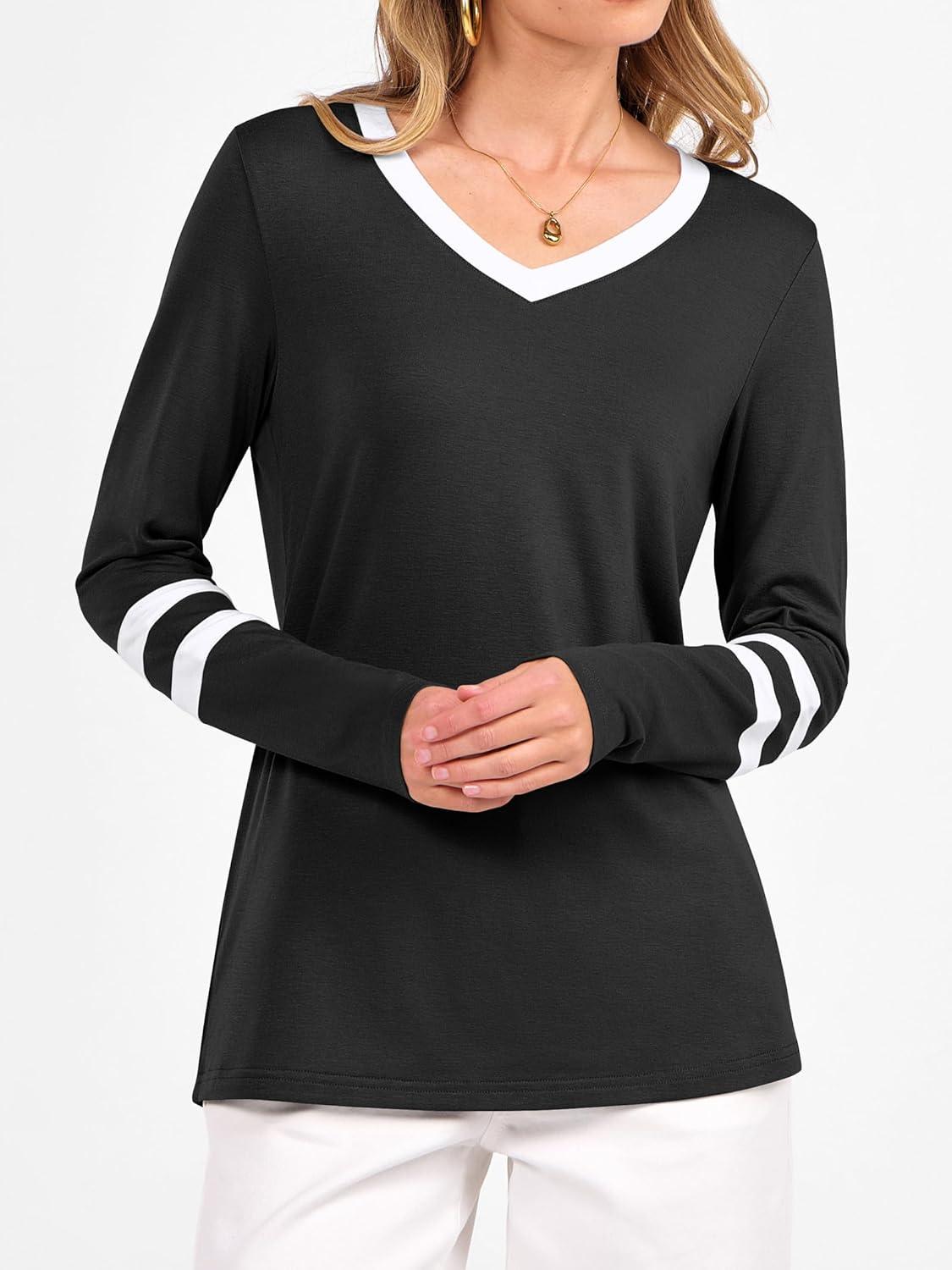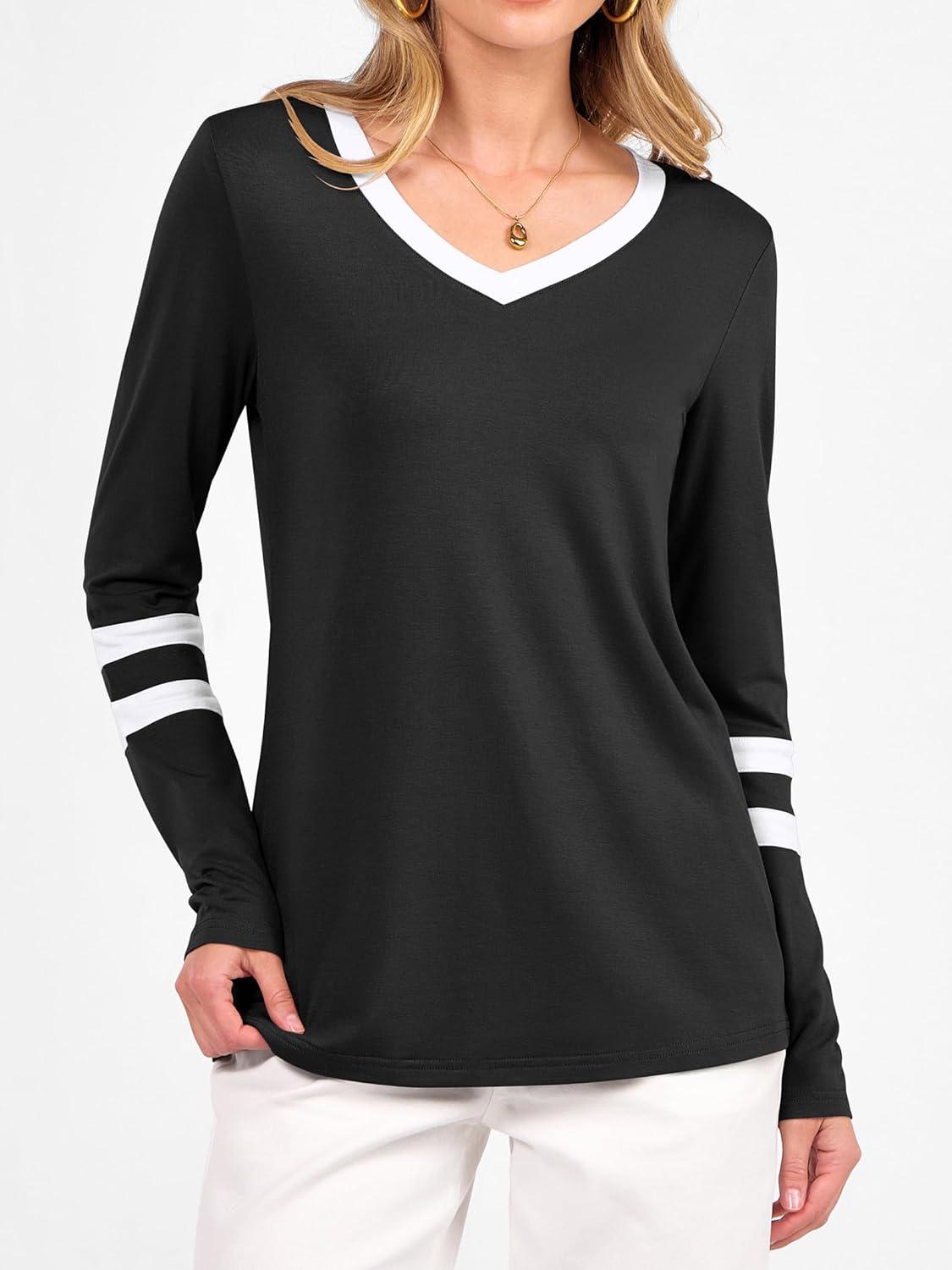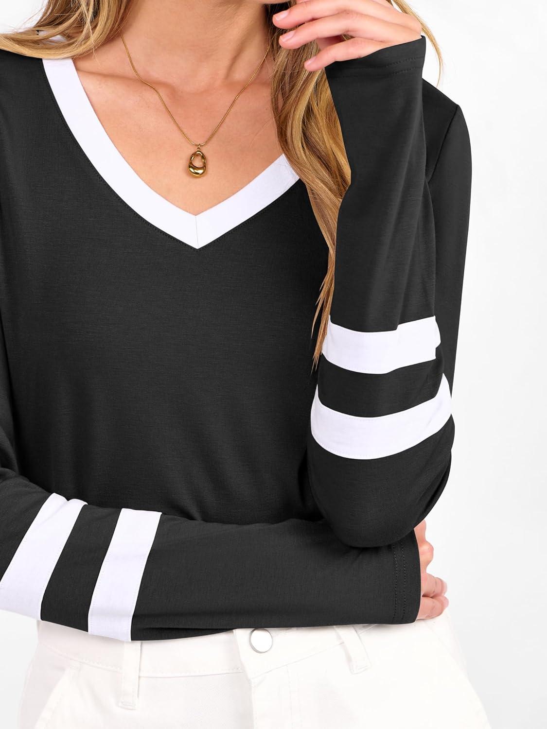 ANRABESS Womens Long Sleeve Shirts V Neck Color Block Basic Tshirt 2025 Fall Casual Striped Tee Tunics Tops Trendy Outfits(Black)