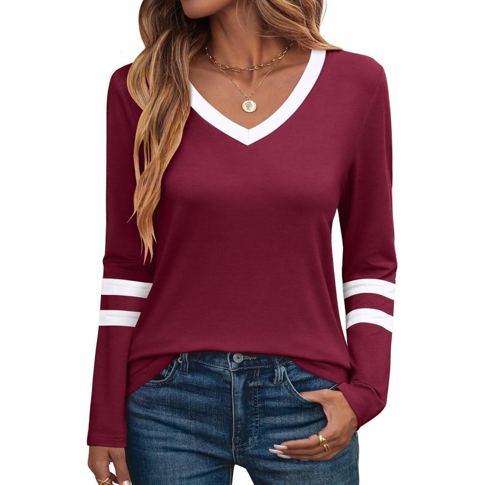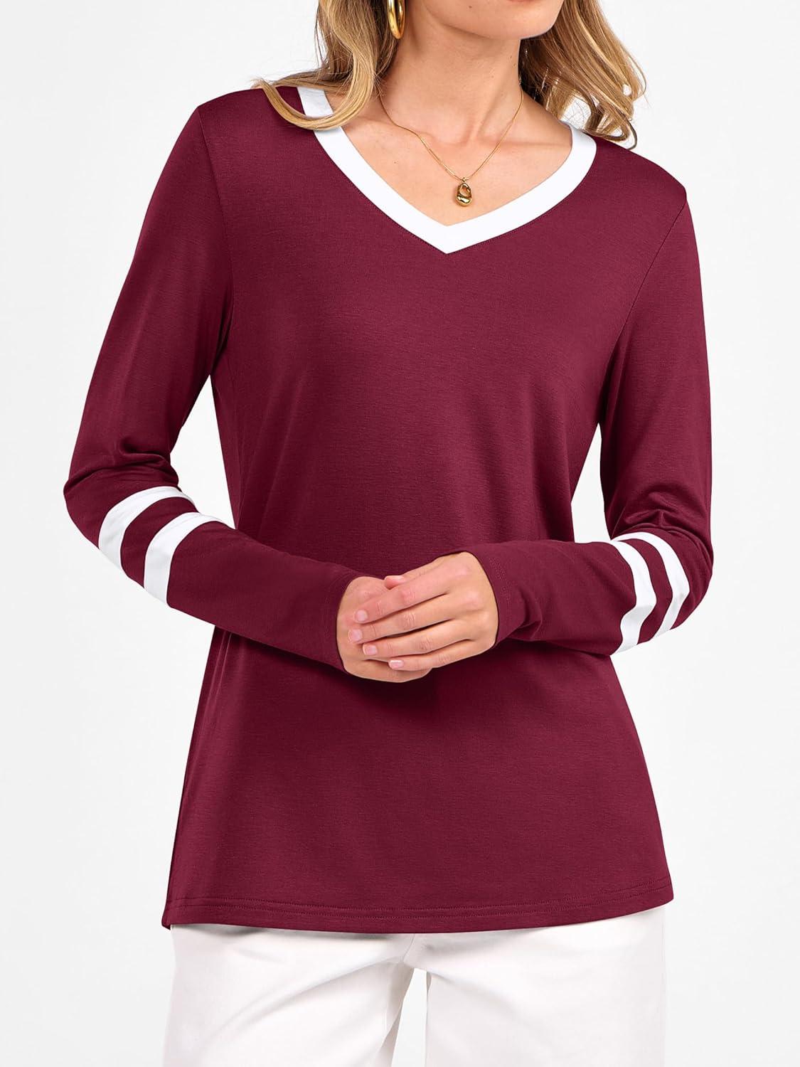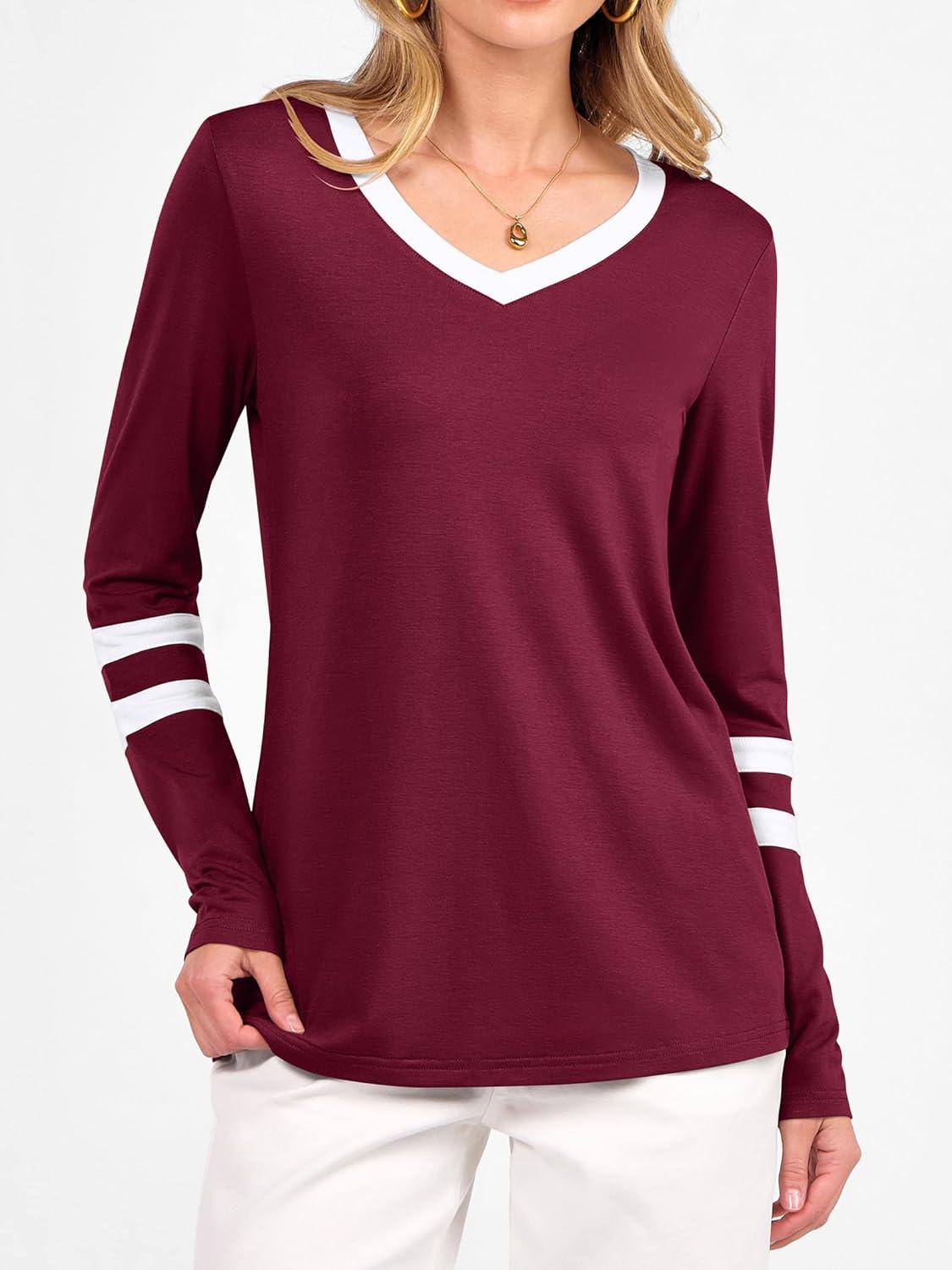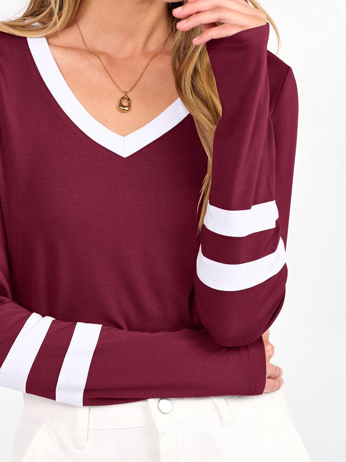 ANRABESS Womens Long Sleeve Shirts V Neck Color Block Basic Tshirt 2025 Fall Casual Striped Tee Tunics Tops Trendy Outfits(Burgundy)