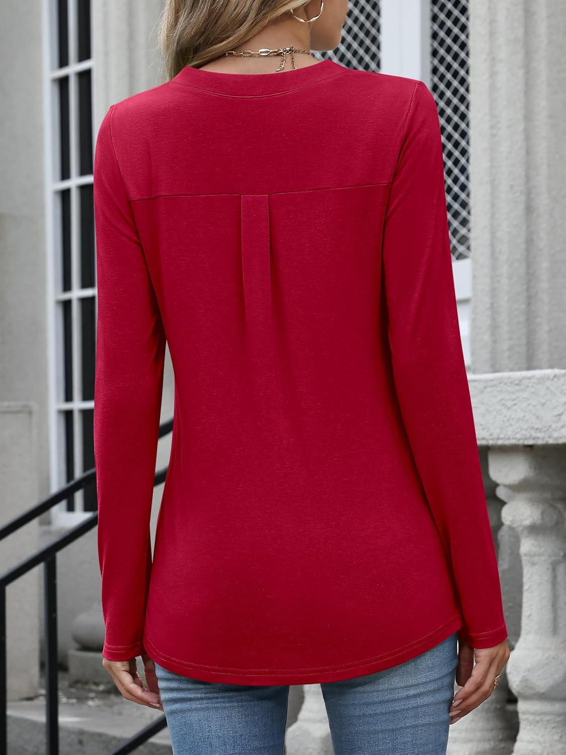 ANRABESS Womens Long Sleeve Shirts V Neck Dressy Casual Blouse Lightweight Tunic Tops 2025 Fall Outfits Trendy Clothes(Red)