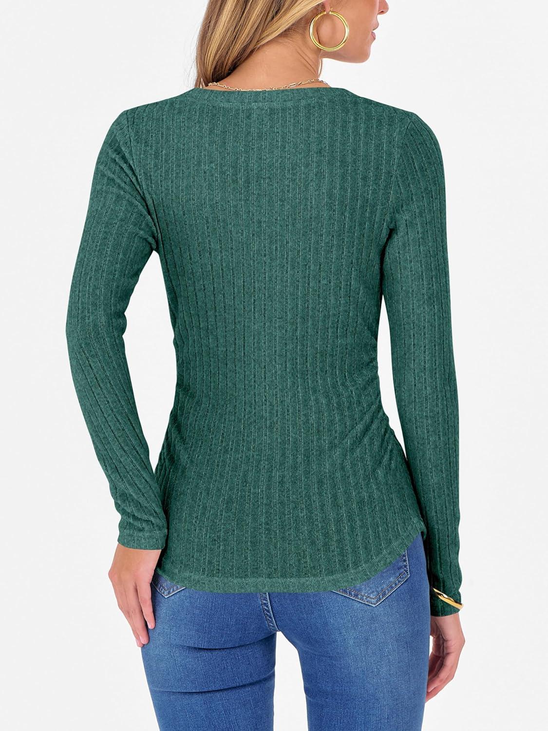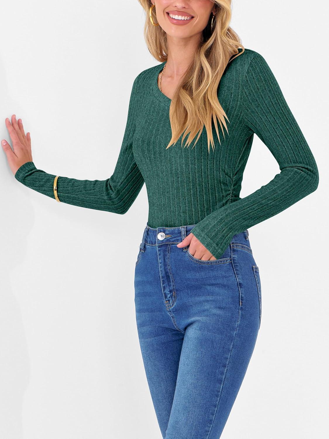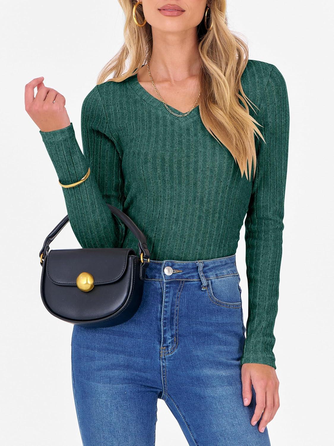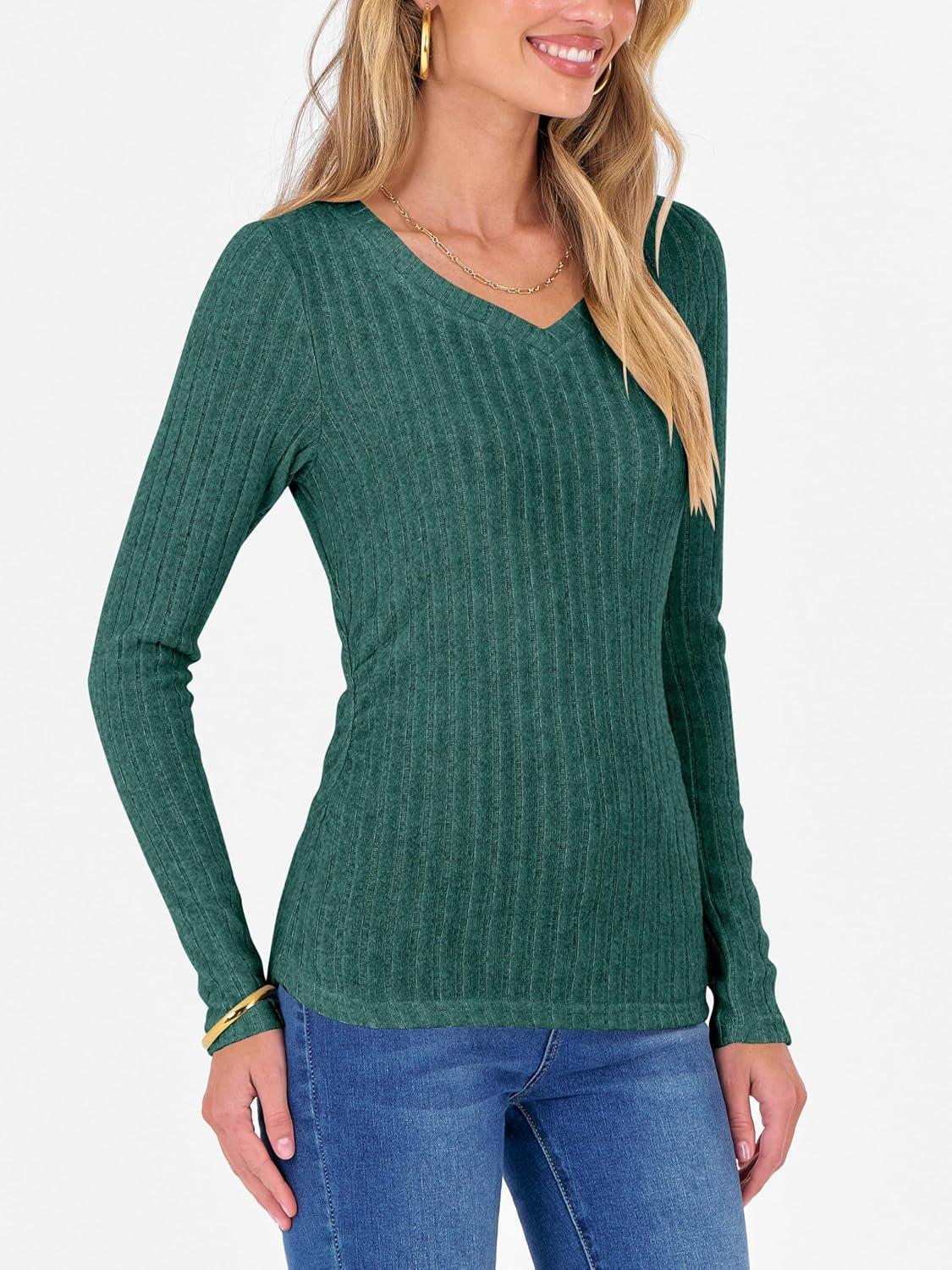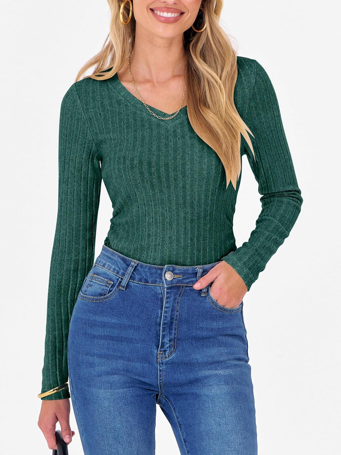 ANRABESS Womens Long Sleeve Shirts V Neck Ribbed Knit Slim Fit Lightweight Sweater 2025 Fall Dressy Casual Travel Work Tops(Deep Green)