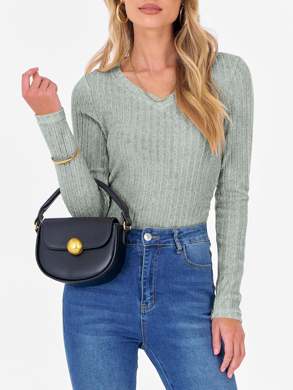 ANRABESS Womens Long Sleeve Shirts V Neck Ribbed Knit Slim Fit Lightweight Sweater 2025 Fall Dressy Casual Travel Work Tops(Light Green)